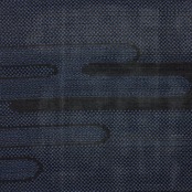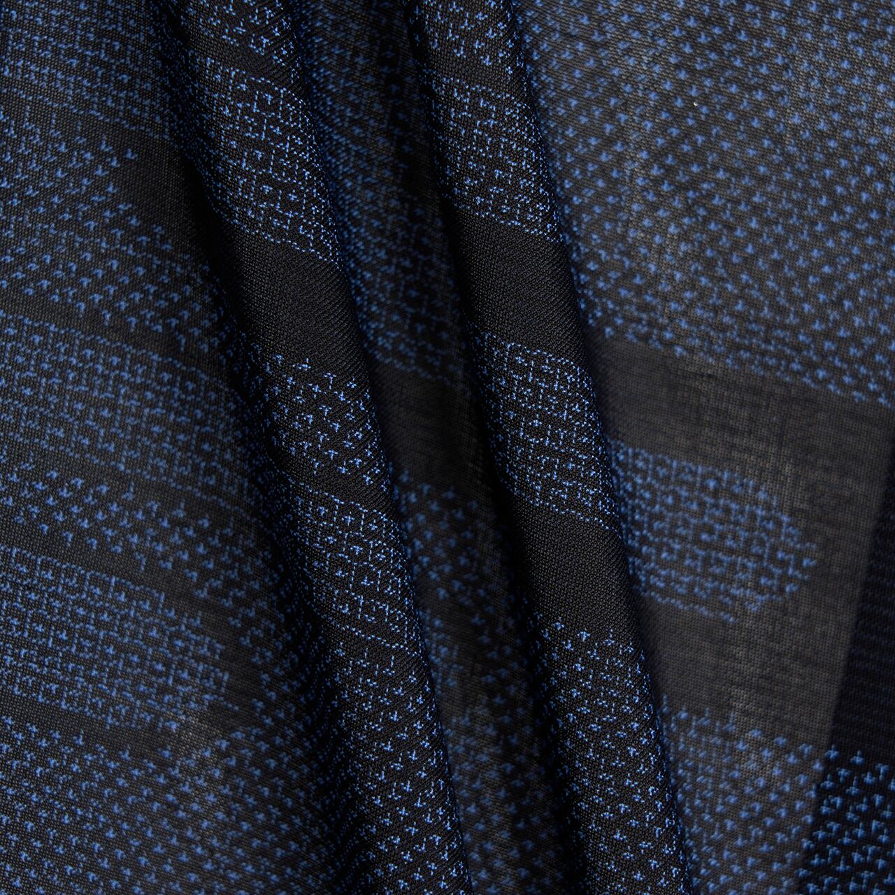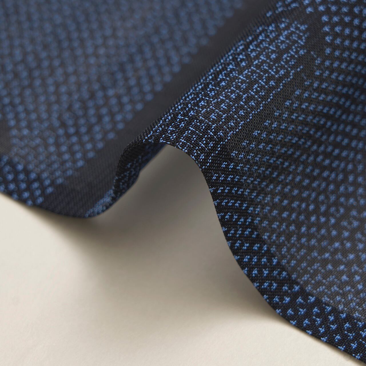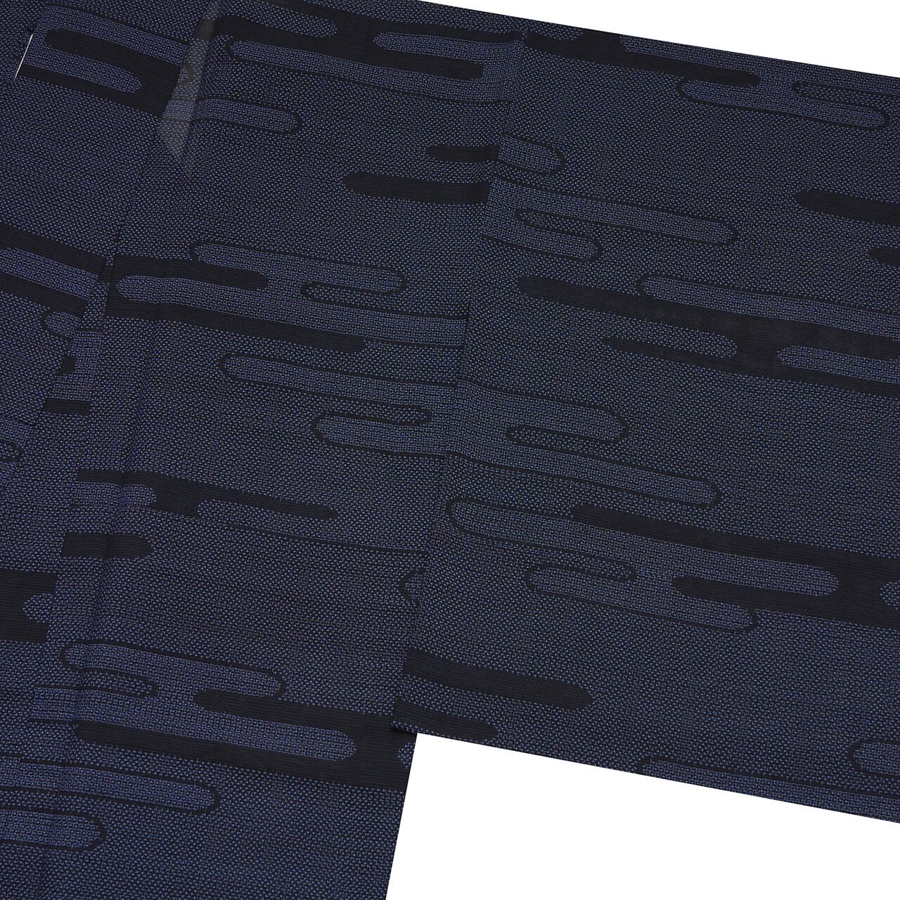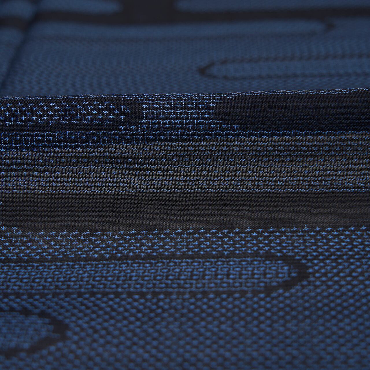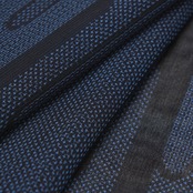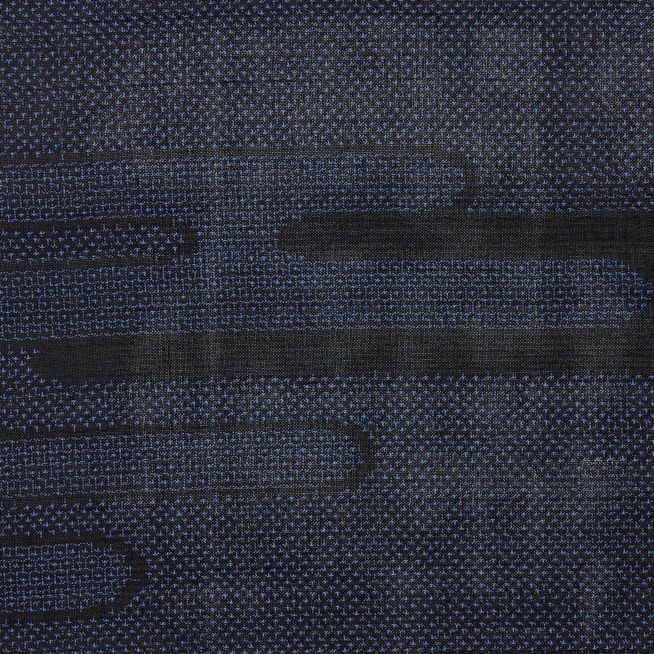 こちらは黒に近い濃い藍色の地に、びっしりと小さなカ絣が織り出されたところにエ霞が取られ、それもやはり小さな亀甲絣でうめられたり、地と同じ藍の無地で表されたりして、流れるようななめらかな雰囲気の模様となっています。