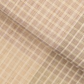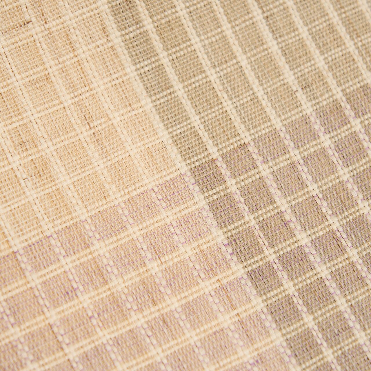 自然の麻の色と思われる優しいベージュ・亜麻色の地に、縦にはお太鼓の右側の3分の1くらいの幅に、少し緑味のあるベージュ・灰汁色の縞が、横には段変わりに胡桃染色の縞が織り込まれ、全体には象牙色の糸で小格子が織り込まれて変り格子の模様となった、やさしい色合いの涼しそうな麻の夏の八寸名古屋帯です。