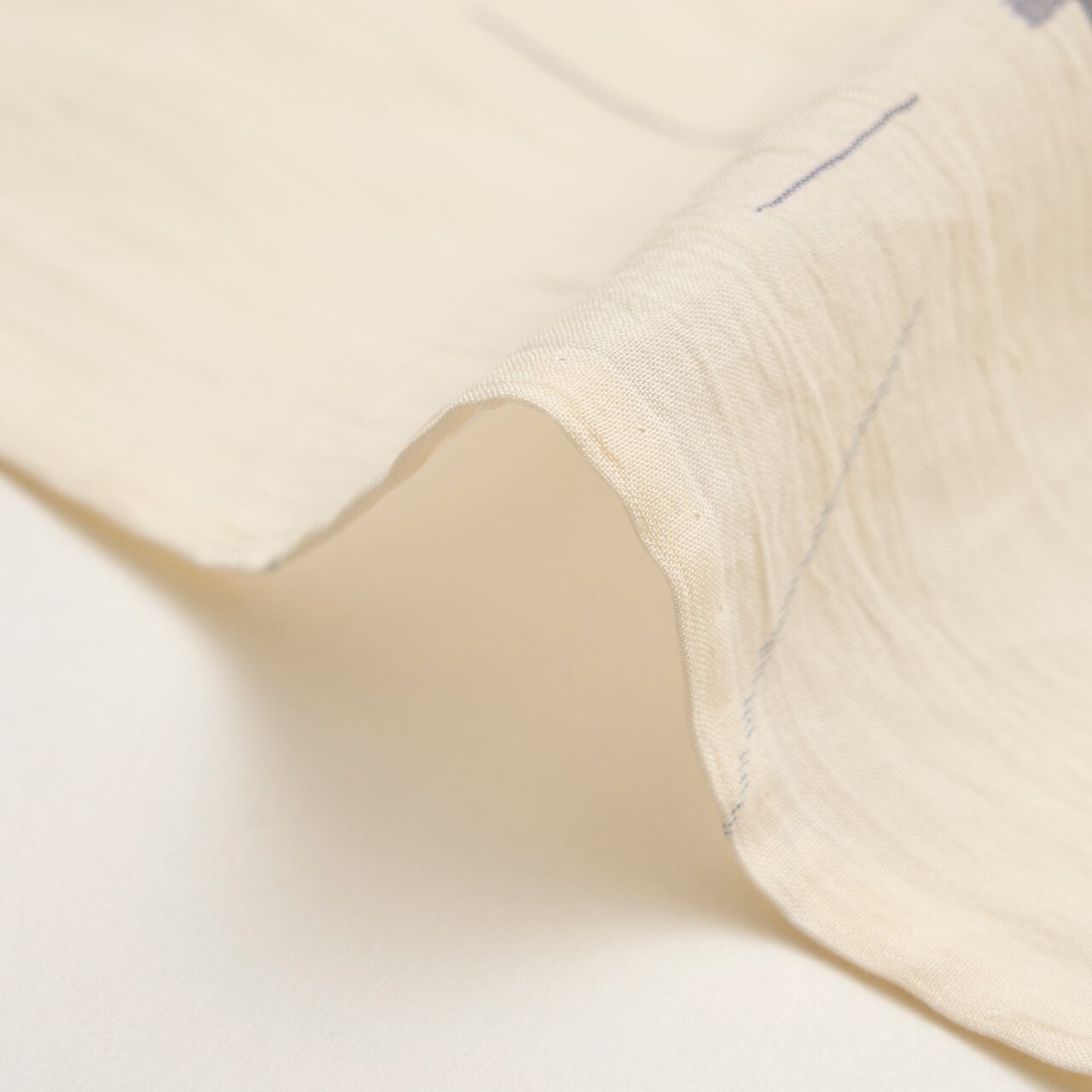 同じ小千谷ちぢみでも、樋口さんの作品はシボがあまり大きくなく、しっとりとしなやかな質感ですが、とても綺麗な象牙色の無地部分が多いこちらのお着物は、それはまた透明感が程よくてとても美しく、キラ星のように散らされた絣の模様が可愛らしいアクセントとなって素敵な佇まいとなっています。