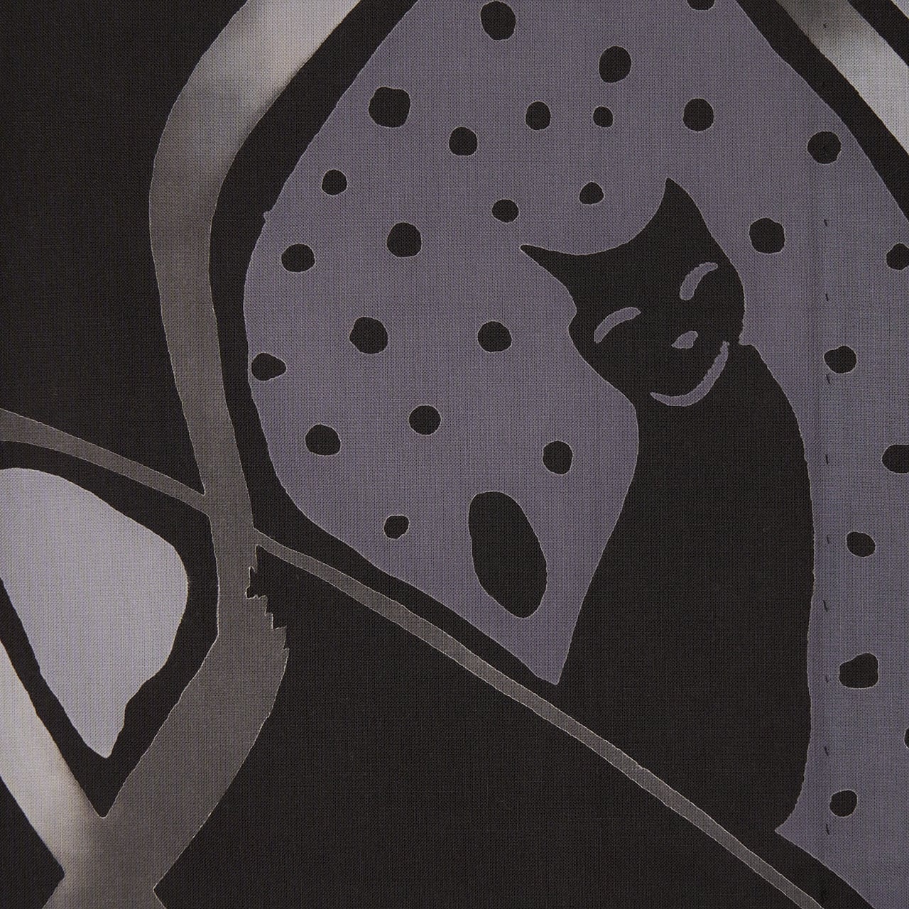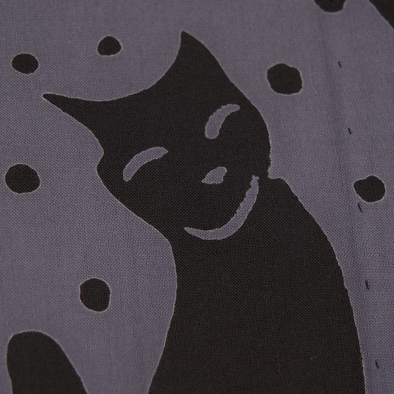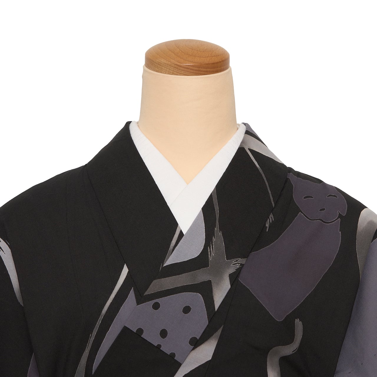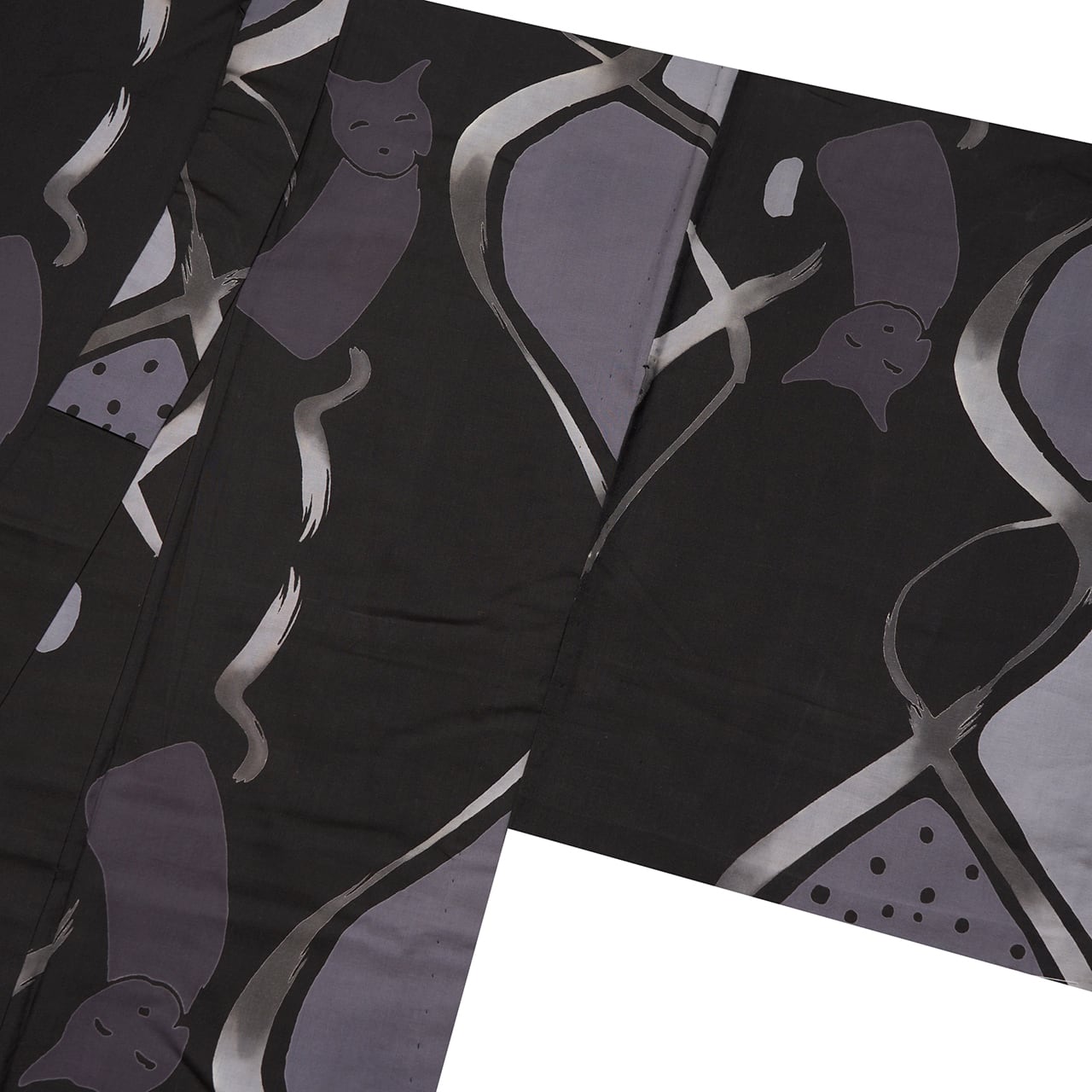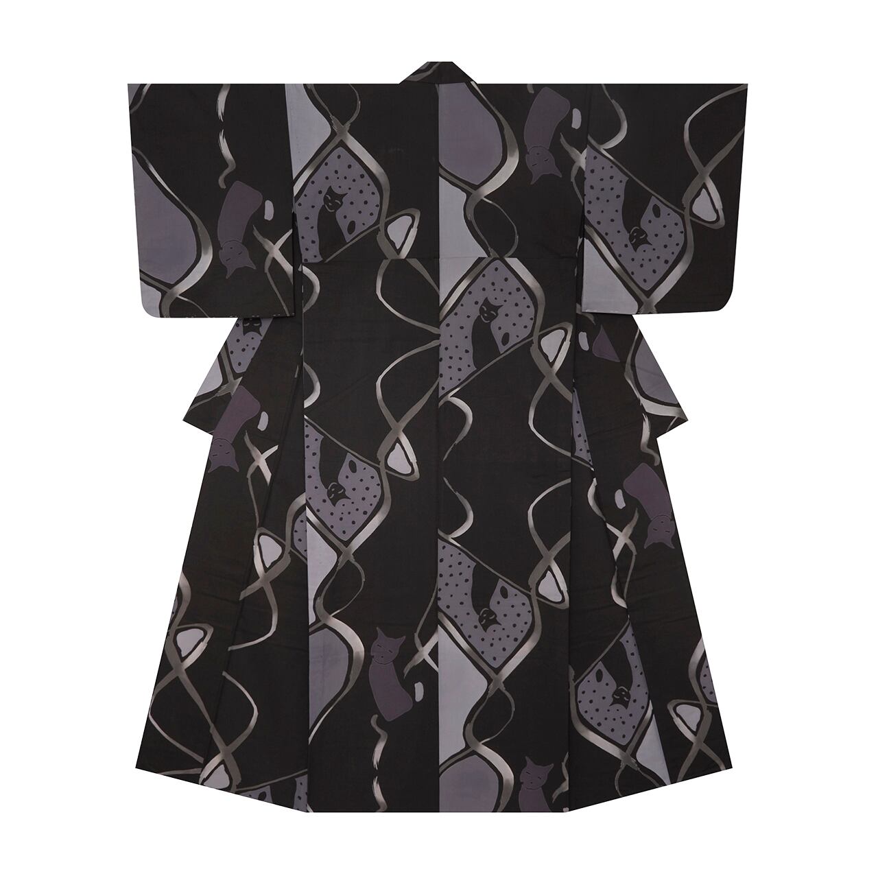 さらりとした上質な風合いの木綿の生地が黒に染められ、リボンのような、細い紐のような立涌の模様と、その中には濃いグレー・鈍色に水玉の模様が描かれ、笑っているような表情の黒いネコちゃんが佇んで、立涌の外にも濃いグレー・灰色のネコちゃんが描かれた、モノトーンの色使いがお洒落な雰囲気の素敵な浴衣です。