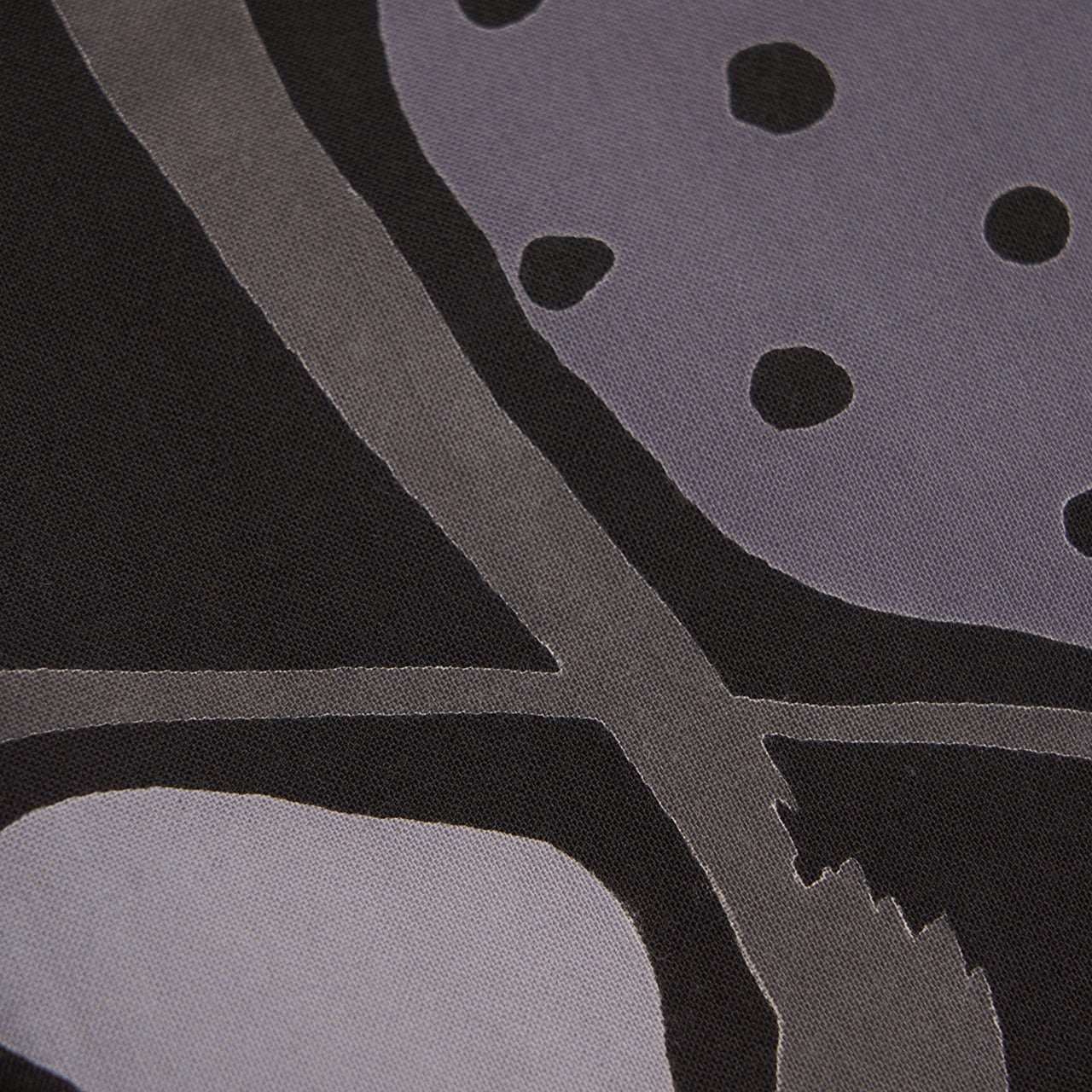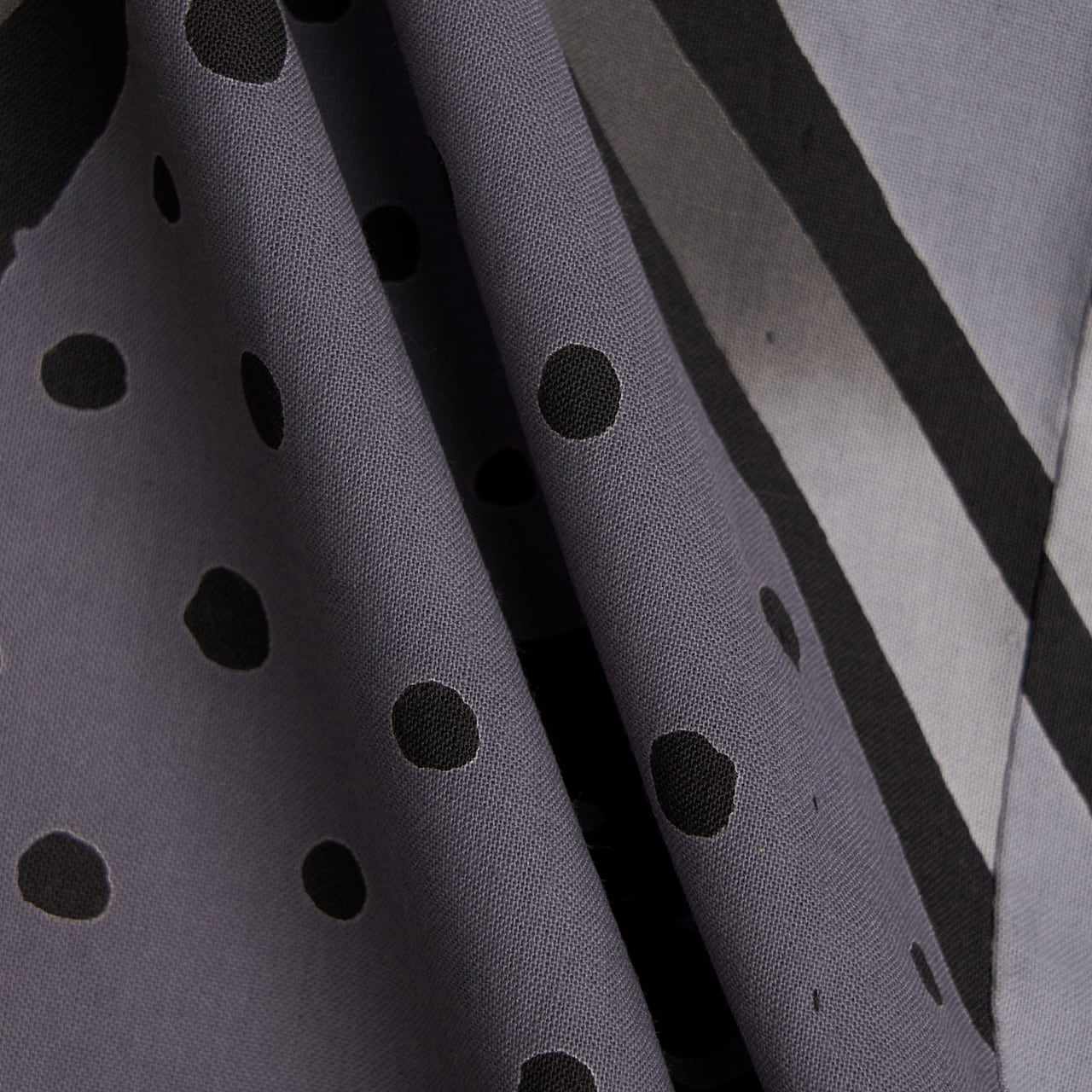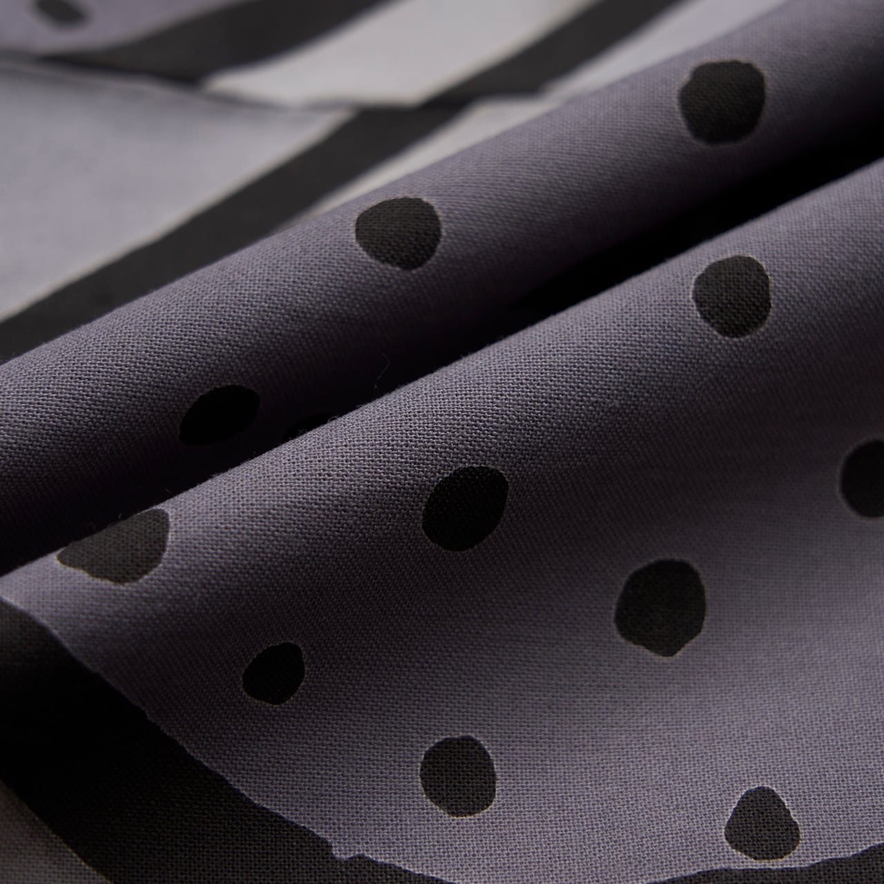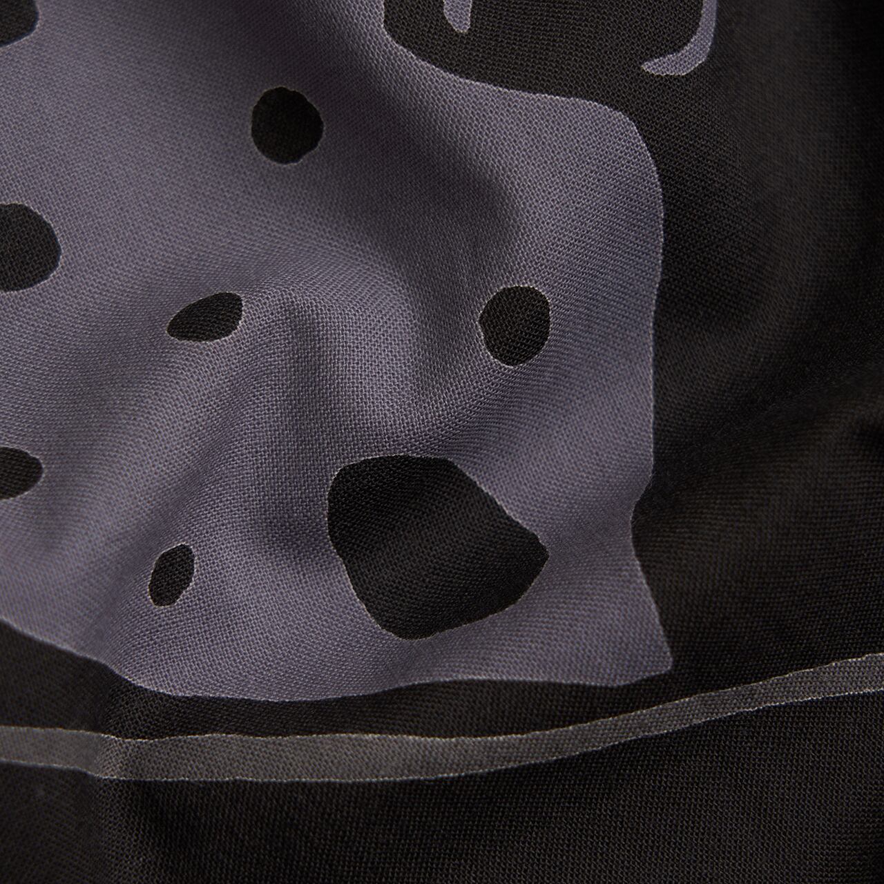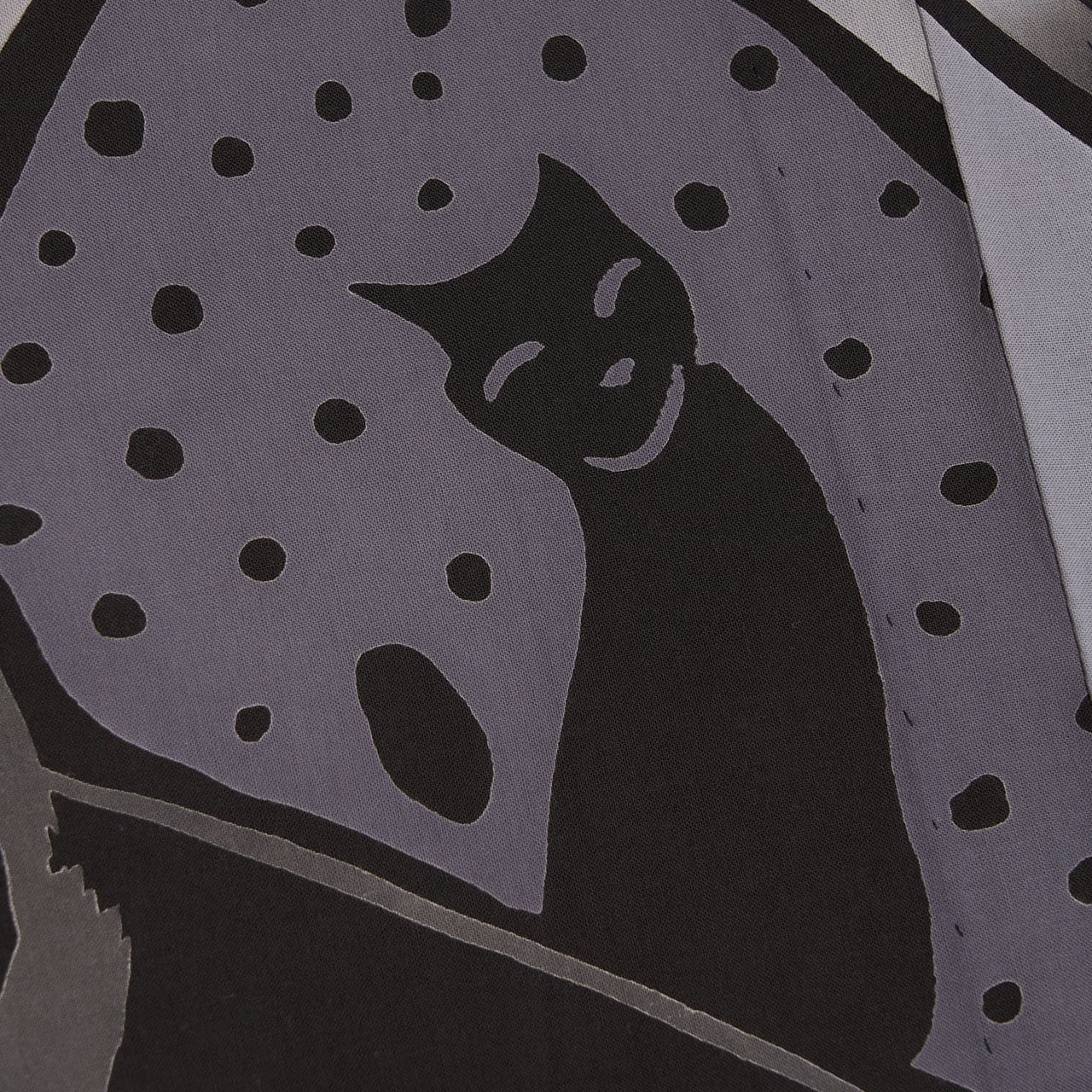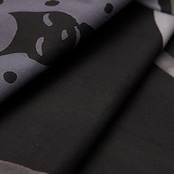 さらりとした上質な風合いの木綿の生地が黒に染められ、リボンのような、細い紐のような立涌の模様と、その中には濃いグレー・鈍色に水玉の模様が描かれ、笑っているような表情の黒いネコちゃんが佇んで、立涌の外にも濃いグレー・灰色のネコちゃんが描かれた、モノトーンの色使いがお洒落な雰囲気の素敵な浴衣です。