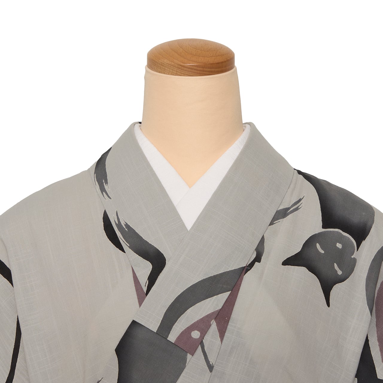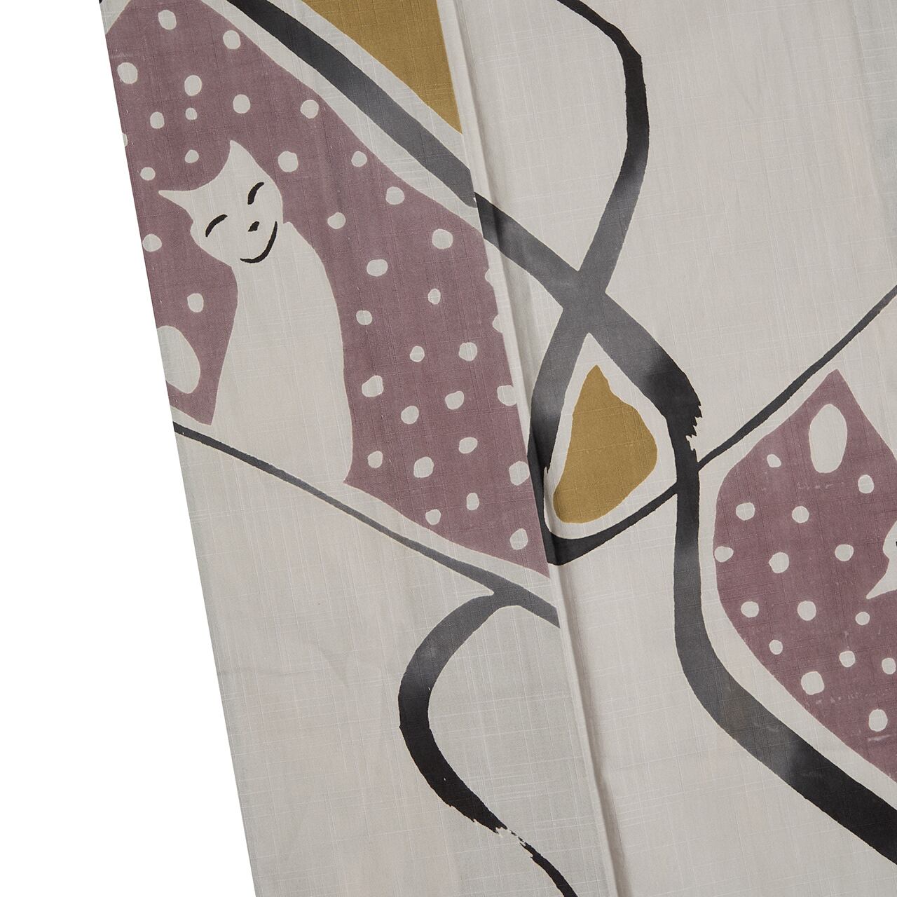 地模様のようにランダムな格子の模様が織り込まれた木綿の生地が淡いグレー・銀鼠色に染められ、リボンのような、細い紐のような立涌の模様と、その中には赤味のある紫・浅紫に水玉の模様が描かれ、笑っているような表情の黒いネコちゃんが佇んで、立涌の外にも濃いグレー・灰色に濃い藍墨茶色の縁取りをされたネコちゃんが描かれた、優しい色使いがお洒落な雰囲気の素敵な浴衣です。