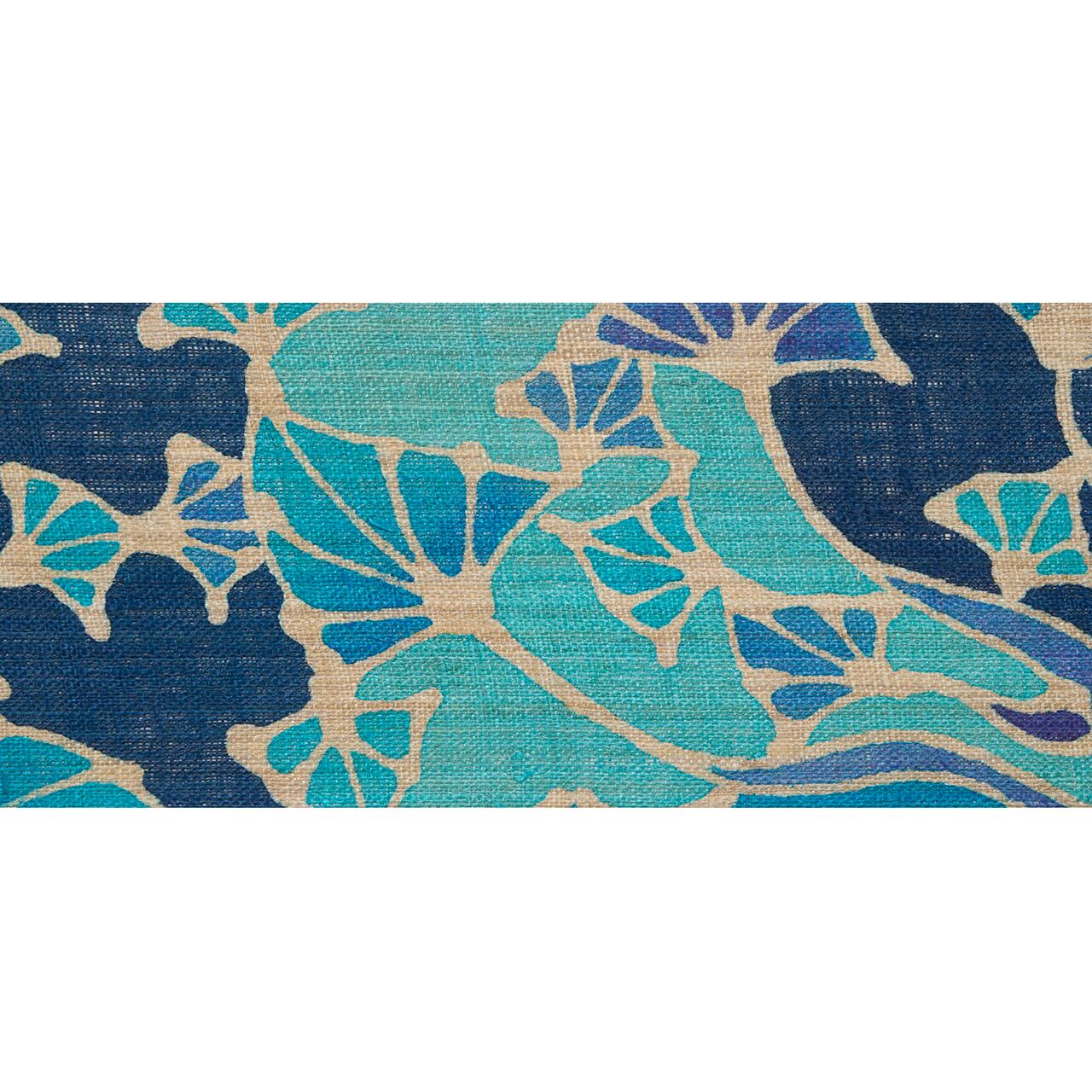経緯とも、手績みの苧麻ではなく大麻と思われる少し太めの麻の糸で織られた生地に、手描きのロウケツ染めで勢いよく枝を広げてお花を咲かせた植物の模様が描かれ、その隙間が浅葱色や藍色、褐返色、褐色などの濃い藍色から明るい青までの色で色付けされた、手描きのタッチの臨場感がとても素敵に感じられる夏の九寸名古屋帯です。