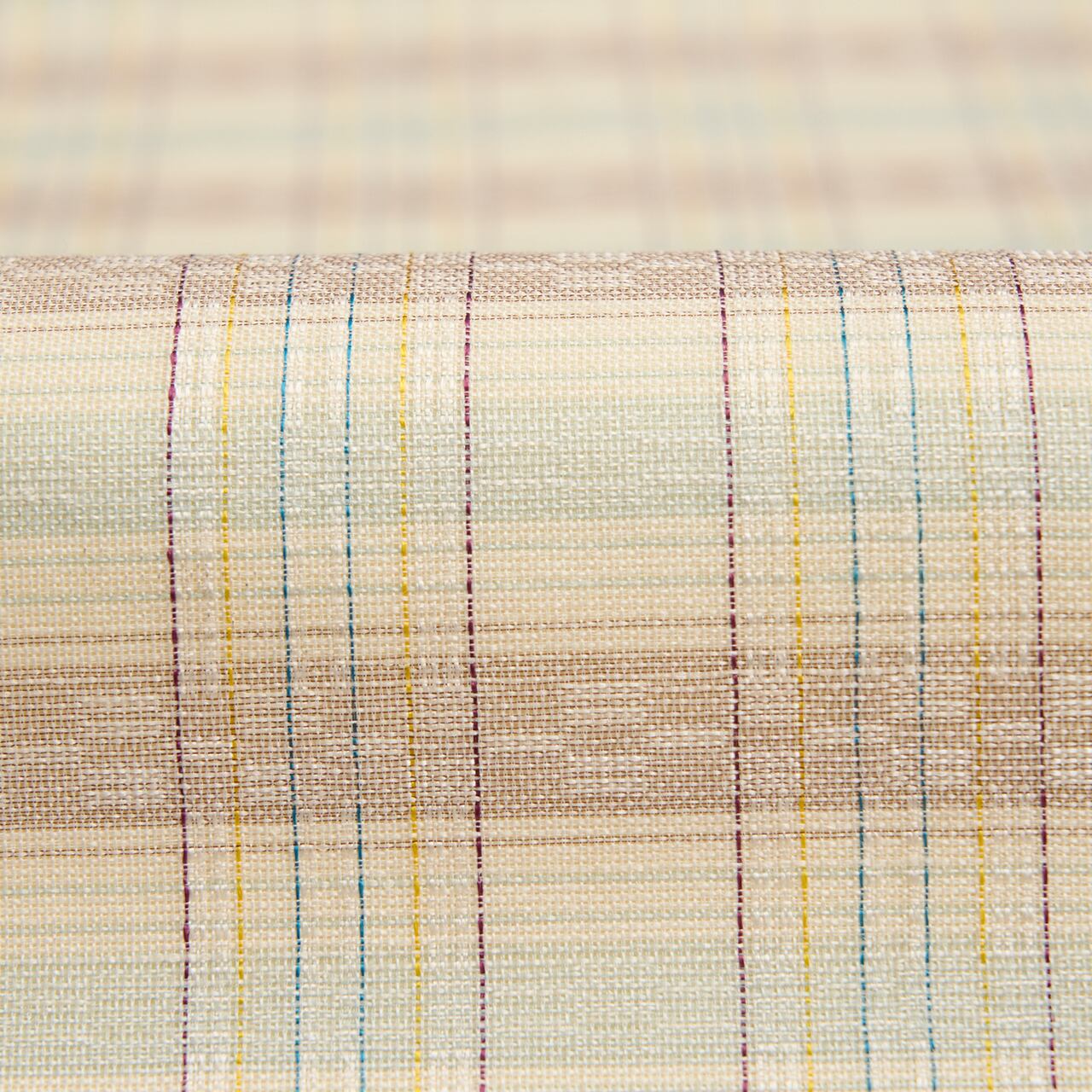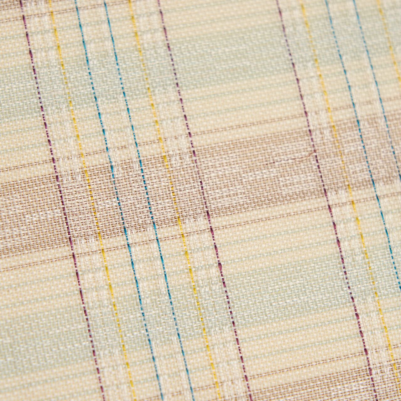 象牙色の紬紗のようなシャリっとした質感の生地に、横段には少し赤味のある薄茶・胡桃染色と淡い水色・秘色色のやや太い縞が織られ、縦には緑黄色や紫鳶色、深縹色などの少しビビットな色の糸で織られた細い縞の間に生成り色の糸が織り込まれて、変り格子の模様となった地に、横段の胡桃染色の部分にはさらに琉球の花織のような模様が織り込まれています。