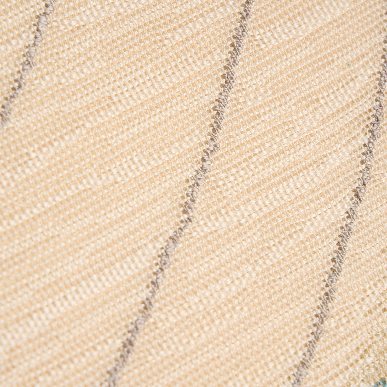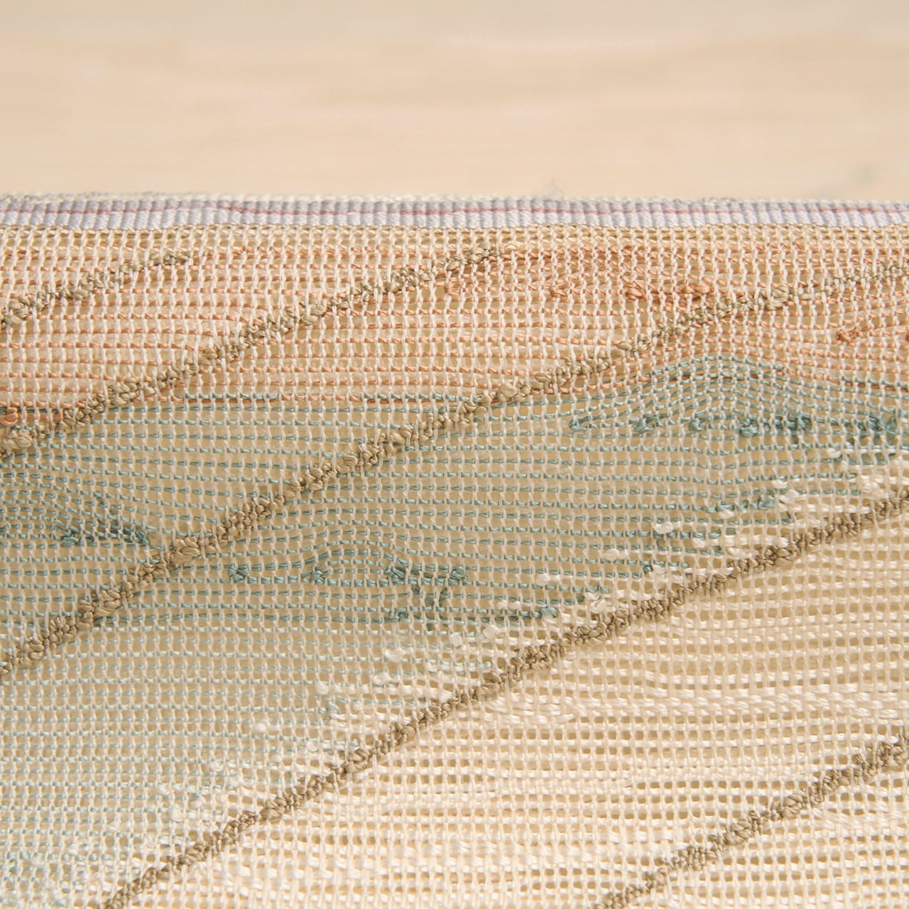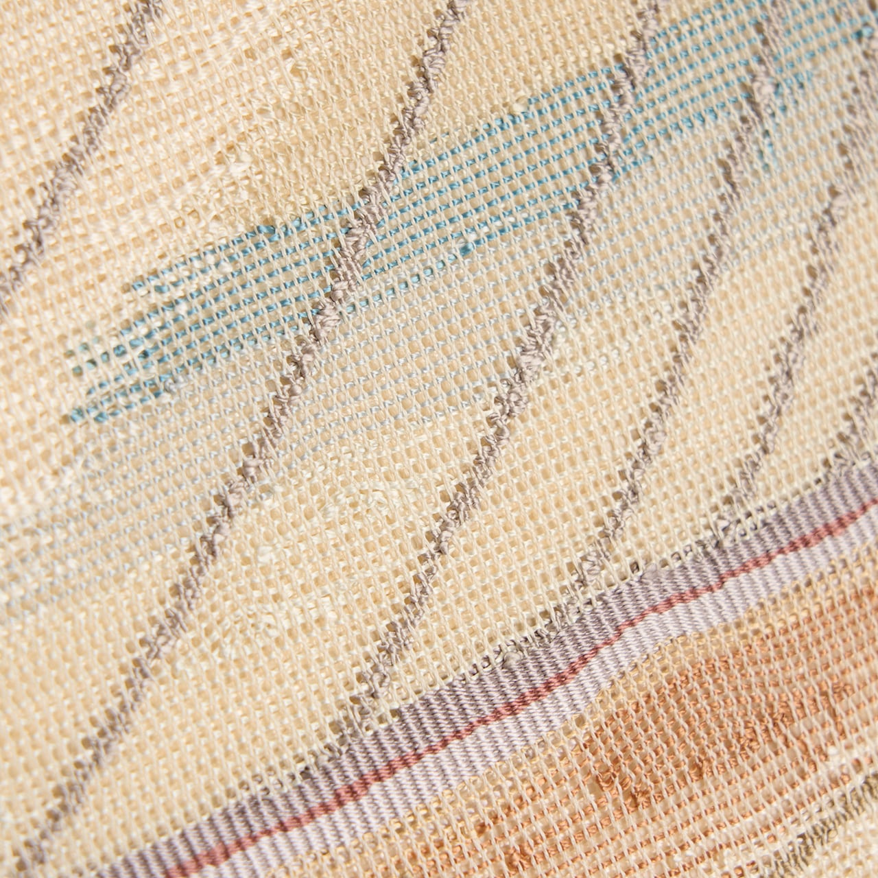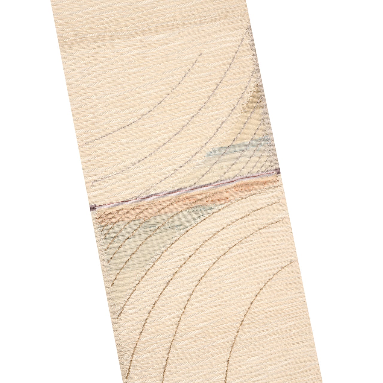 象牙色の糸で、横に流れるような線がすかし織のような変り織で織られた生地に、お太鼓の真ん中に一本線が引かれ、その上下に丁子茶色の淡い赤茶や湊鼠色、青白橡色などの段がとられて、それを背景にして右に上がる流線と、左に下がる流線が織られた、とても大胆なデザインのお洒落な夏の八寸名古屋帯です。