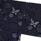 蝶々と団扇の模様がポイントとなっていて、その間には立涌にお花の図案の小紋がびっしりと埋め尽くされるように絞り染めされています。