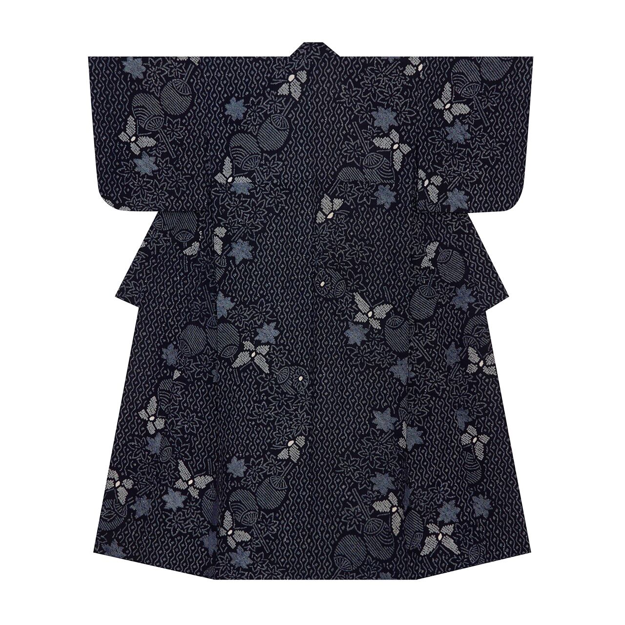 さらりと、そしてふんわりとした手触りの木綿の生地に、蝶々や紅葉、団扇などの模様が絞り染めで表された素敵な浴衣です。