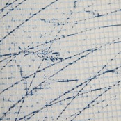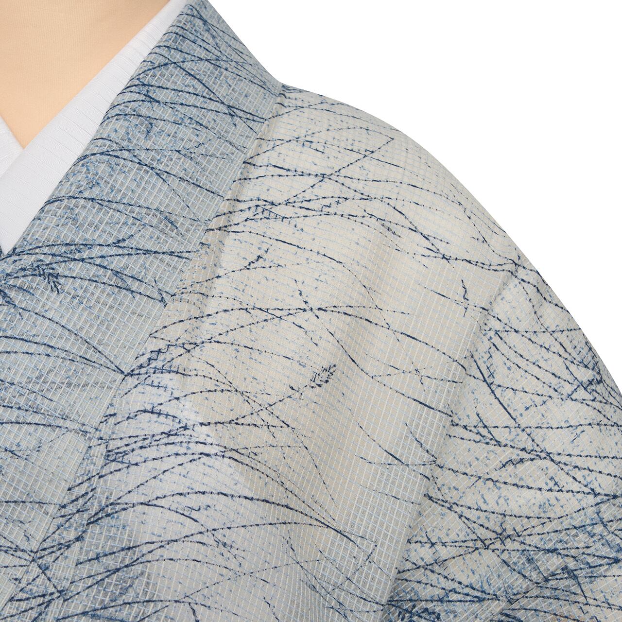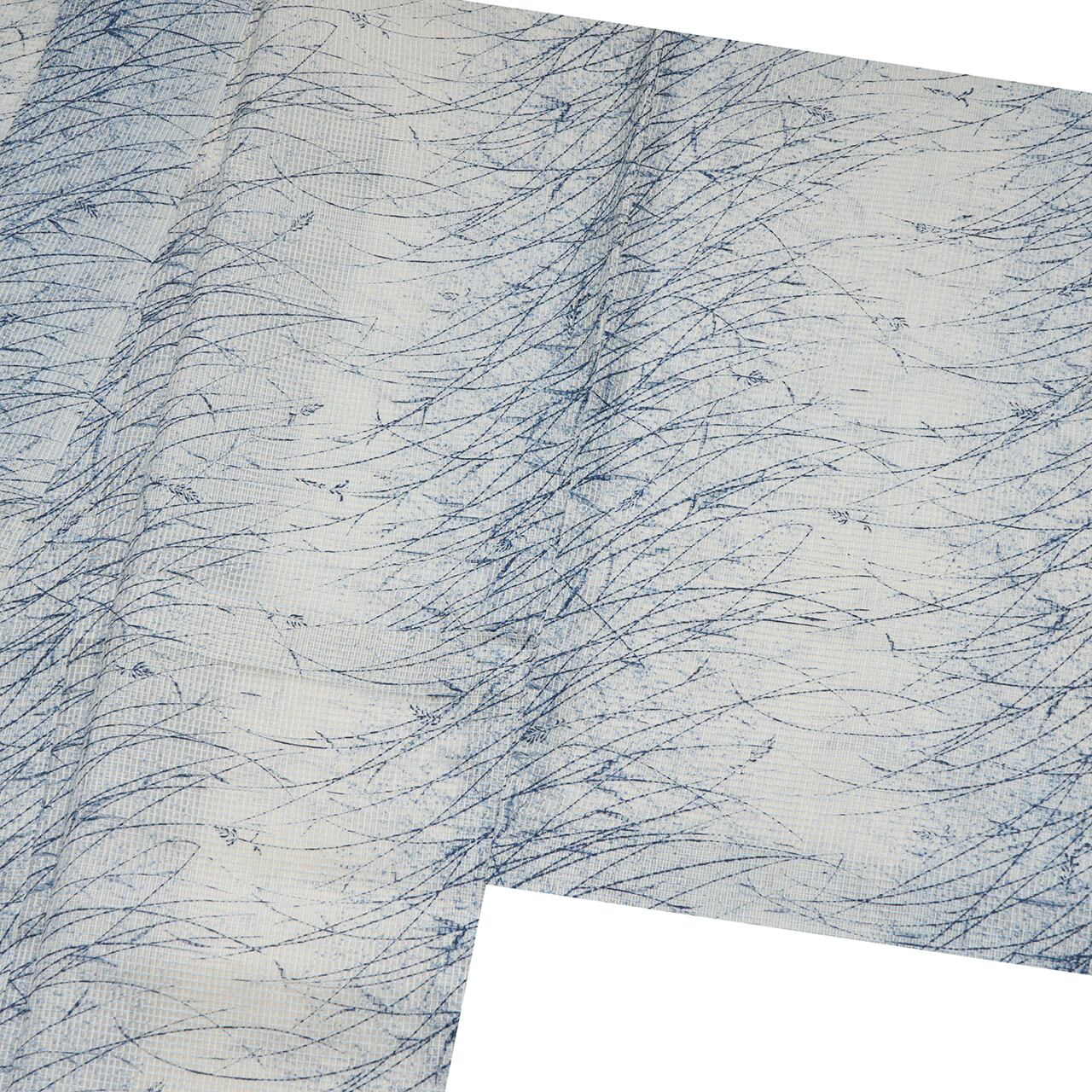 少し青味のある白・白練色の絹紅梅の生地に、反物の両端から淡い藍色の点描で暈しが入れられ、そこにイネ科の植物・カモガヤのような草が一面に茂っているような様子が鉄紺色の型染めで染められた、とても涼しげな夏のお着物です。