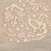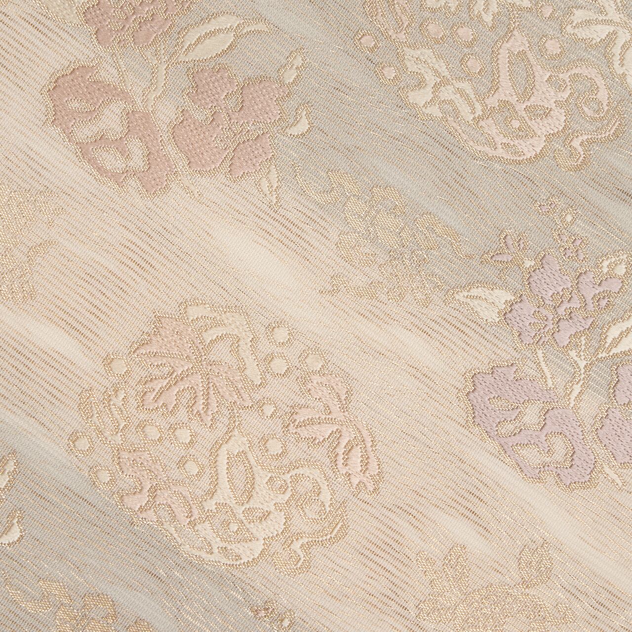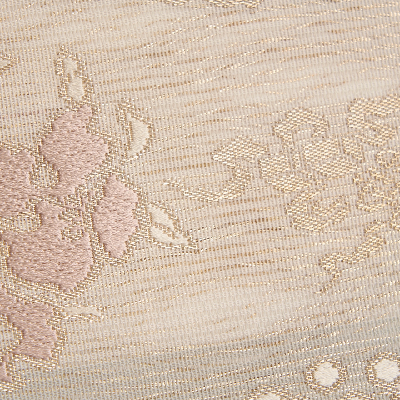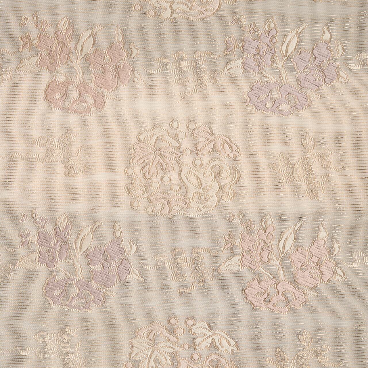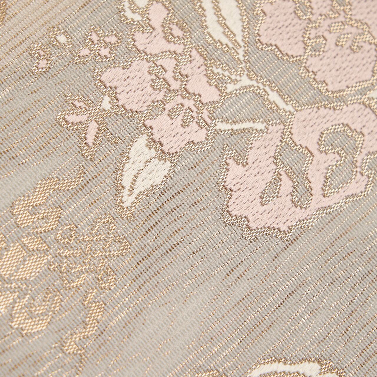 葡萄蔓は淡いピンクの糸で、カトレアのようなお花は薄色の淡い紫と撫子色のピンクの糸で織られ、その間には宝尽くしのような模様や柘榴の実のような模様が銀糸で織り込まれています。