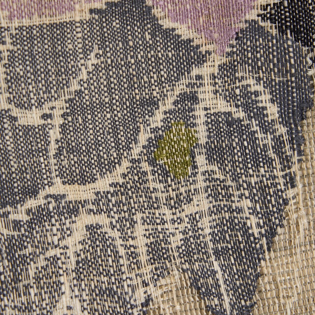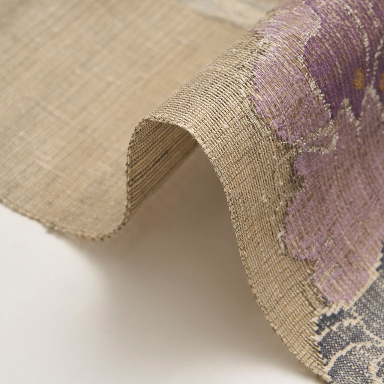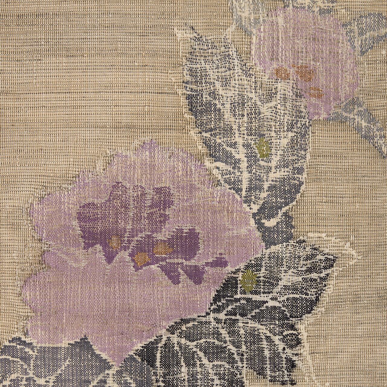手描きでスケッチされた絵をそのまま織りで表したような図案となっていて、お花は明るい紫・紅藤色の花びらに、中心には濃い赤紫・蒲葡色が織り込まれ、葉は黒緑色と青鈍色で彩られて少し濃淡で表現されています。