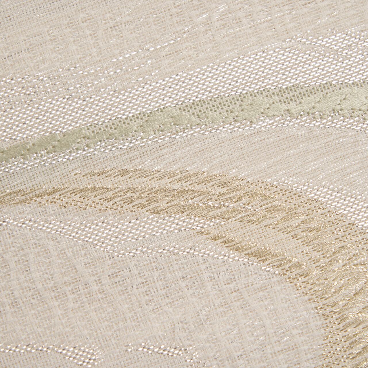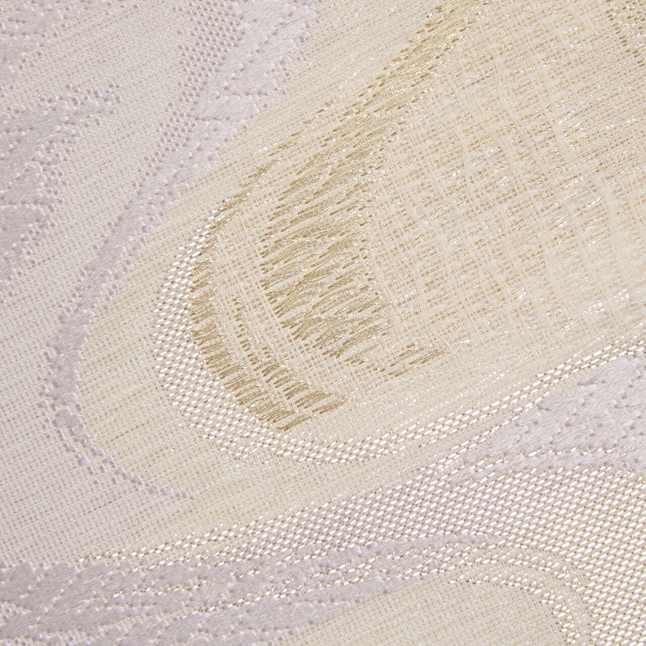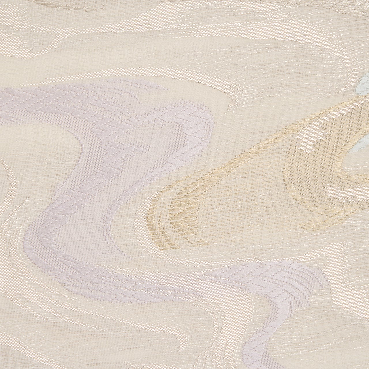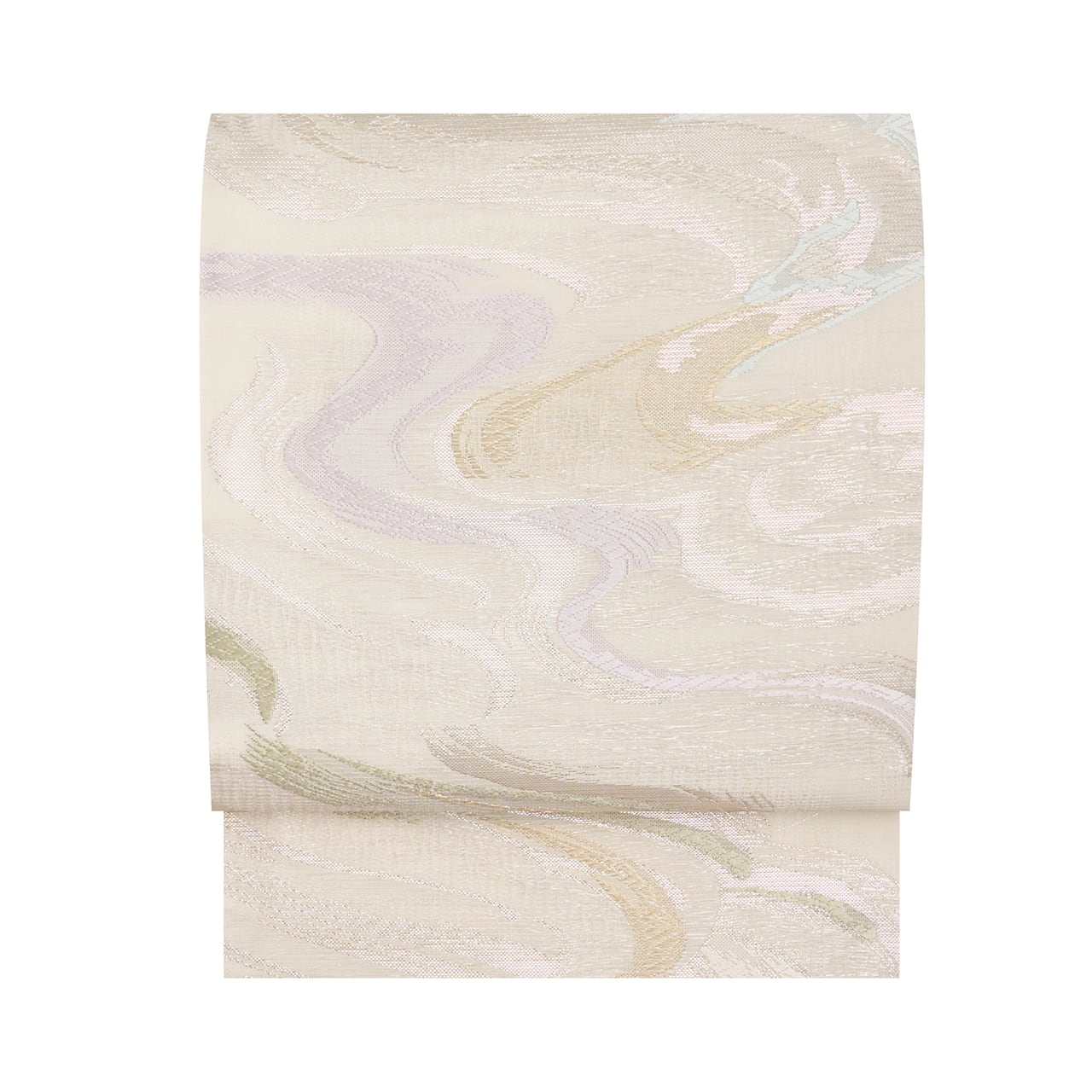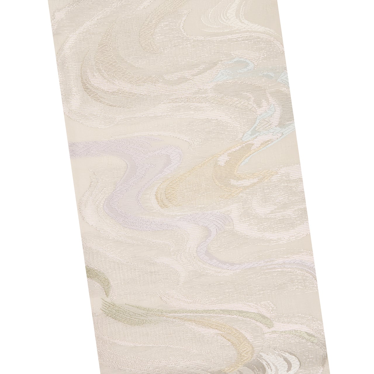 象牙色の絽目のある紗織の地に、大胆なラインを描いて流れる水の線が複雑な織りの組み合わせで、細い銀糸や金糸、牡丹鼠色の薄紫、若菜色の淡い薄緑、白藍色の淡い水色などの糸で唐織で織り出された、躍動感のあるとても素敵な夏の袋帯です。