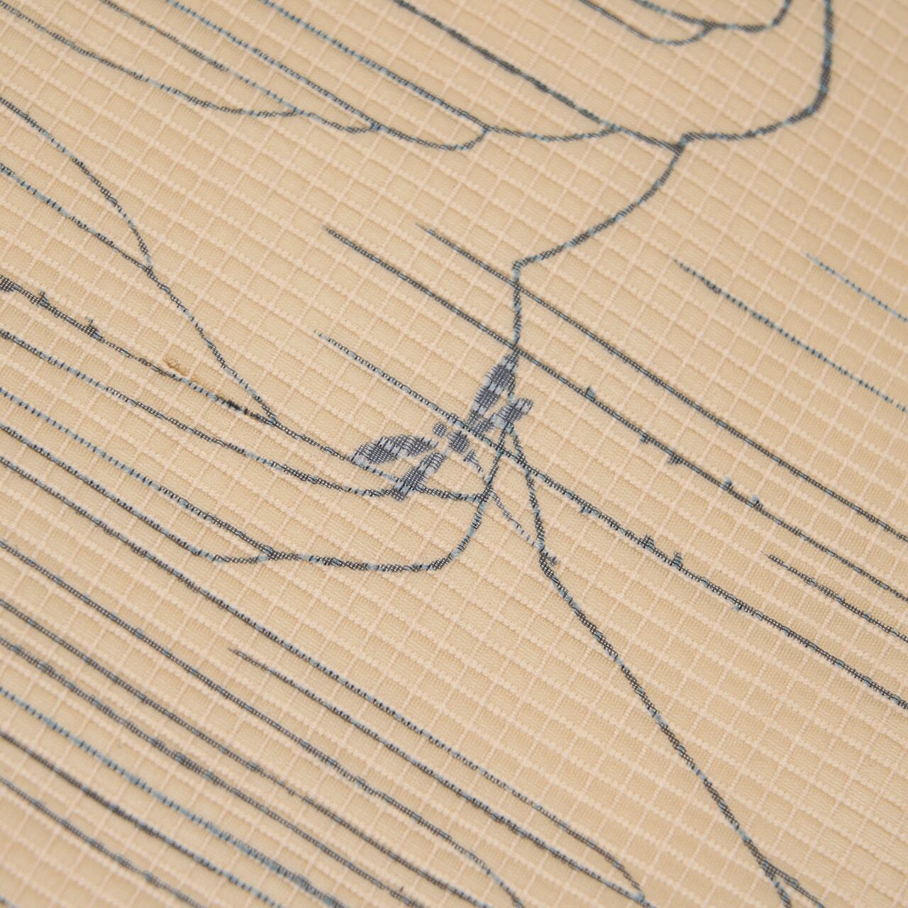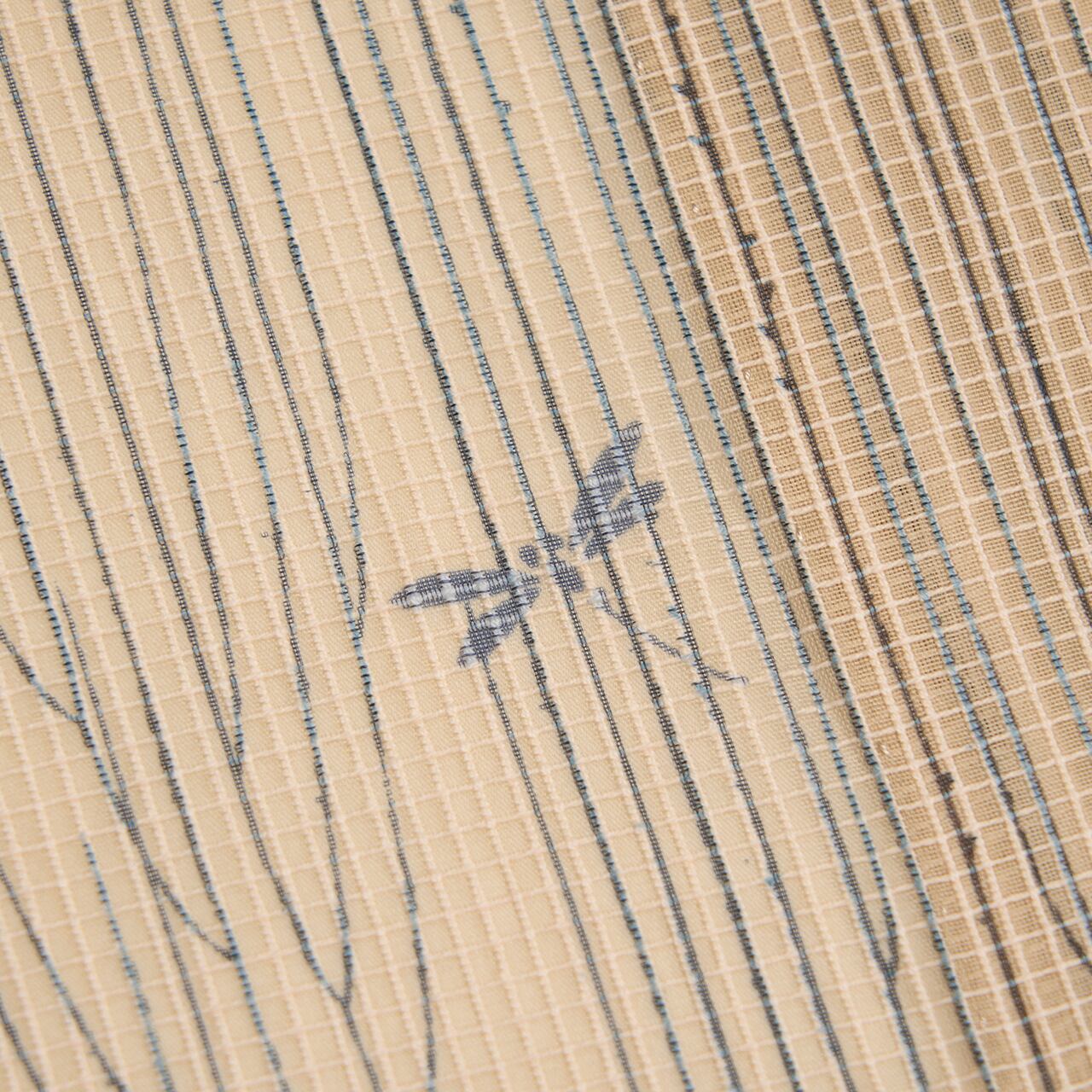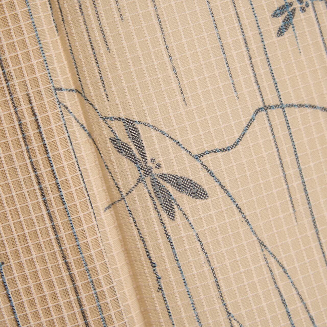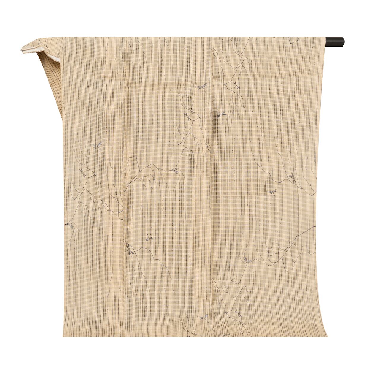 淡いベージュ・練色の薄い絹の生地に象牙色の太い糸が織り込まれた絹紅梅織の生地に、流れ落ちるような枝垂れ柳がグレー味のある藍・藍鉄色と明るい藍・花浅葱色の濃淡でたくさん描かれ、そこに飛び交うトンボの姿が描かれた、とても涼感のある夏のお着物です。