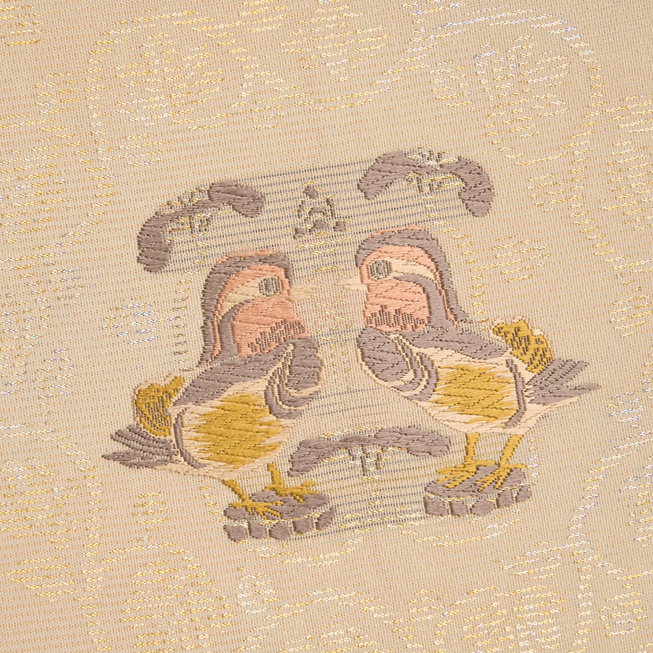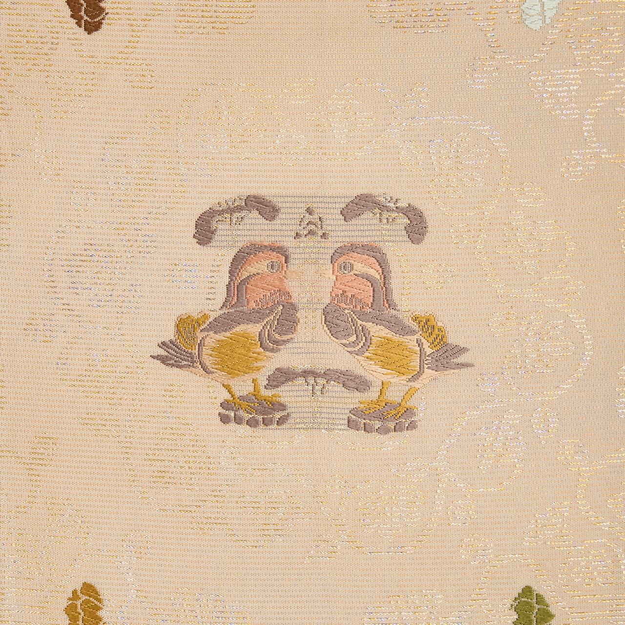 唐草模様は細かな金糸で織り出され、鴛鴦は薄色の薄紫や水柿のオレンジ味のあるピンク、淡黄色などの唐織で表され、ふっくらとした存在感のあるものとなっています。