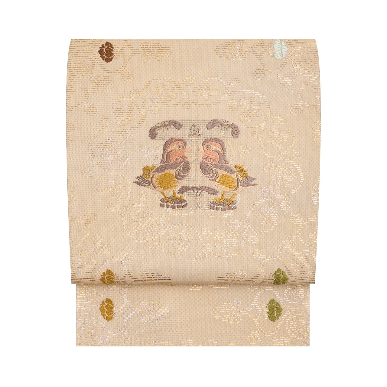 淡く薄いベージュ・練色の絽目のある紗織の生地に大きく唐草の丸い文様が金糸で織り出され、その中に向かい合う鴛鴦(おしどり)の姿がいろいろな色糸で唐織で織り出された、格調の高さのあるお洒落な夏の袋帯です。