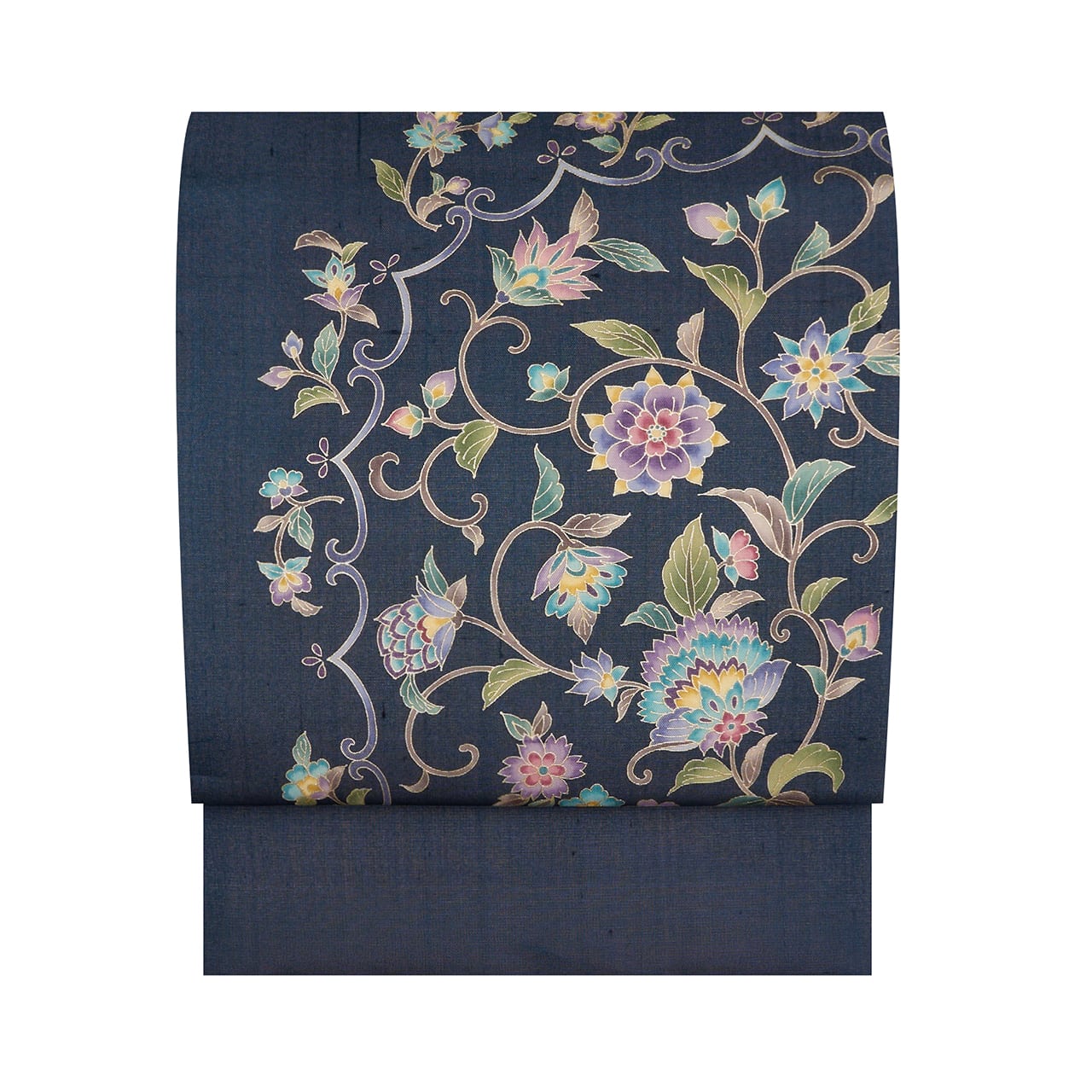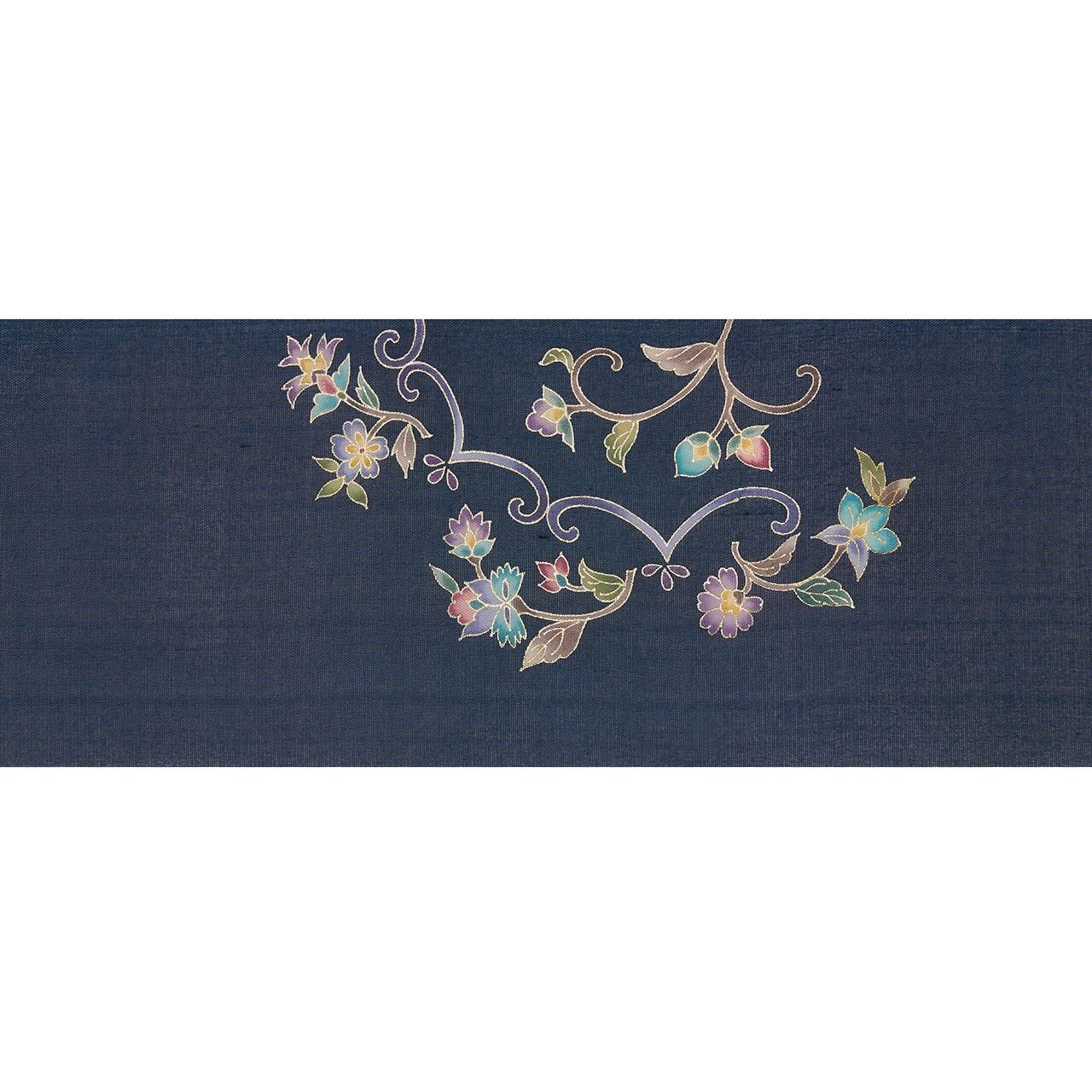 シャリっとした張りのある質感の藍鉄色の紗紬のような生地のお太鼓に大きく半円が取られ、色とりどりに花唐草の模様が友禅で描かれた、とても豪華さのある素敵な夏の九寸名古屋帯です。