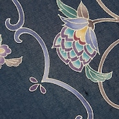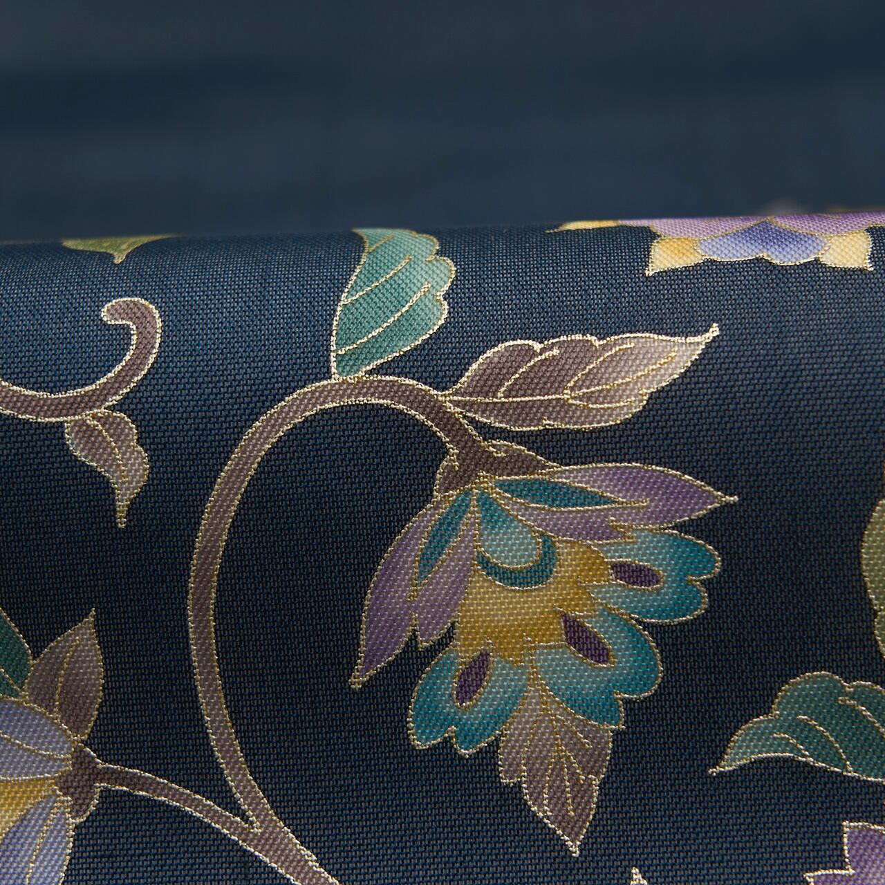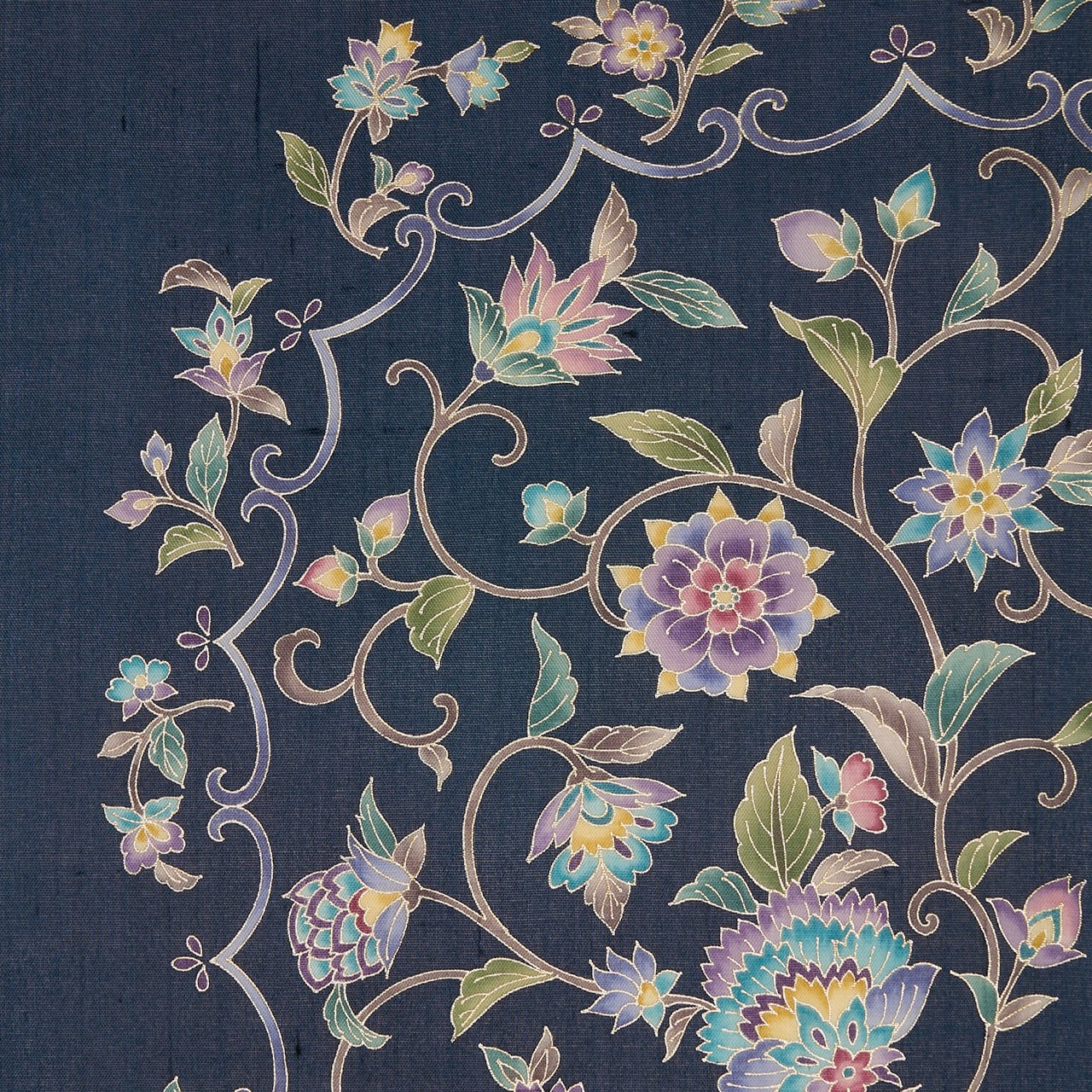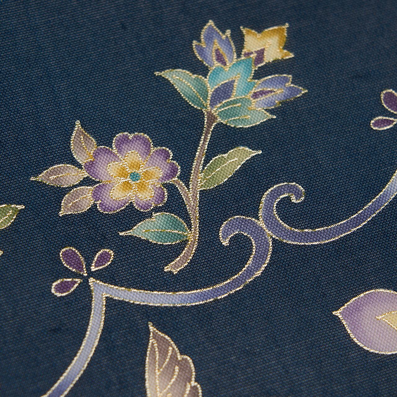 濃いグレー味のある藍・藍鉄色の地に、鳩羽色の薄紫や薄花色のブルー、淡黄色などの綺麗な色使いで唐花模様が描かれ、細かい金彩で縁取りもされていて、さりげない華やかさを演出しています。