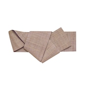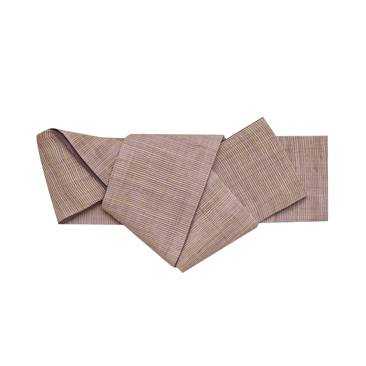 片面は自然の麻の色がそのままになった亜麻色の糸で絽織りされた生地、もう片面には中間の紫・茄子紺の無地の麻の生地を合わされてお仕立てをされた、お洒落な雰囲気の夏の半巾帯です。