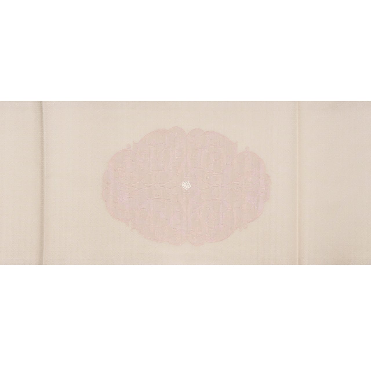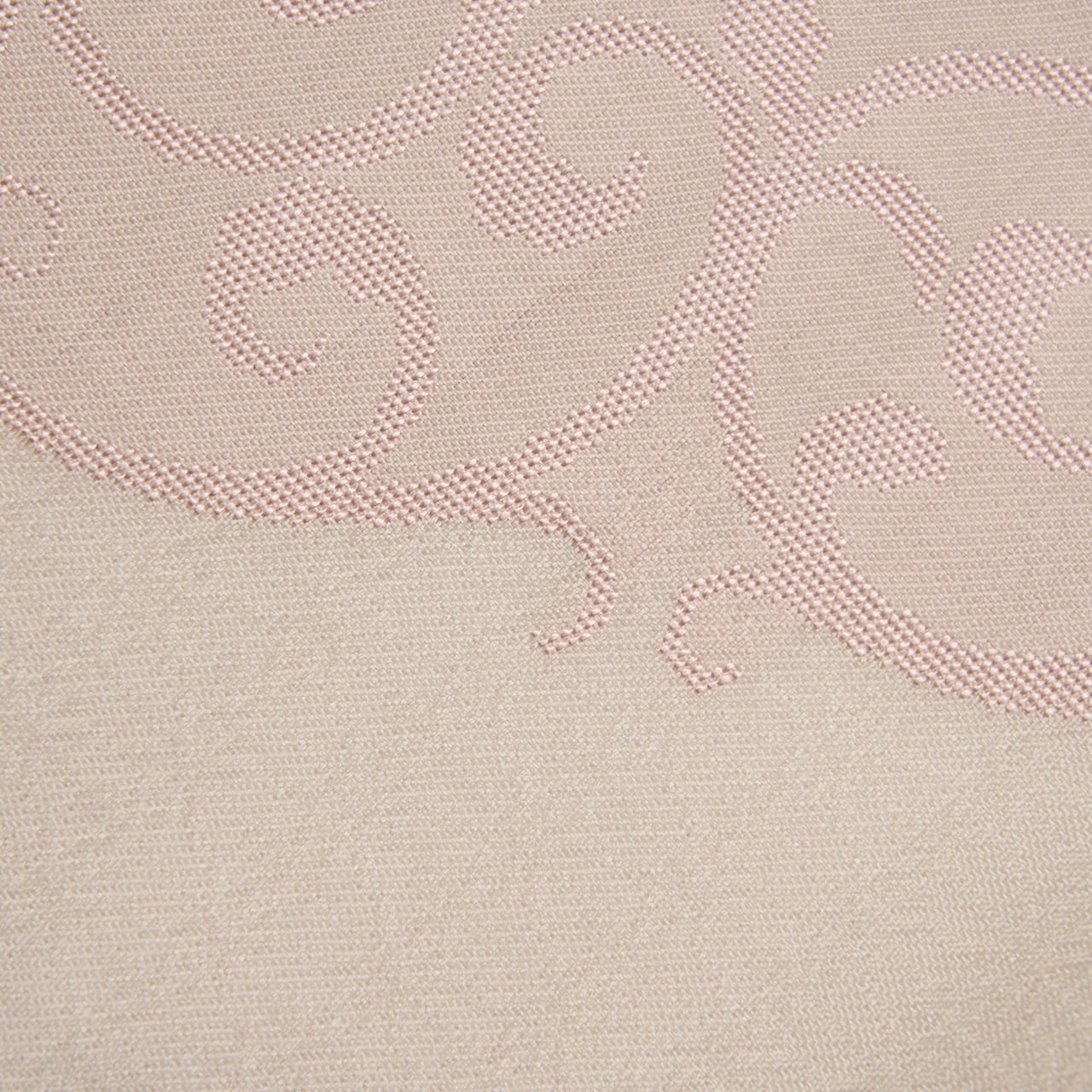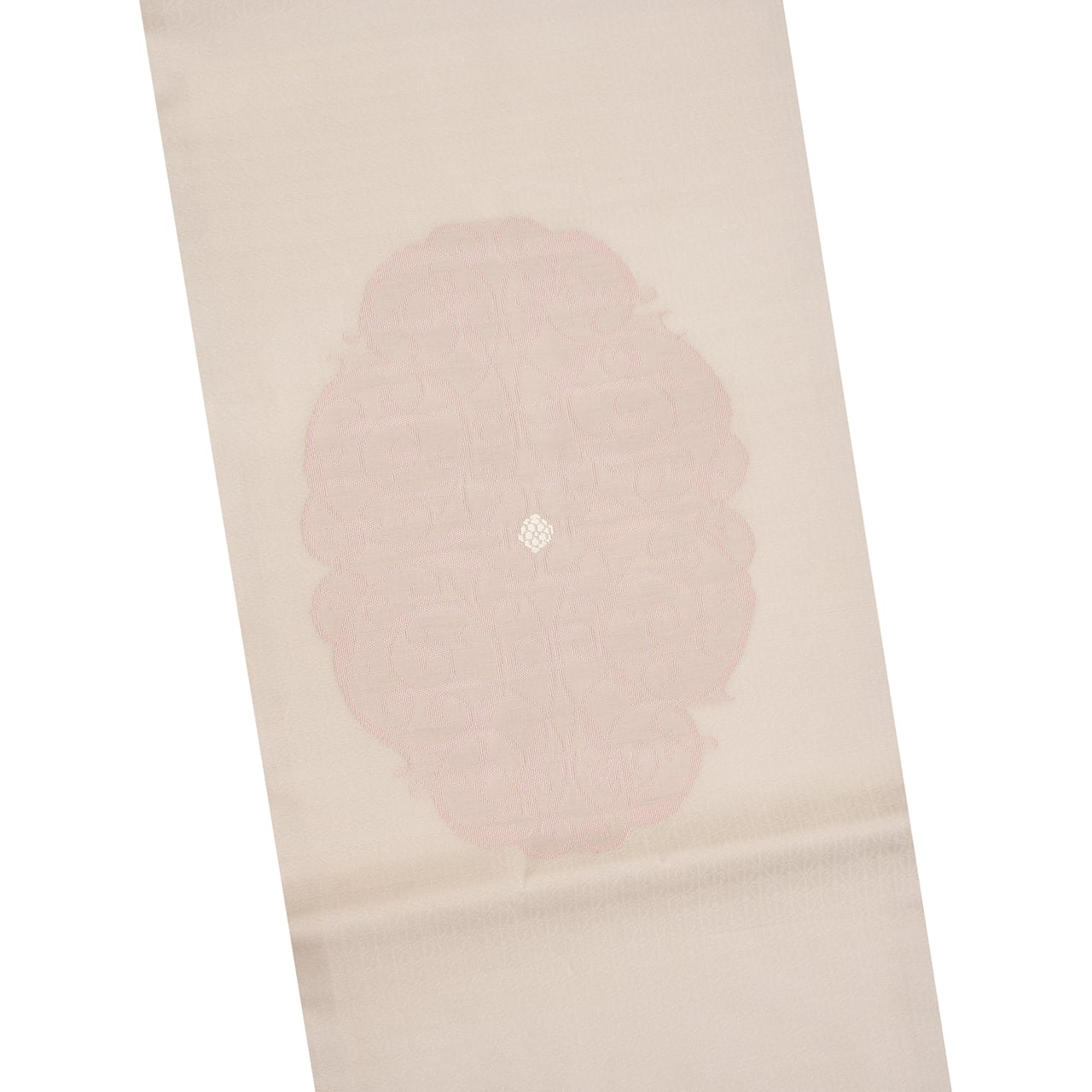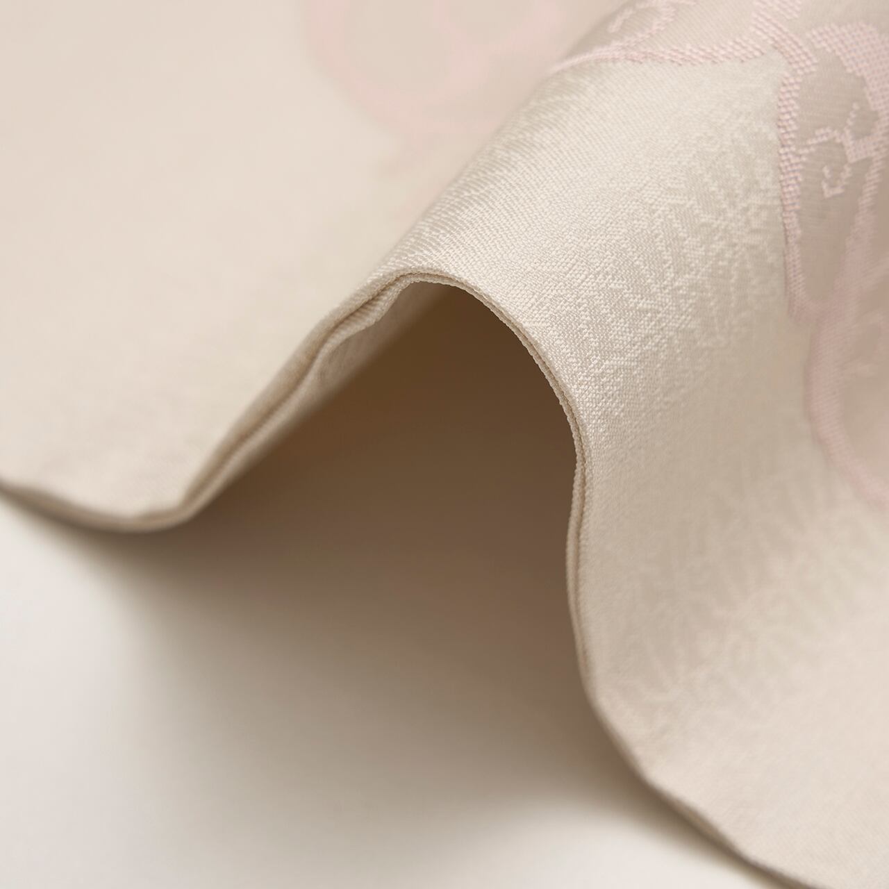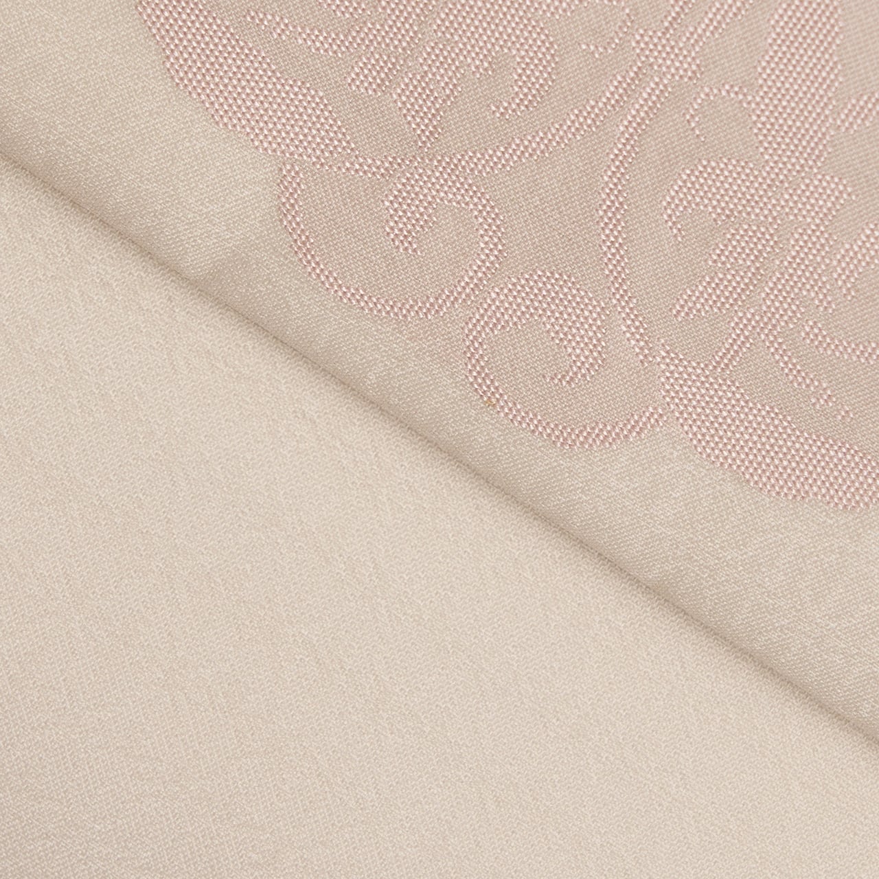 こちらは、少しだけピンク味を感じられるグレイッシュなベージュ・灰梅色の菱の文様が連なる地紋の生地に、お太鼓には唐草の形の鉄柵が石竹色の青味のあるピンクで織り出され、それが牡丹のお花の形を描いている、とてもお洒落な図案の夏の九寸名古屋帯です。