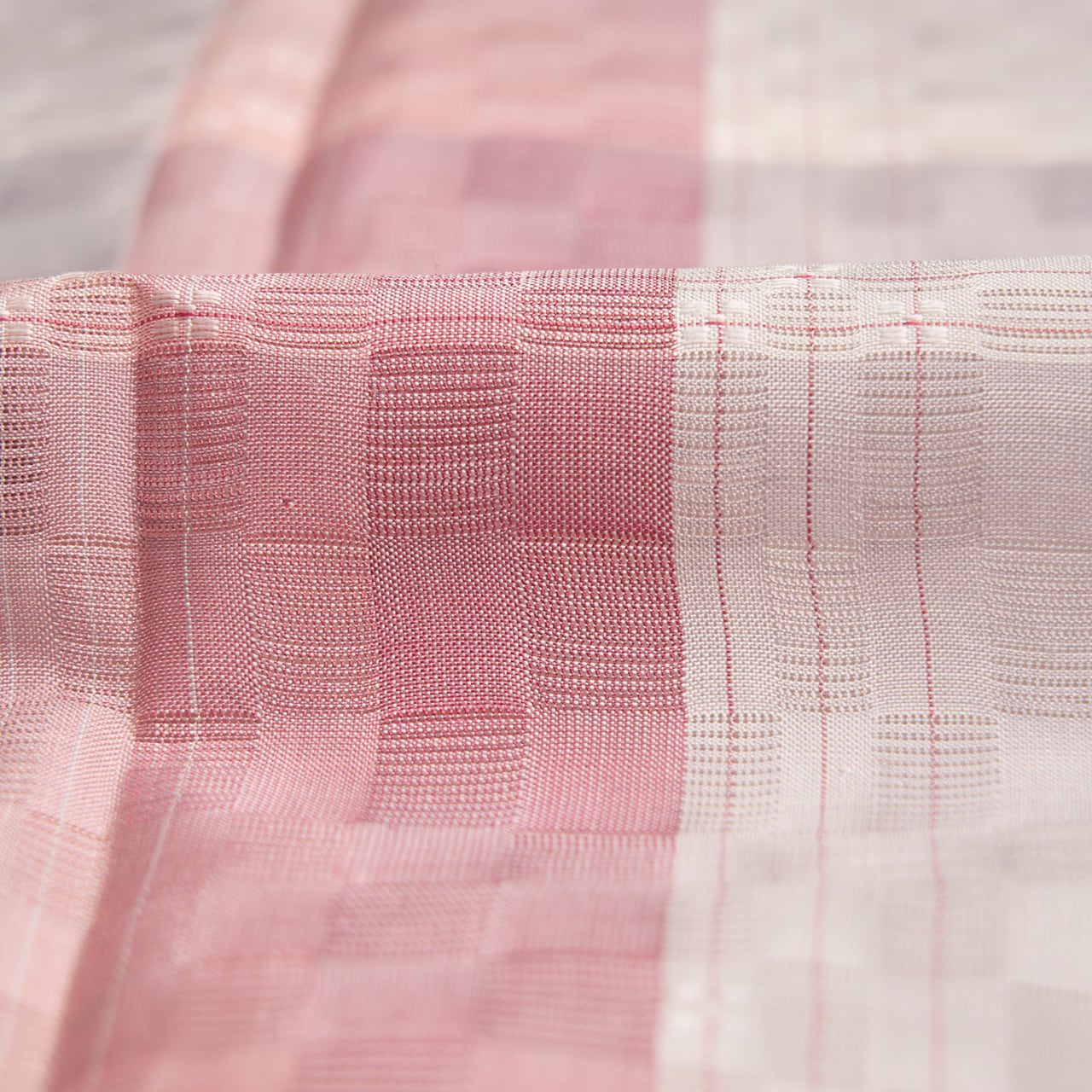 大きさを変えながら市松の配置で絽織された、淡いピンク味のあるグレー・桜鼠色の地に、縦には浅蘇芳色から紅梅色へと変化し、さらに牡丹鼠色に変わる縞模様のグラデーションが加えられた、とても美しい作品です。