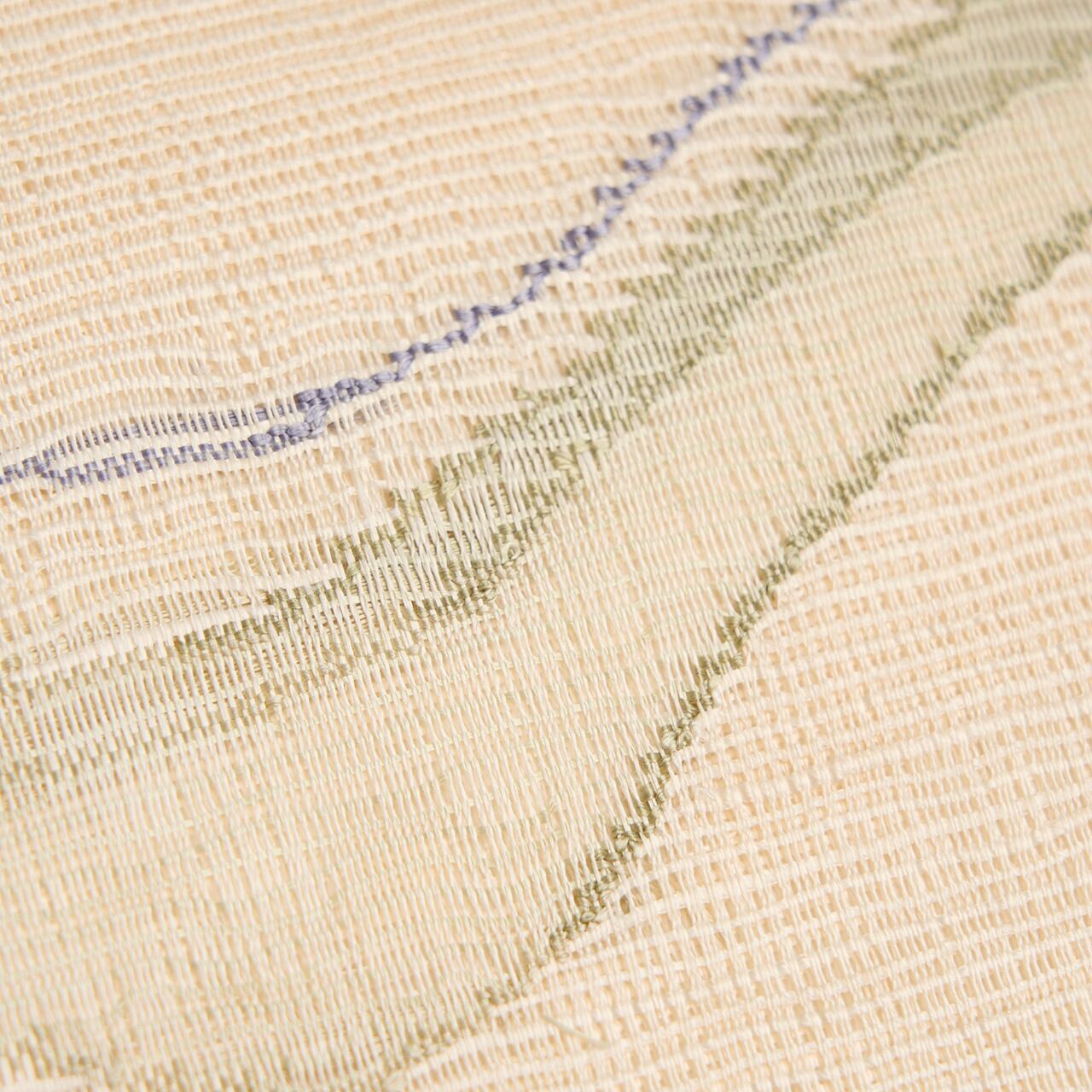 象牙色の絽目のあるすかし織に、経糸が少し櫛漉き織のような変化のある織りにされた地に、お太鼓には大きくうねる波のような流線が、湊鼠色の藍味のあるグレーや鳩羽鼠色の淡い赤紫、柳茶色の淡い緑などで織り出され、小さな丸もあしらわれた、涼しげな夏の八寸名古屋帯です。