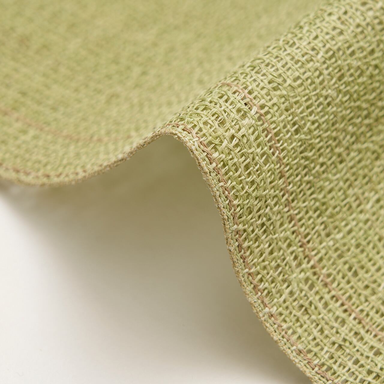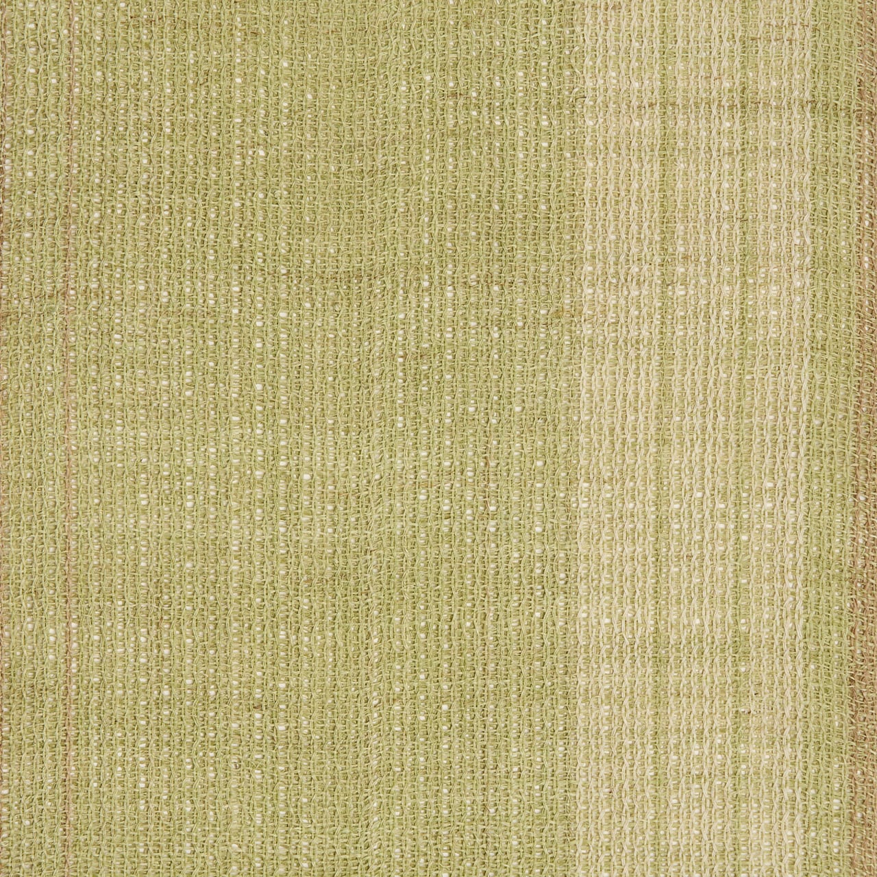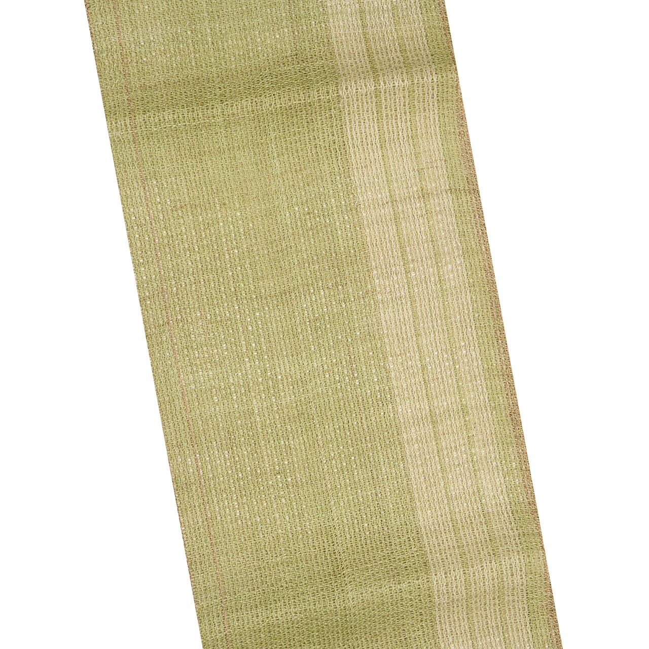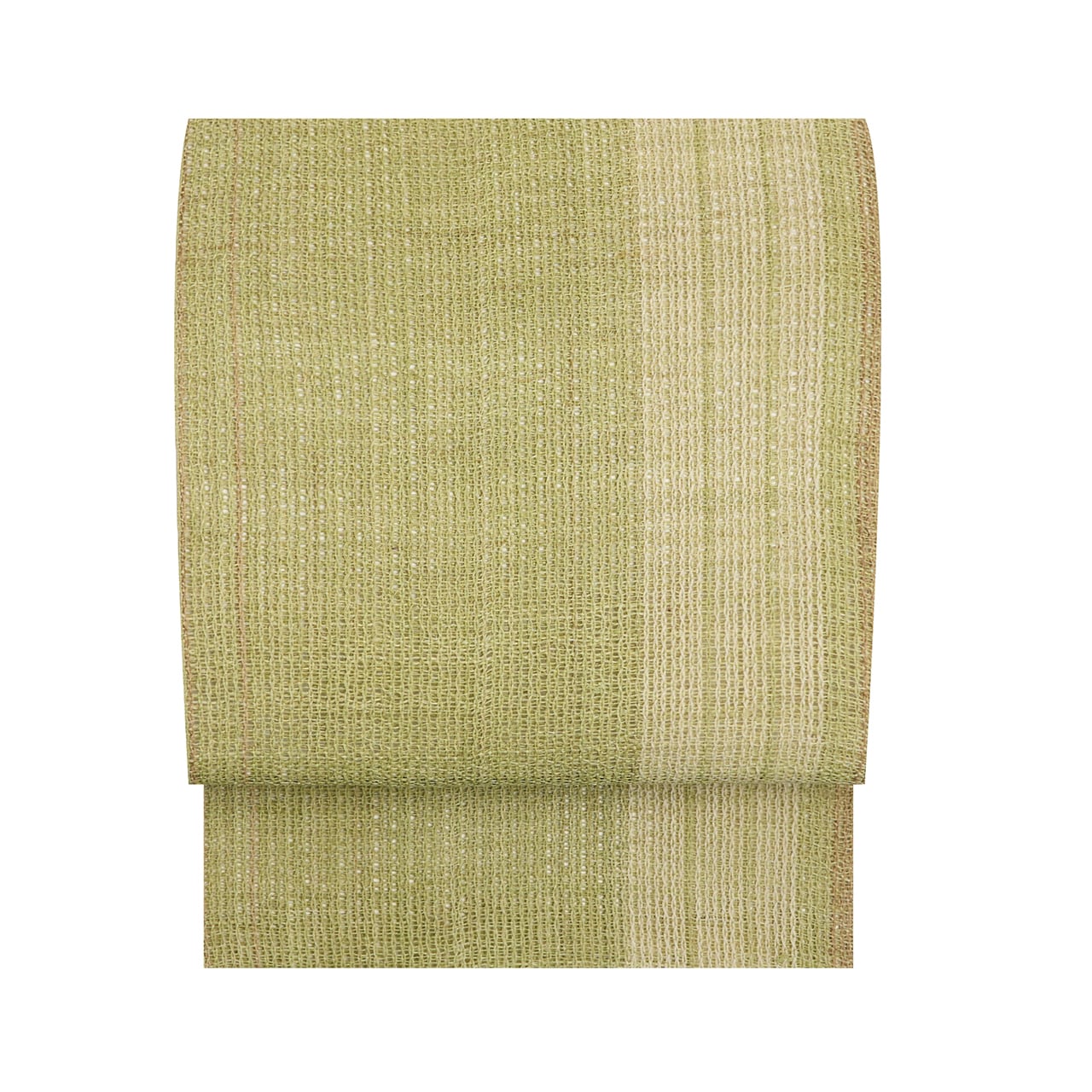 淡い草色・柳茶色に染められた麻の糸で、絽目のような捩り織になった地に、右端寄りに練色の縞が織り込まれ、両端には少し赤味のある薄茶・胡桃染色の縞が配置されて織り出された、麻の糸の風合いがとても素敵な夏の八寸名古屋帯です。