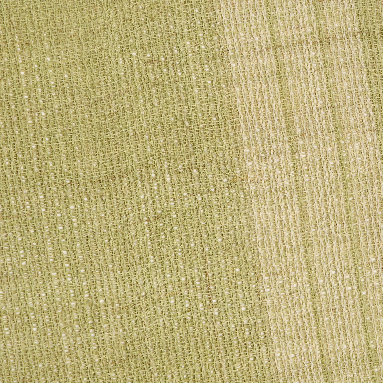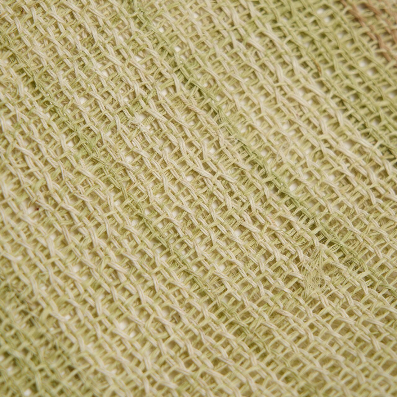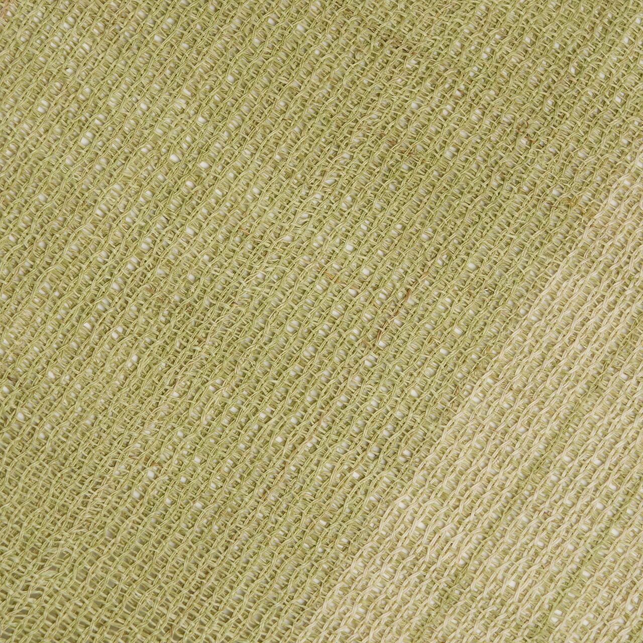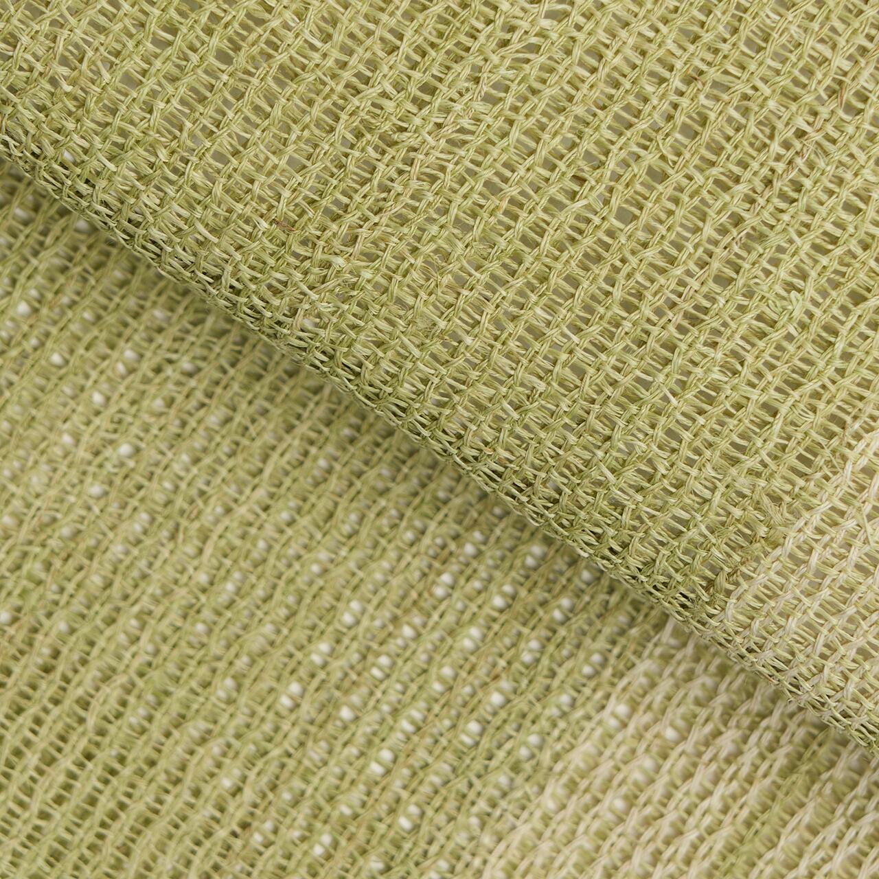 淡い草色・柳茶色に染められた麻の糸で、絽目のような捩り織になった地に、右端寄りに練色の縞が織り込まれ、両端には少し赤味のある薄茶・胡桃染色の縞が配置されて織り出された、麻の糸の風合いがとても素敵な夏の八寸名古屋帯です。