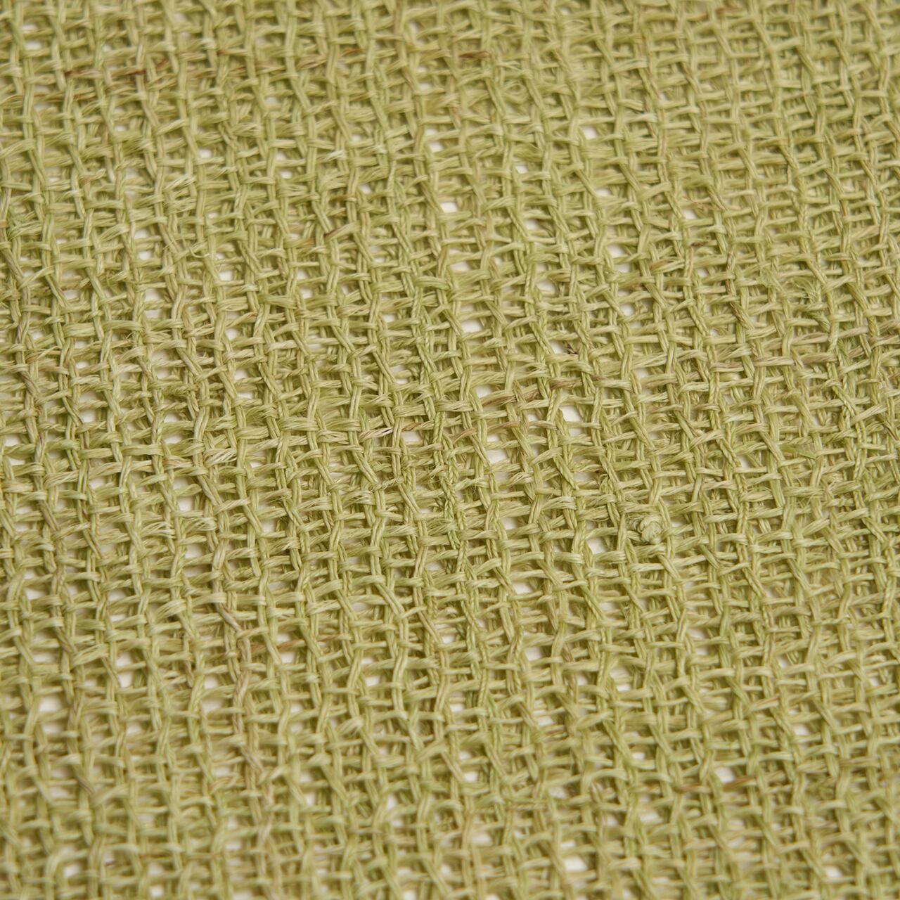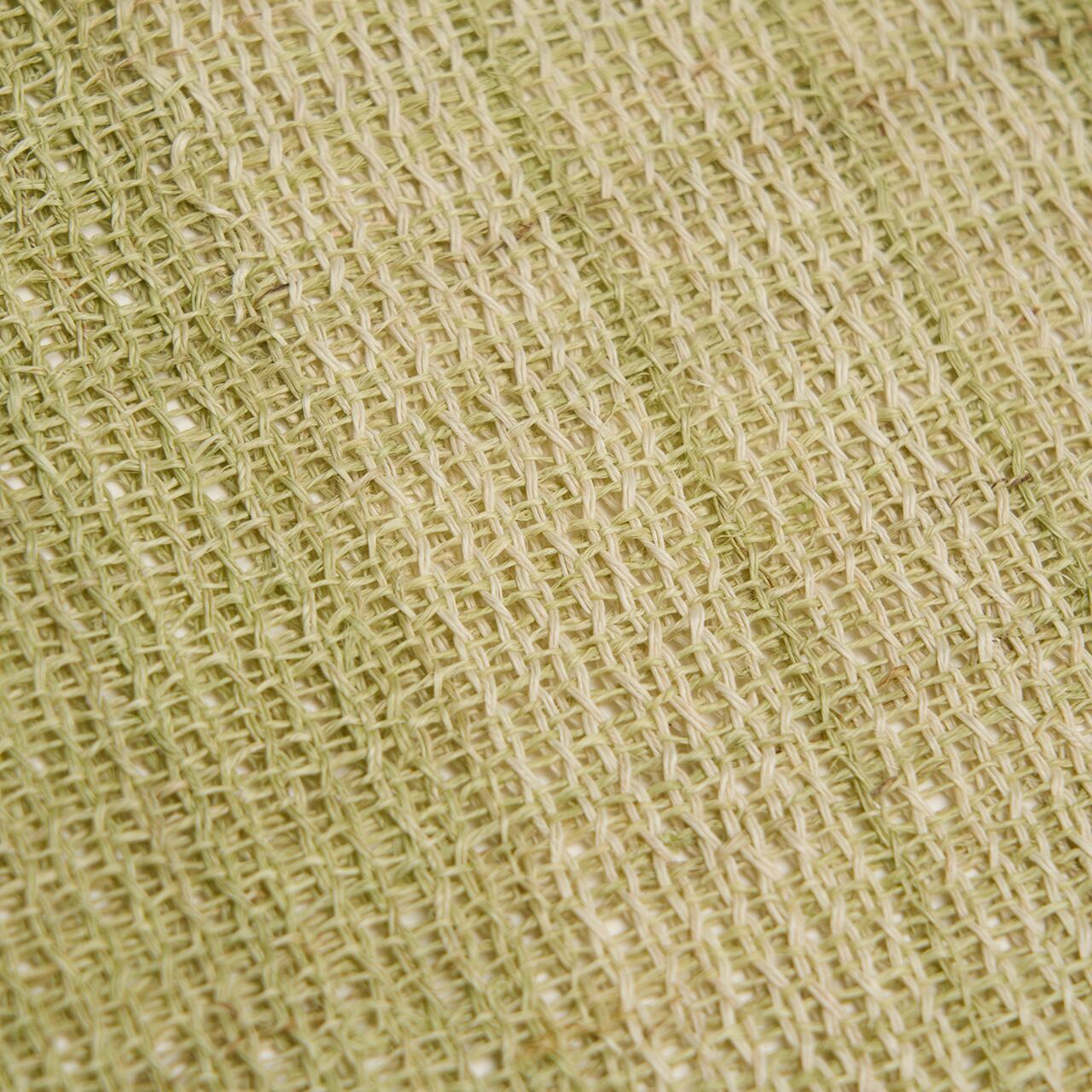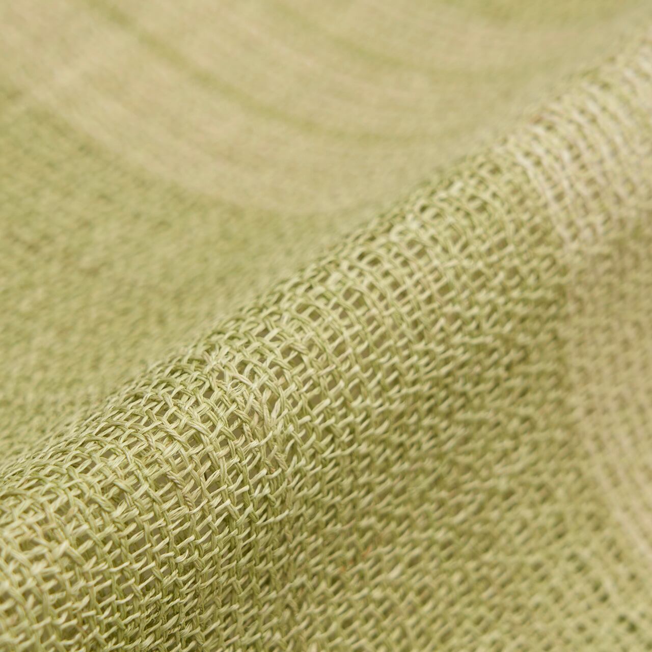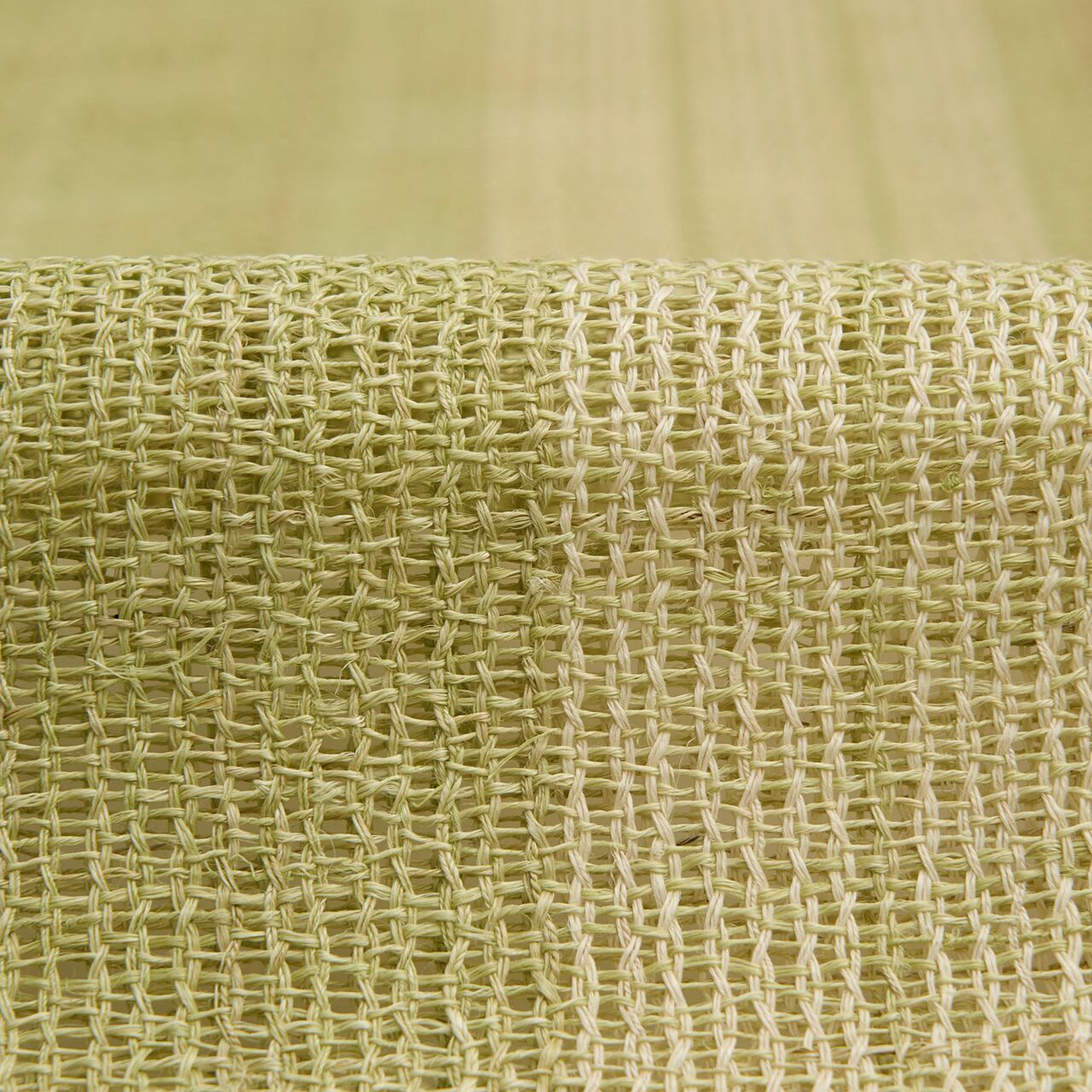 淡い草色・柳茶色に染められた麻の糸で、絽目のような捩り織になった地に、右端寄りに練色の縞が織り込まれ、両端には少し赤味のある薄茶・胡桃染色の縞が配置されて織り出された、麻の糸の風合いがとても素敵な夏の八寸名古屋帯です。