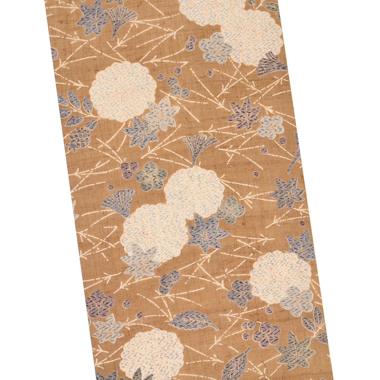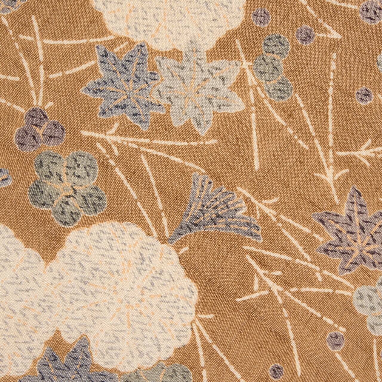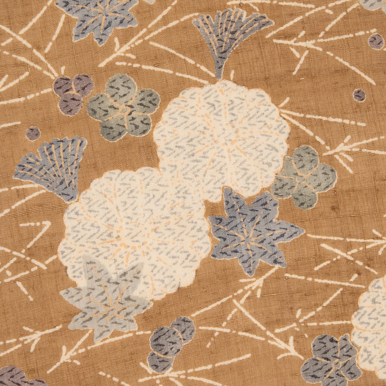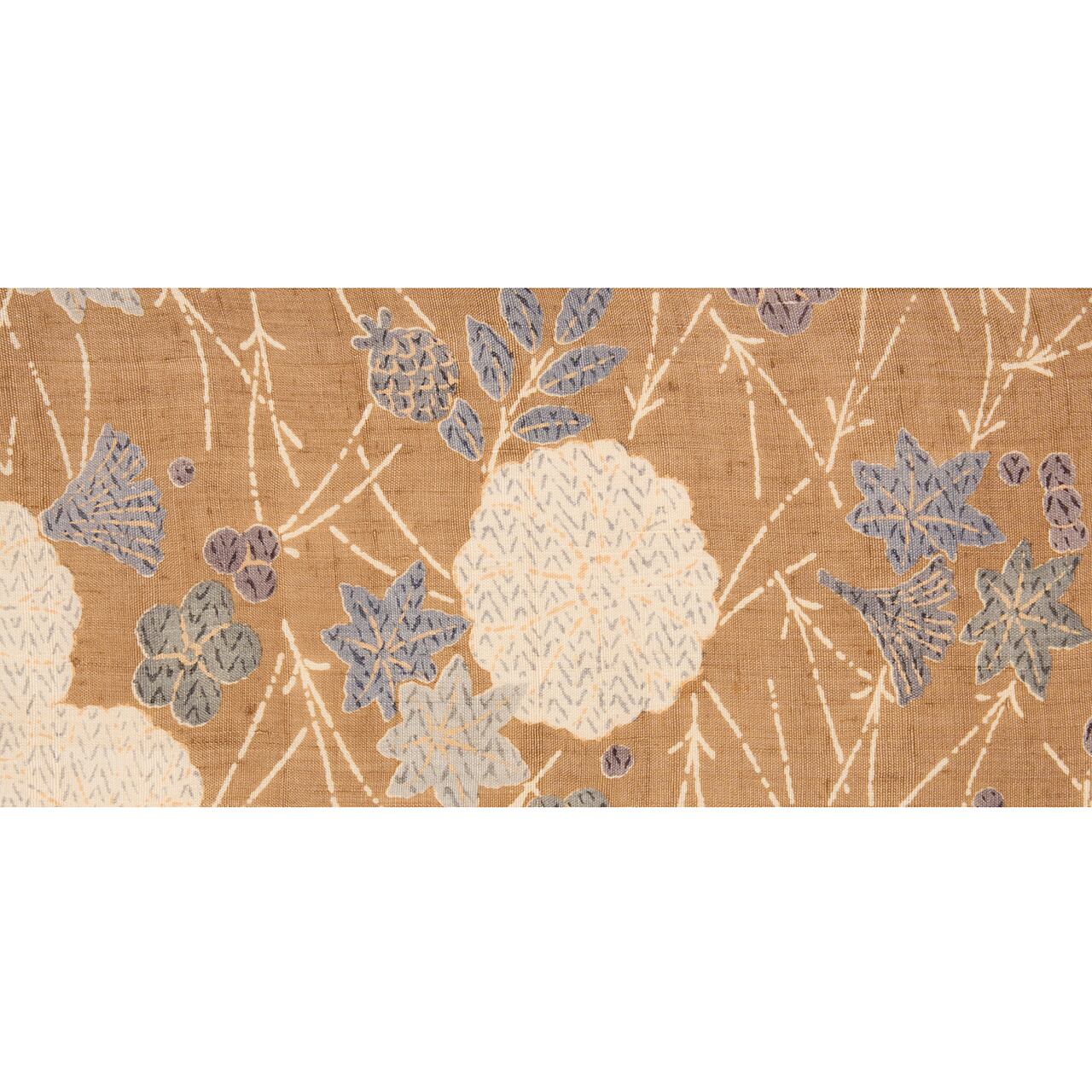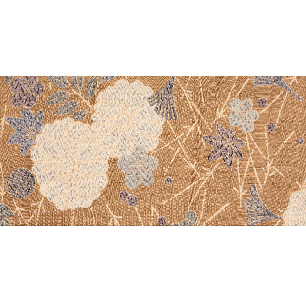 こちらは盛夏にもお召しいただけるような薄手の生紬の生地が、黄色味のある薄茶・丁字染色に染められ、そこに地紋のように松葉が染め抜かれて、中型の菊や小さな梅の花、紅葉、マツボックリなどが散らされた、シックな色使いが個性的でとてもお洒落な多ち花さんの九寸名古屋帯です。