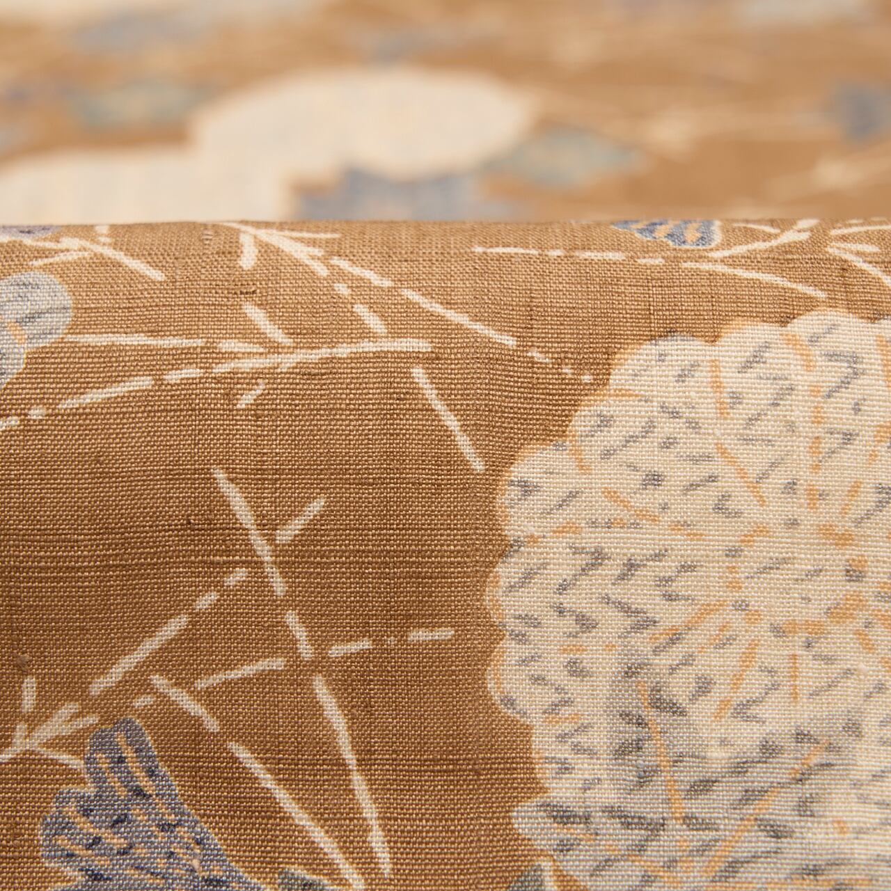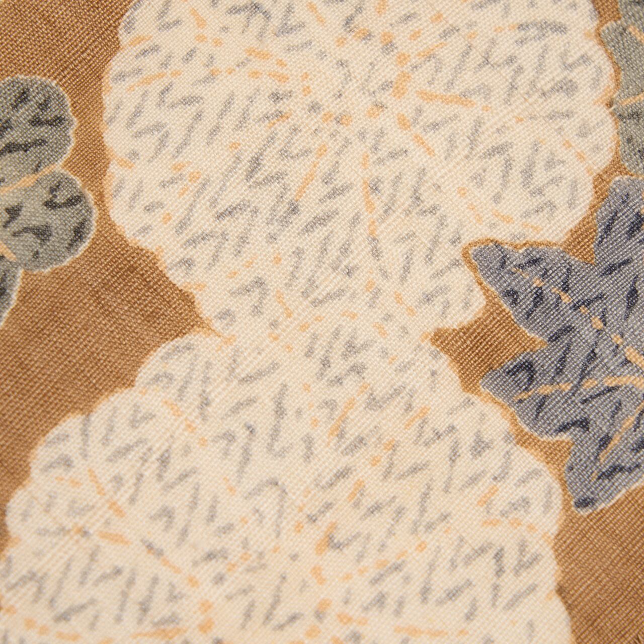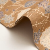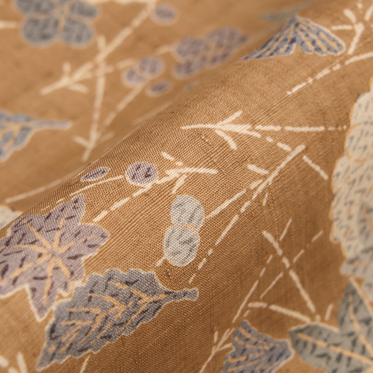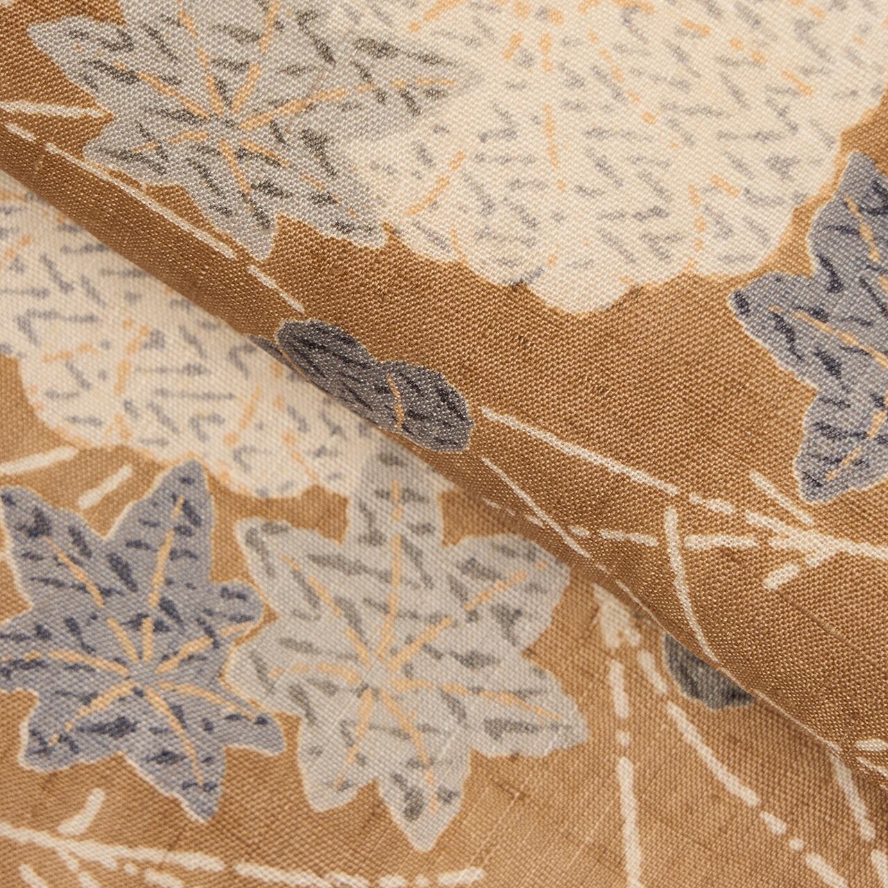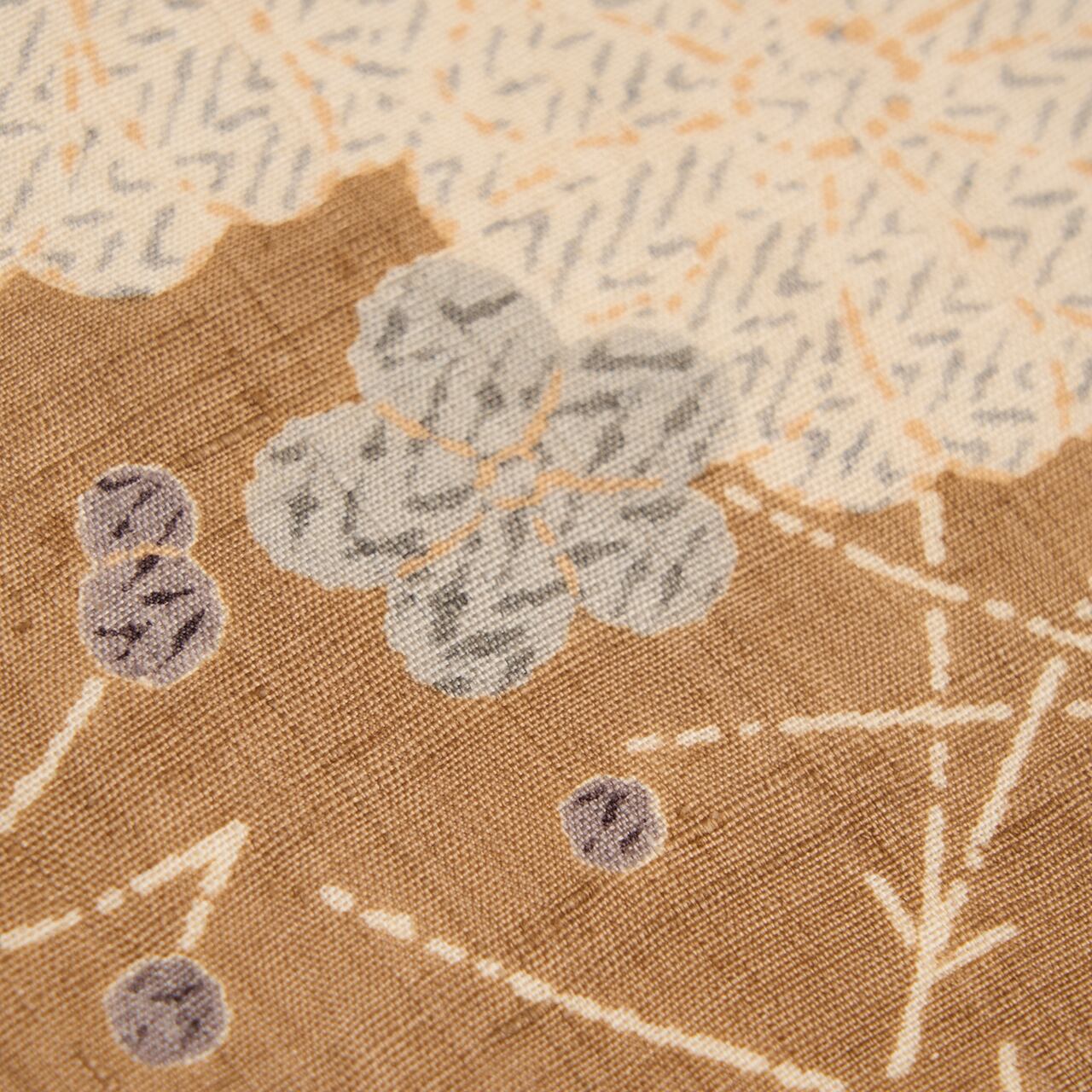こちらは盛夏にもお召しいただけるような薄手の生紬の生地が、黄色味のある薄茶・丁字染色に染められ、そこに地紋のように松葉が染め抜かれて、中型の菊や小さな梅の花、紅葉、マツボックリなどが散らされた、シックな色使いが個性的でとてもお洒落な多ち花さんの九寸名古屋帯です。