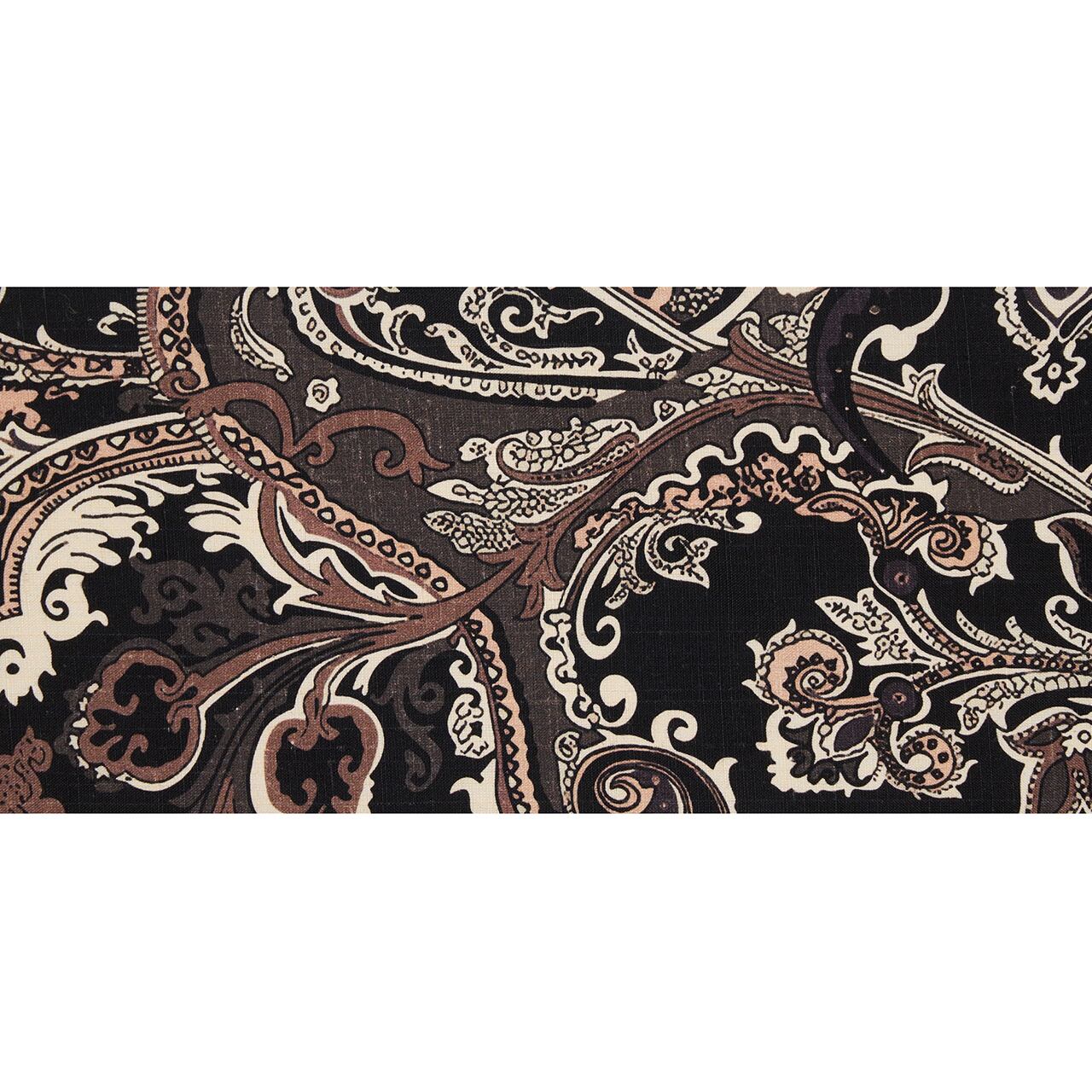 経緯に少しだけ節が見られるシャリっとした薄手の紬の生地が黒に染められ、大胆に大きく波打つように、象牙色と水柿色、江戸鼠色などでメリハリのある更紗の模様!が描かれた、とてもお洒落な全通の九寸名古屋帯です。