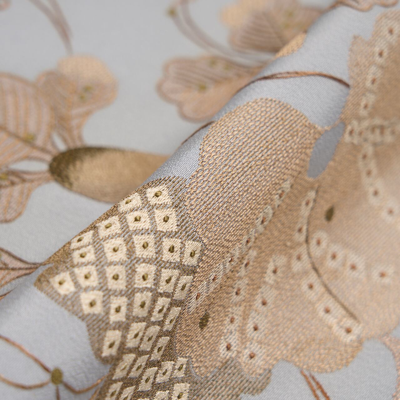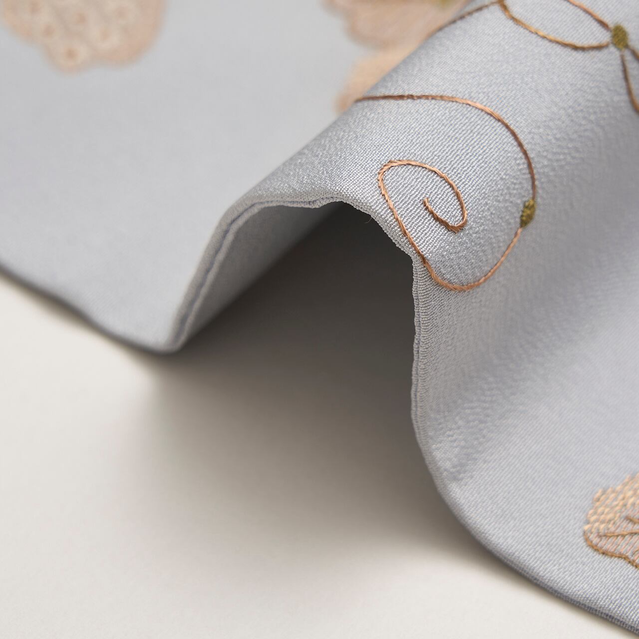 これほどの手間と時間をかけられた細やかな手刺繍ですが、白茶色や利休茶色、灰白色などすべて同系色でまとめられていて、こってりとはせずに気品のある佇まいとなっています。