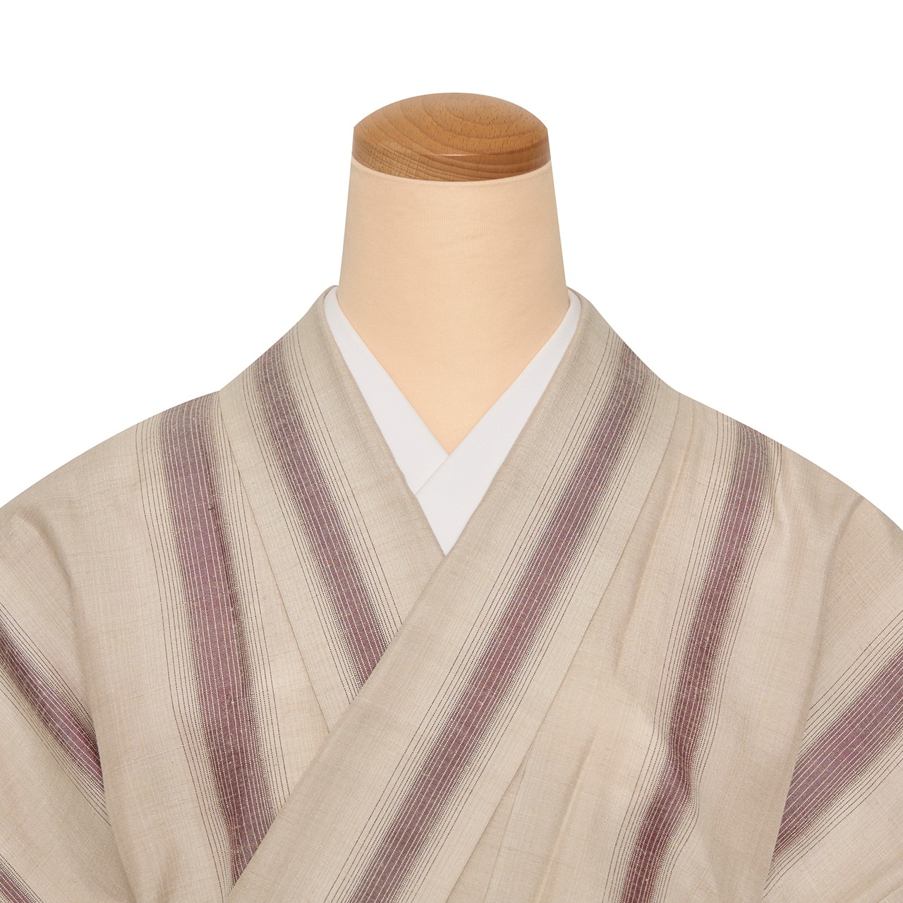 そこにグラデーションのように、密度を変えた葡萄鼠色の縞が織り込まれ、モダンさのある素敵なお着物となって完成しています。