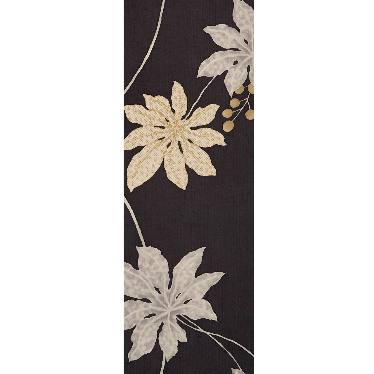 少しネップのような節の見られる、やわらかくしなやかな黒の紬ちりめんの生地のお太鼓に、大きなヤツデの葉が染め抜かれ、1枚は亜麻茶色で細やかな疋田模様が染められ、もう1枚は潤色の淡いグレーでにじんだような模様が染められ、傍らにはお花ものぞいている様子が描かれた、とてもお洒落な雰囲気の九寸名古屋帯です。