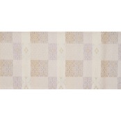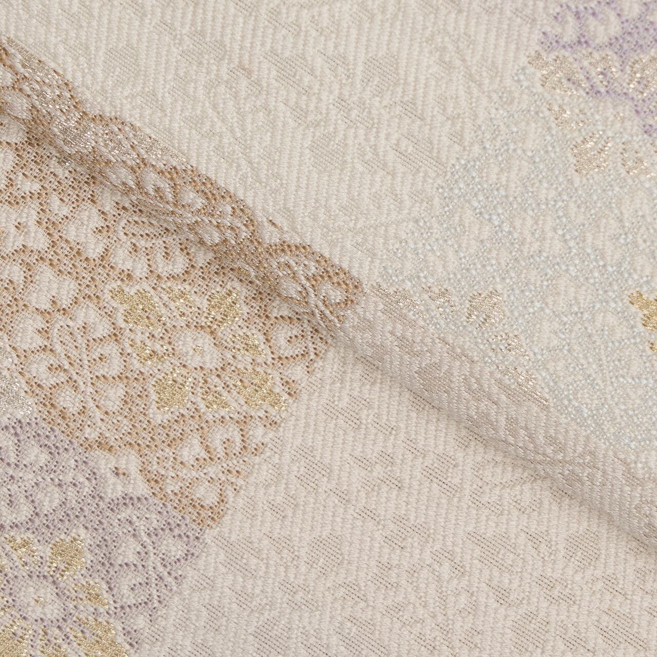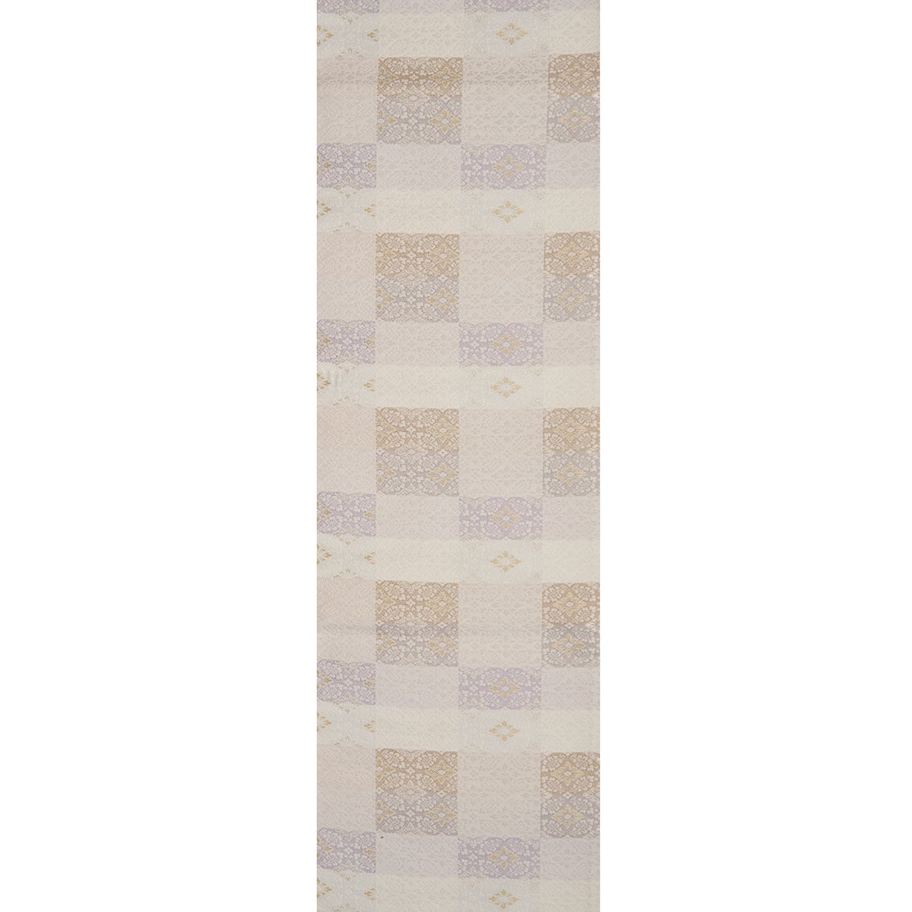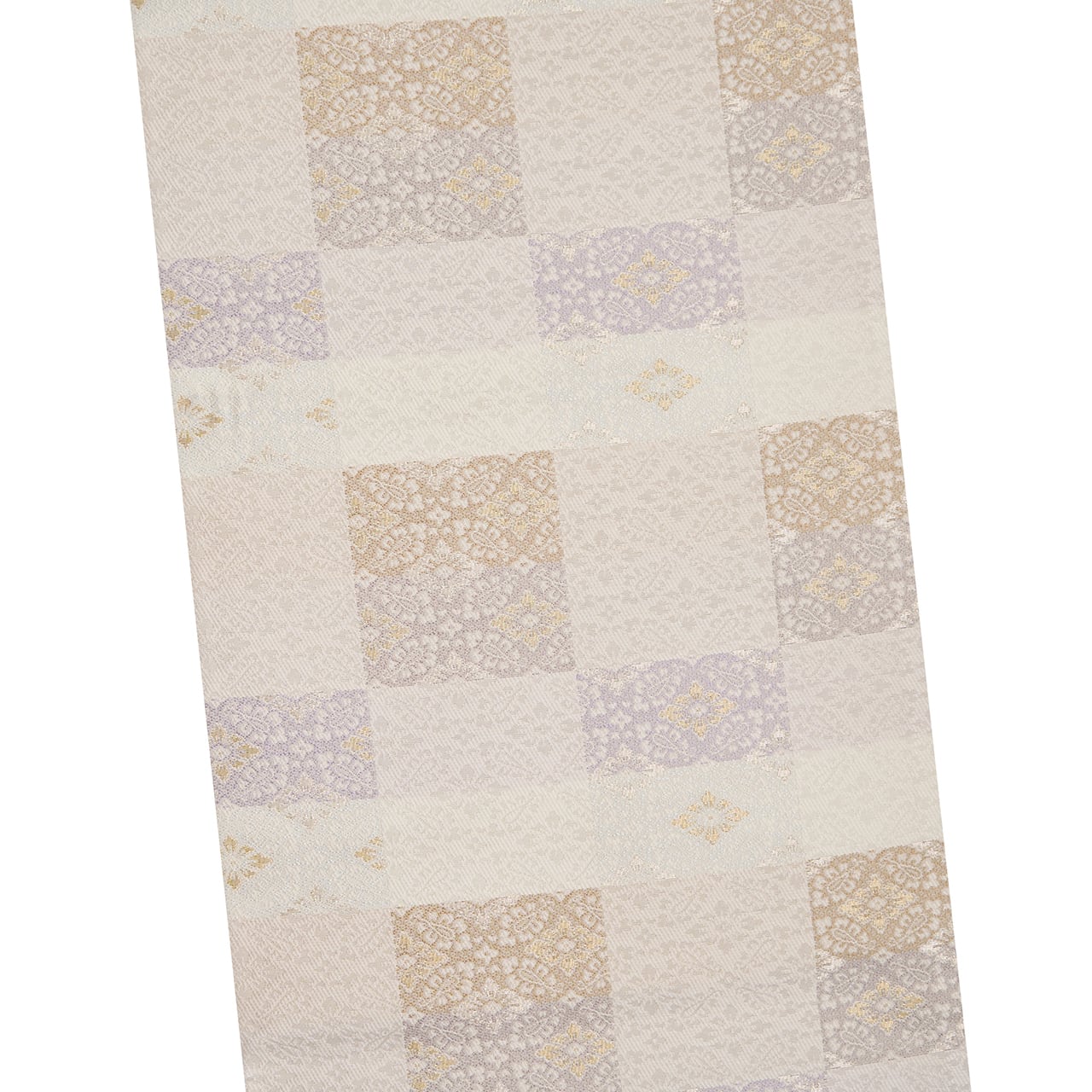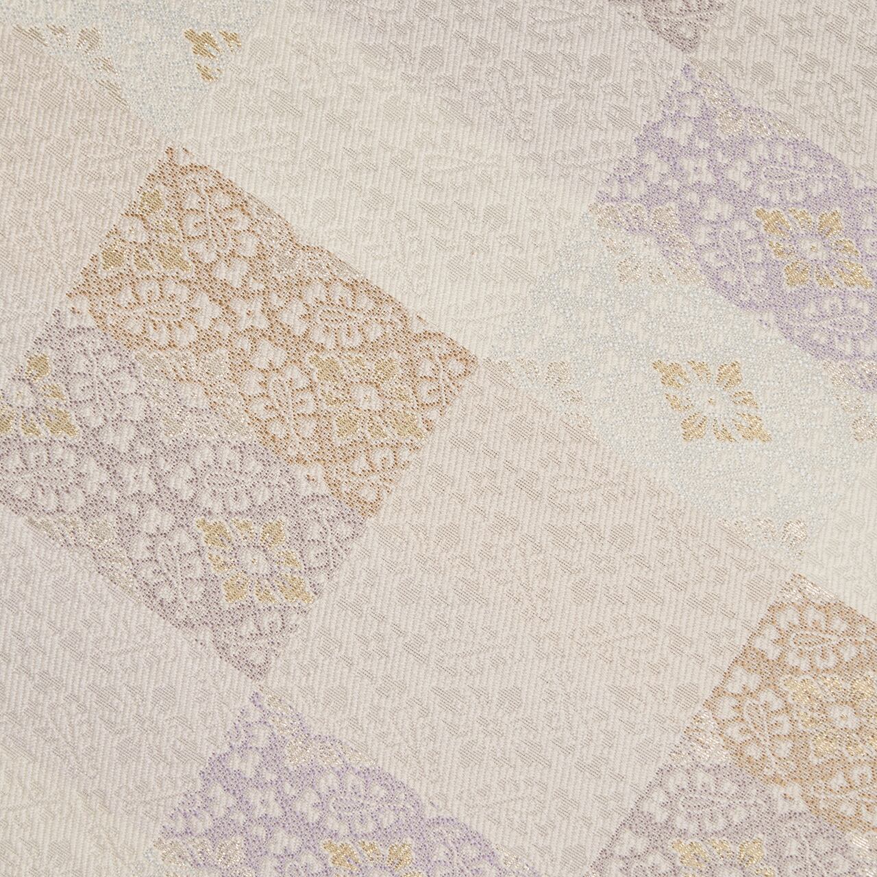 全体に中型よりやや小さめな小葵文様が織り出され、ひと幅が4分割された市松が取られて、鳩羽色の淡い薄紫や少しだけ赤味のあるグレー・鳩羽鼠色の四角が取られたり、地の生成り色に近い薄梅鼠色やとても薄いブルー・月白色なども配置されたりして、それが組み合わさって変り市松の模様を構成している、格調の高さの感じられる素敵な袋帯です。