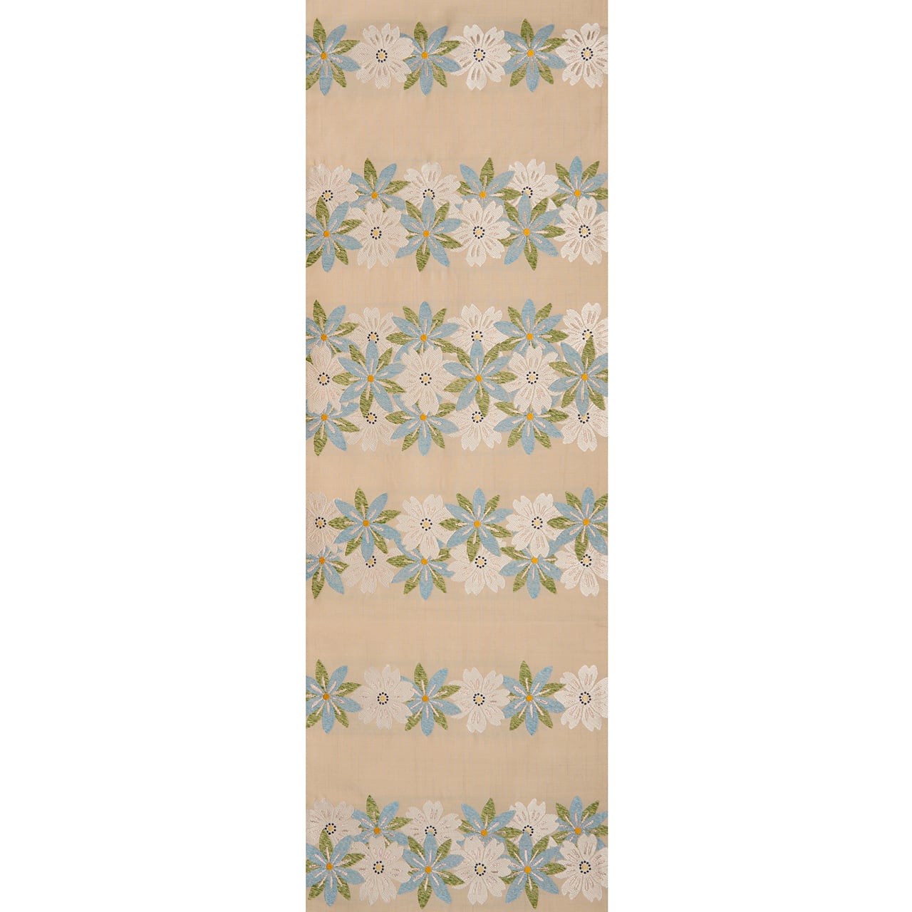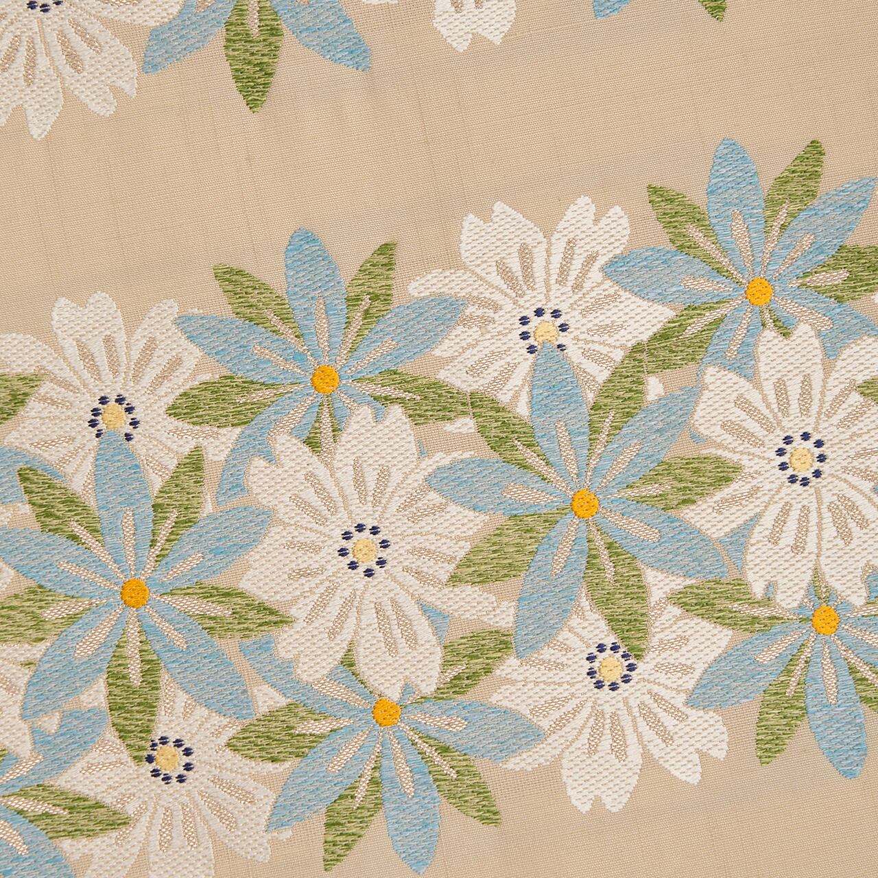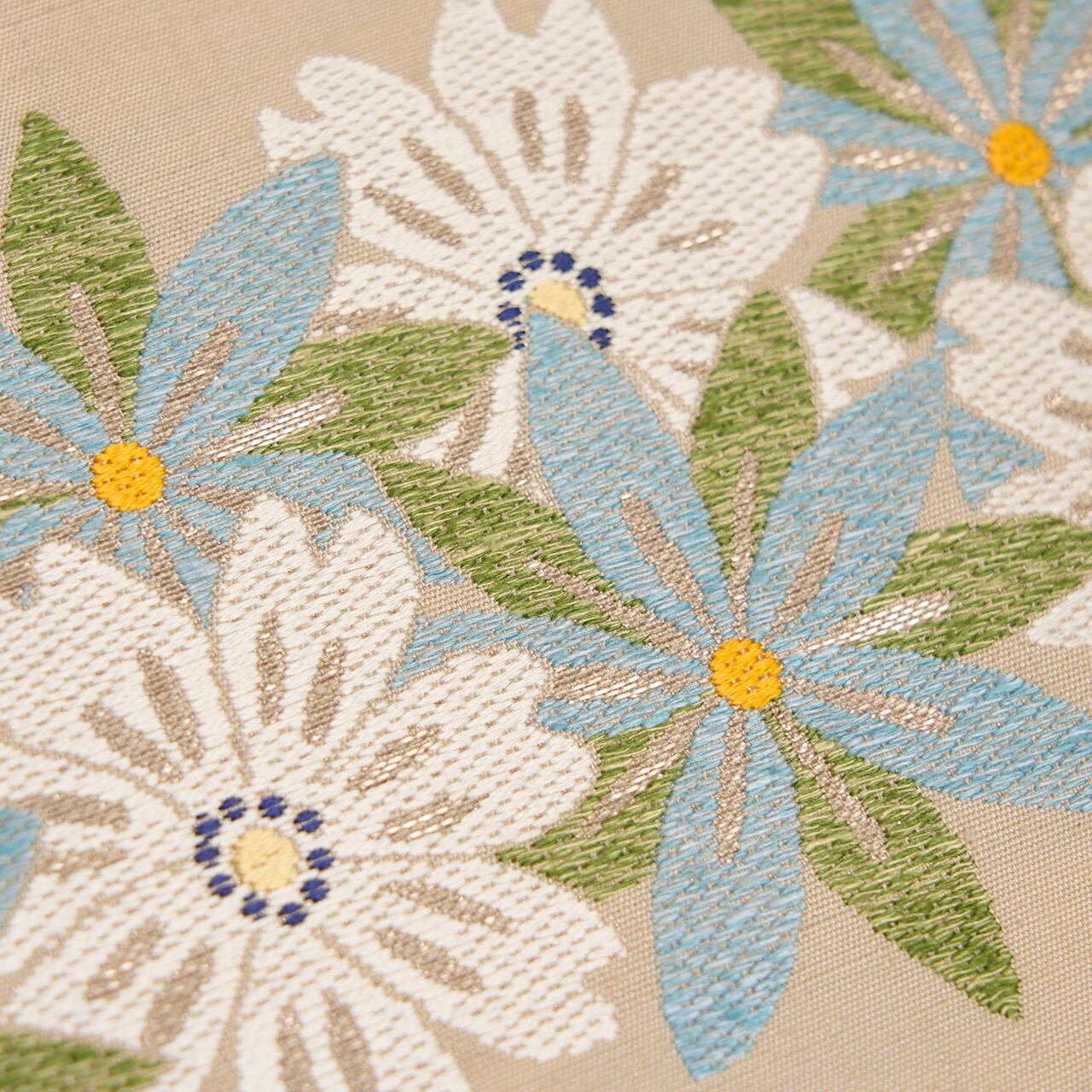 淡く明るめのベージュ・白茶色のしっとりとした生地に、段変わりに綺麗なブルー・浅縹色や青丹色の緑、生成り色などのお花が重なるように織り出された、とてもチャーミングな可愛らしさのある素敵な袋帯です。
