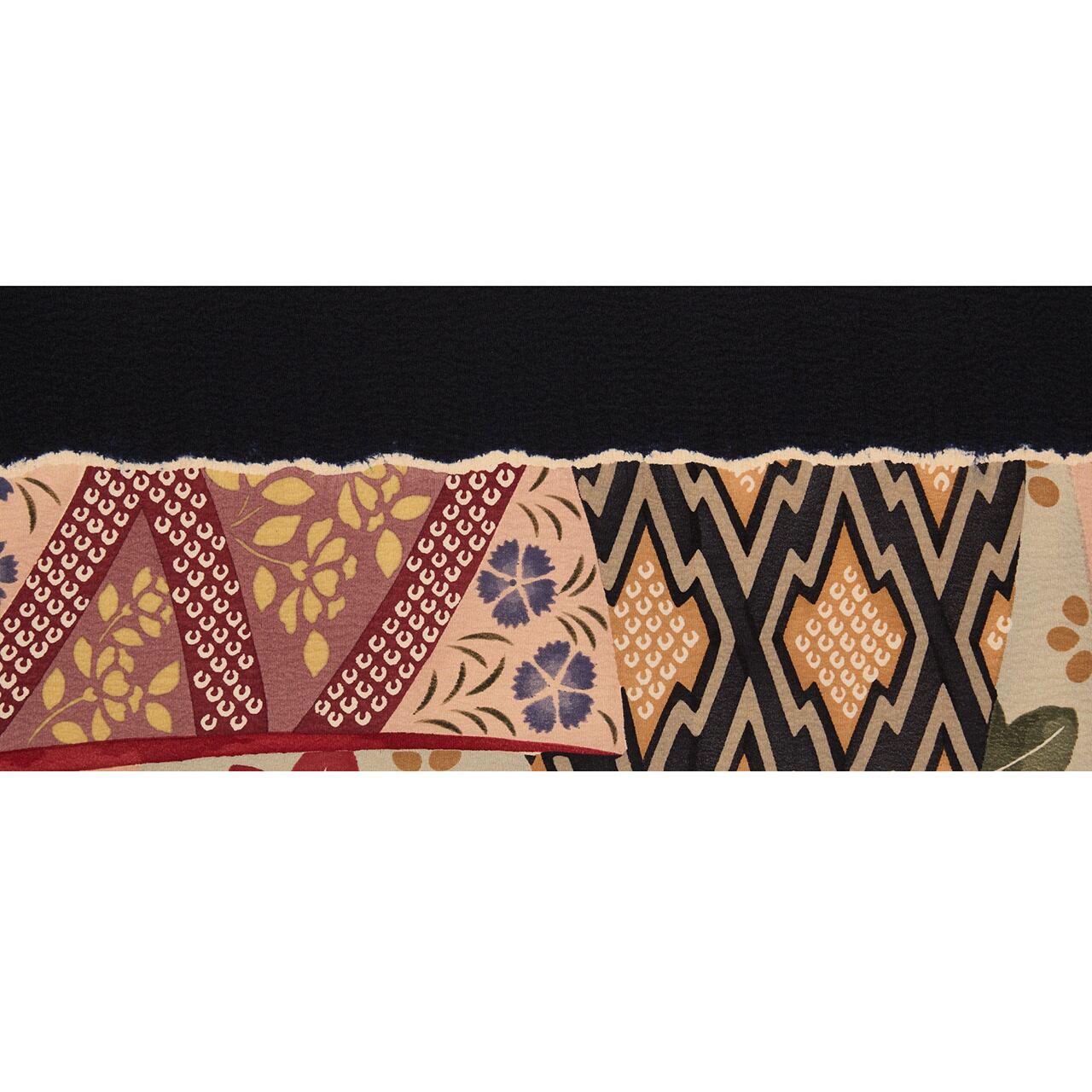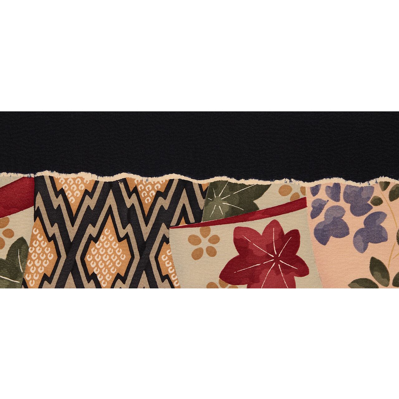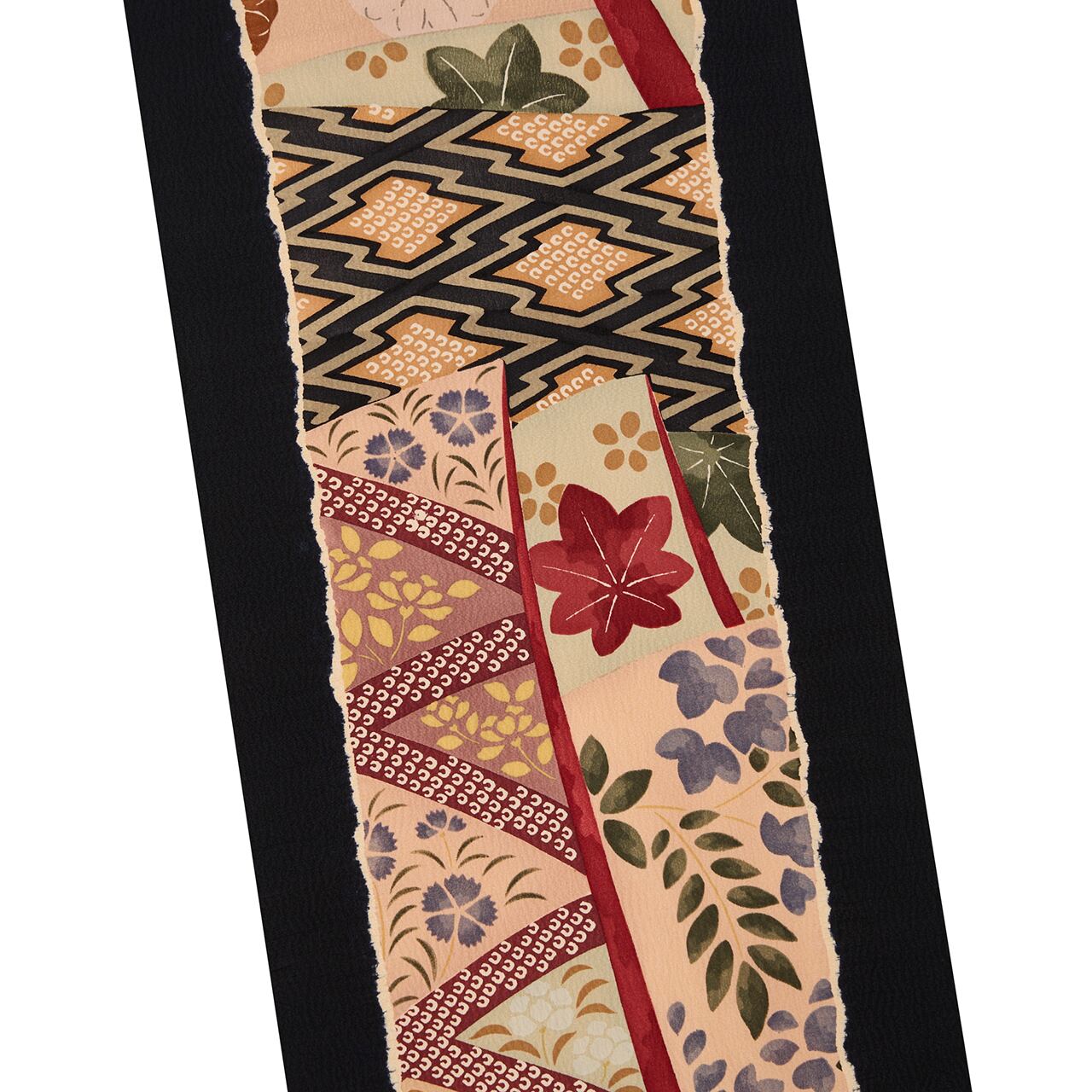 地染めの淡いピンク・水柿色と、両端の黒とのコントラストもエッジが効いていて綺麗ですが、その水柿色の地にも、蘇芳色や墨色、柳鼠色、鳩羽鼠色などでいろいろな草花が盛り込まれて、ボリューム感のあるものとなっています。