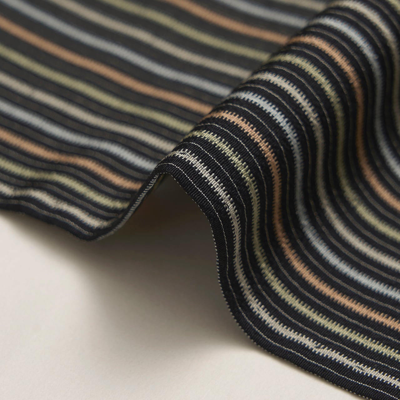黒の地に織り出された縞の模様もシンプルに見えますが、淡い水柿色、暁鼠色、絹鼠色、そして柳鼠色と、4色の糸が変り織になって織り込まれています。