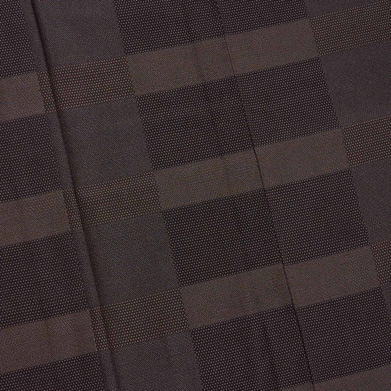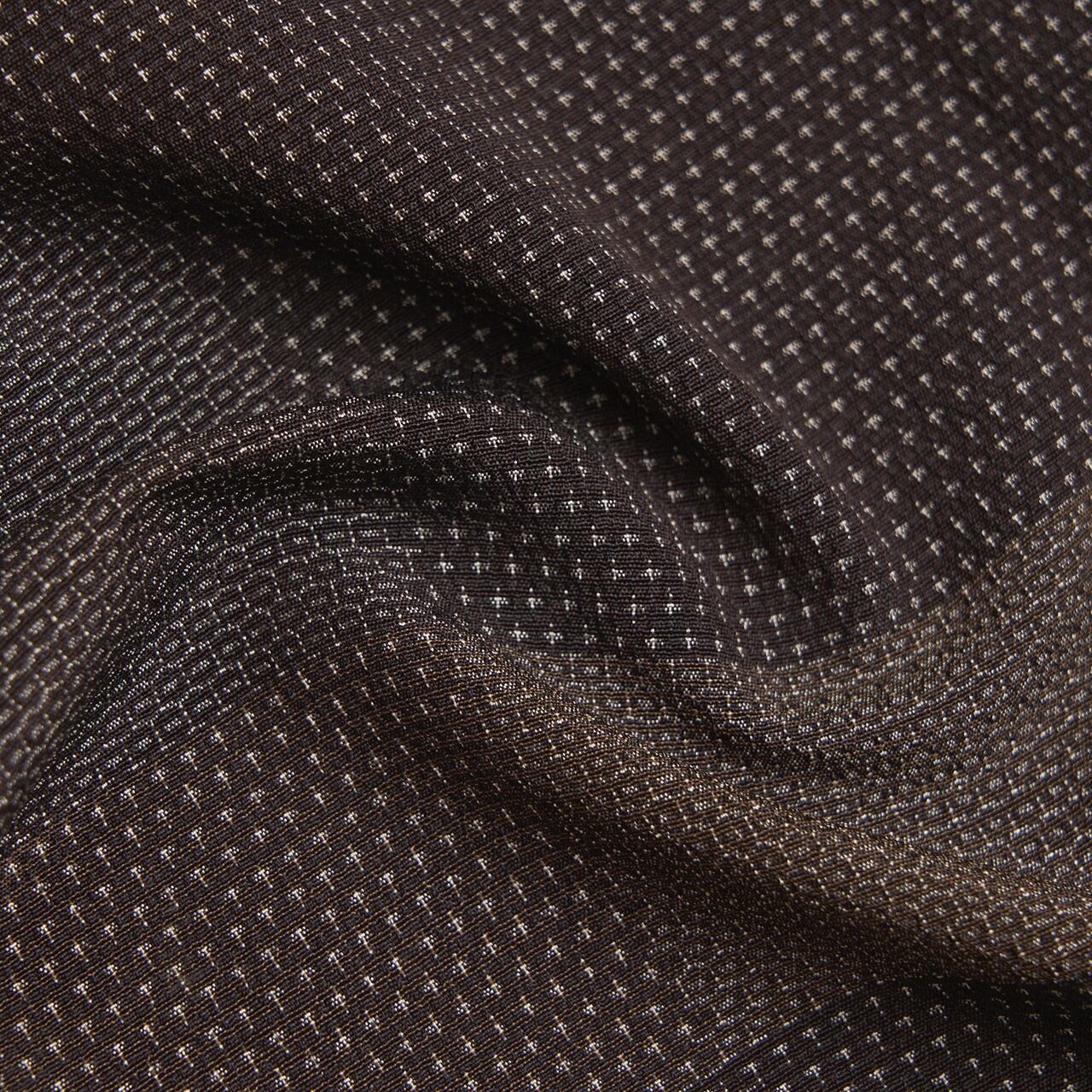 本場の塩沢お召ならではの、伸縮性と弾力性のある手触りの良い濃い焦げ茶・檳榔子染色の生地に、それよりやや薄い焦げ茶・涅色で変り市松が取られ、ひとつにはとても小さなカ絣が、もうひとつには小さな亀甲の絣が織り込まれてニュアンスのある表情となった、とてもお洒落な単衣のお着物です。