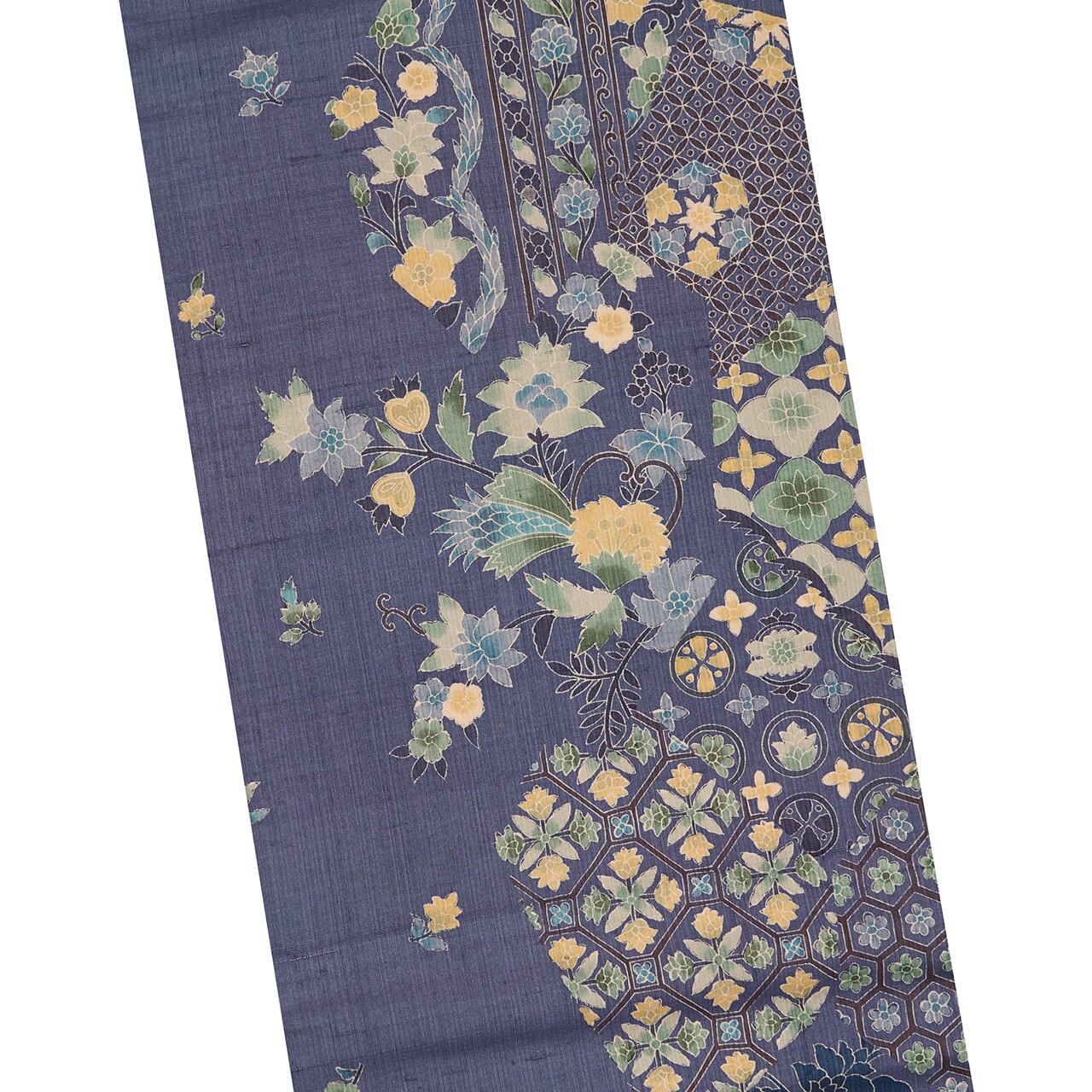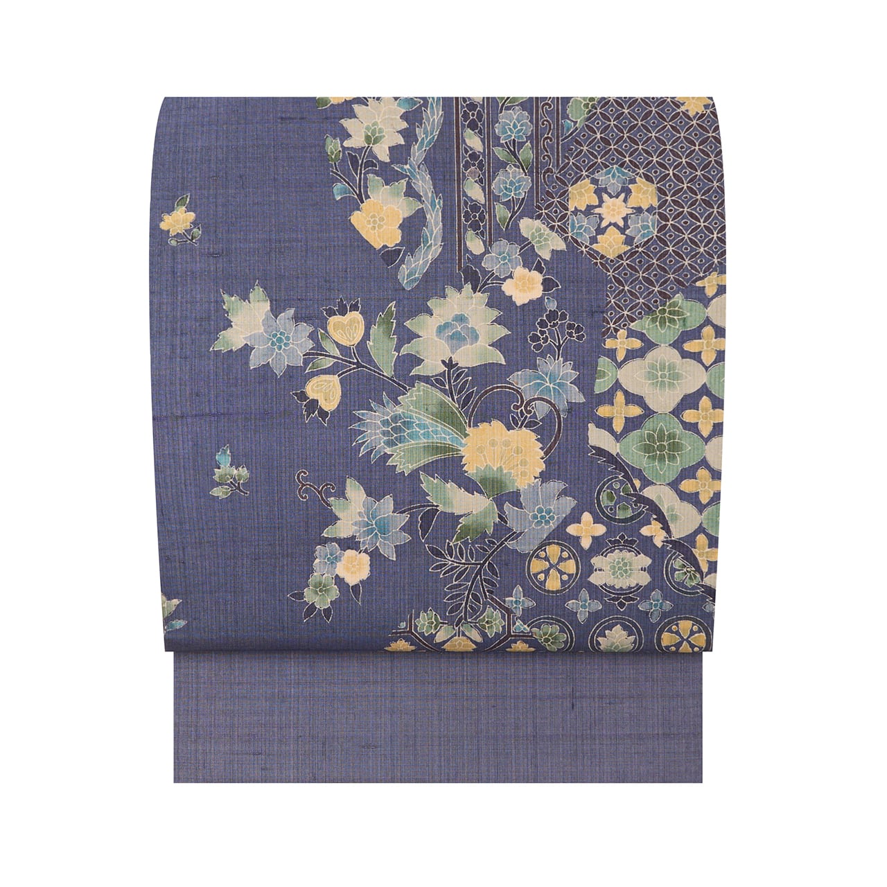ところどころ横に節の見られる、やや薄手のさらりとした紬地が、紫味のある藍・濃鼠色に染められ、裂取りのように亀甲や菱形に区切られたところに、花唐草や七宝繋ぎ、花菱、丸紋、亀甲模様などいろいろなパターンの更紗の模様が染められた、すっきりとしたお洒落感のある素敵な九寸名古屋帯です。