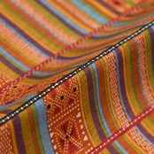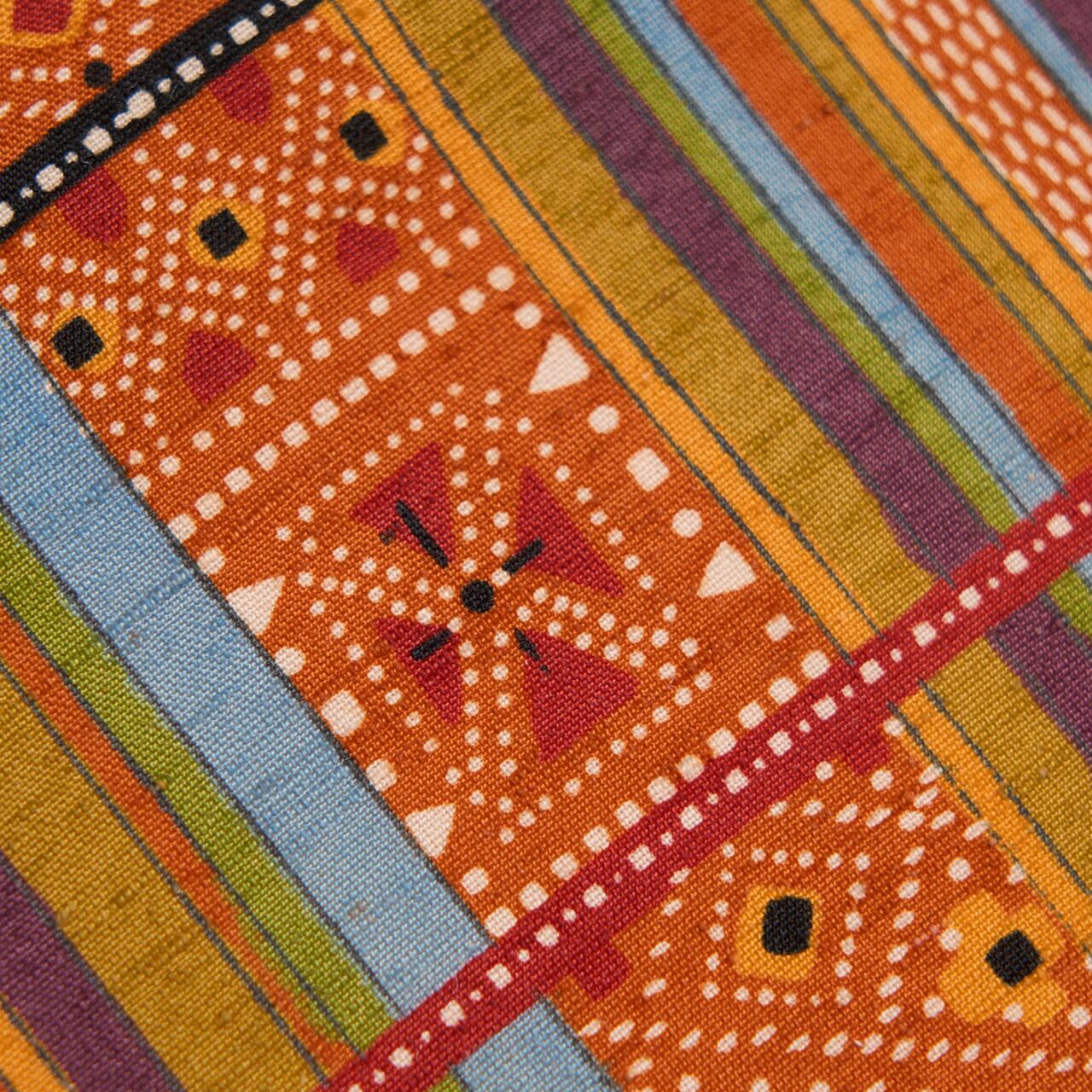 染め帯ではありますが、模様としてはラオスやミャンマーなどの織物を思わせるようなもので、また色使いはインドネシアのバティックのソガ染料のような印象もあり、どこかアジアンテイストの感じられる不思議な雰囲気を持っています。