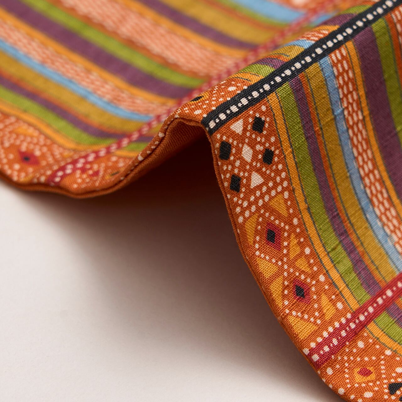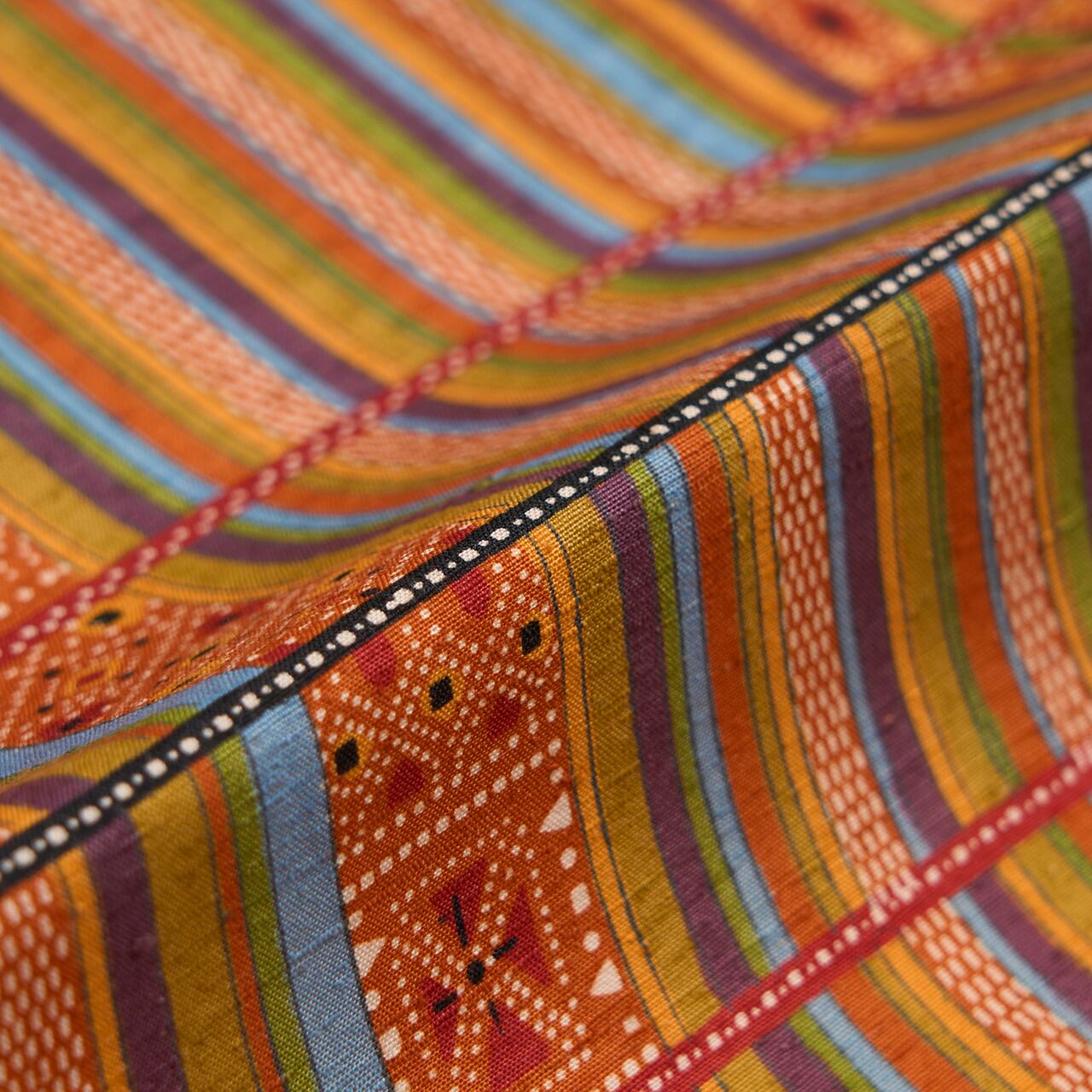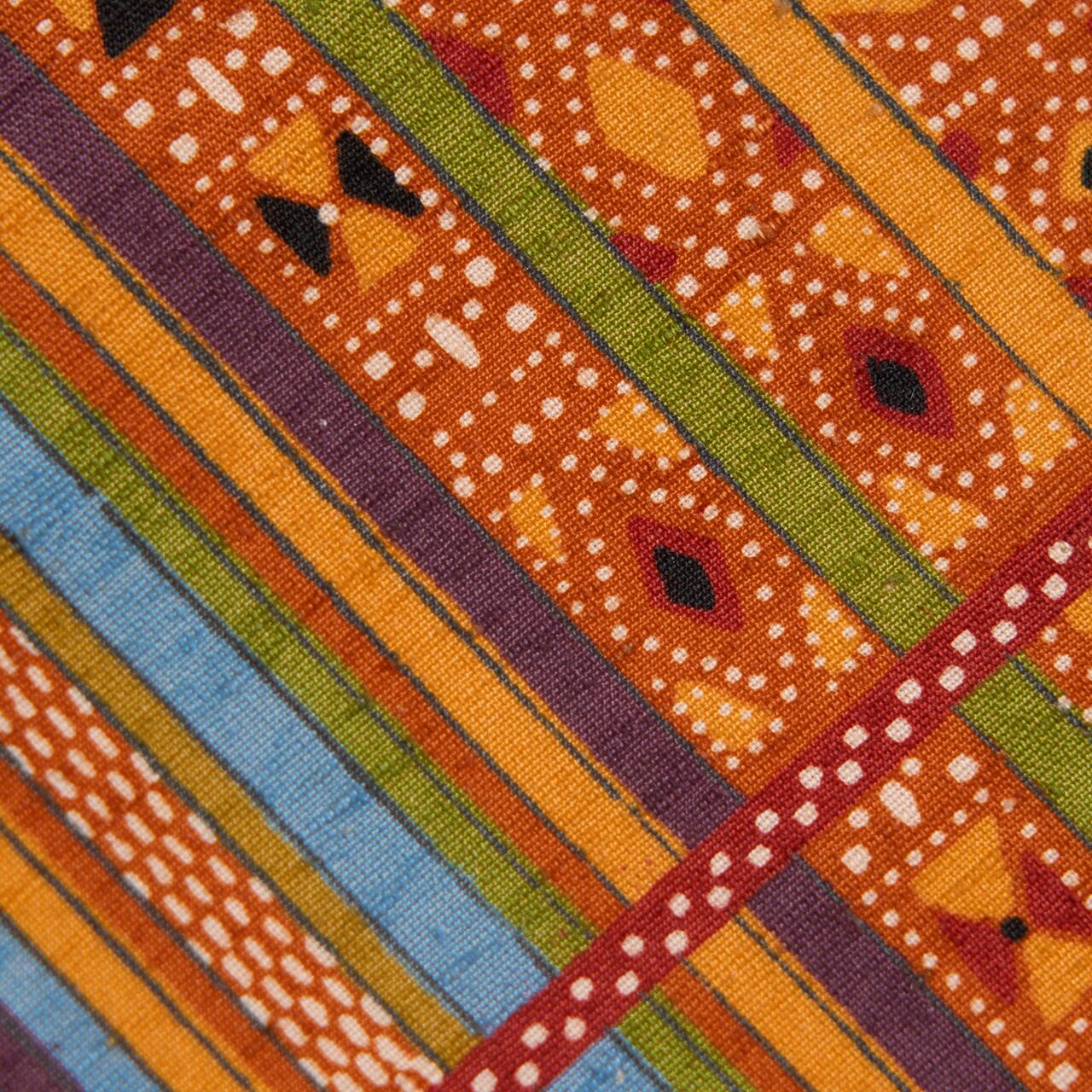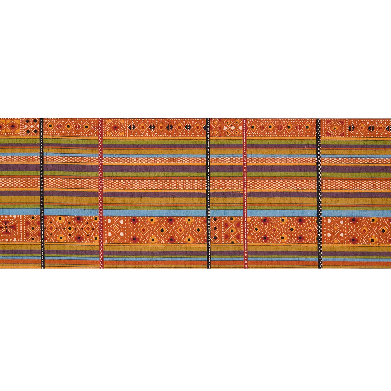 結城機のようなふっくらとしながらもシャキッとした質感の上質な紬地が、オレンジ味のある赤茶・代赭色に染められ、タレの無地の部分以外全体にいろいろな色の縞模様と、その間に網目のような模様や更紗の模様が細やかに染められた、どことなくエスニックな雰囲気の漂う素敵な九寸名古屋帯です。