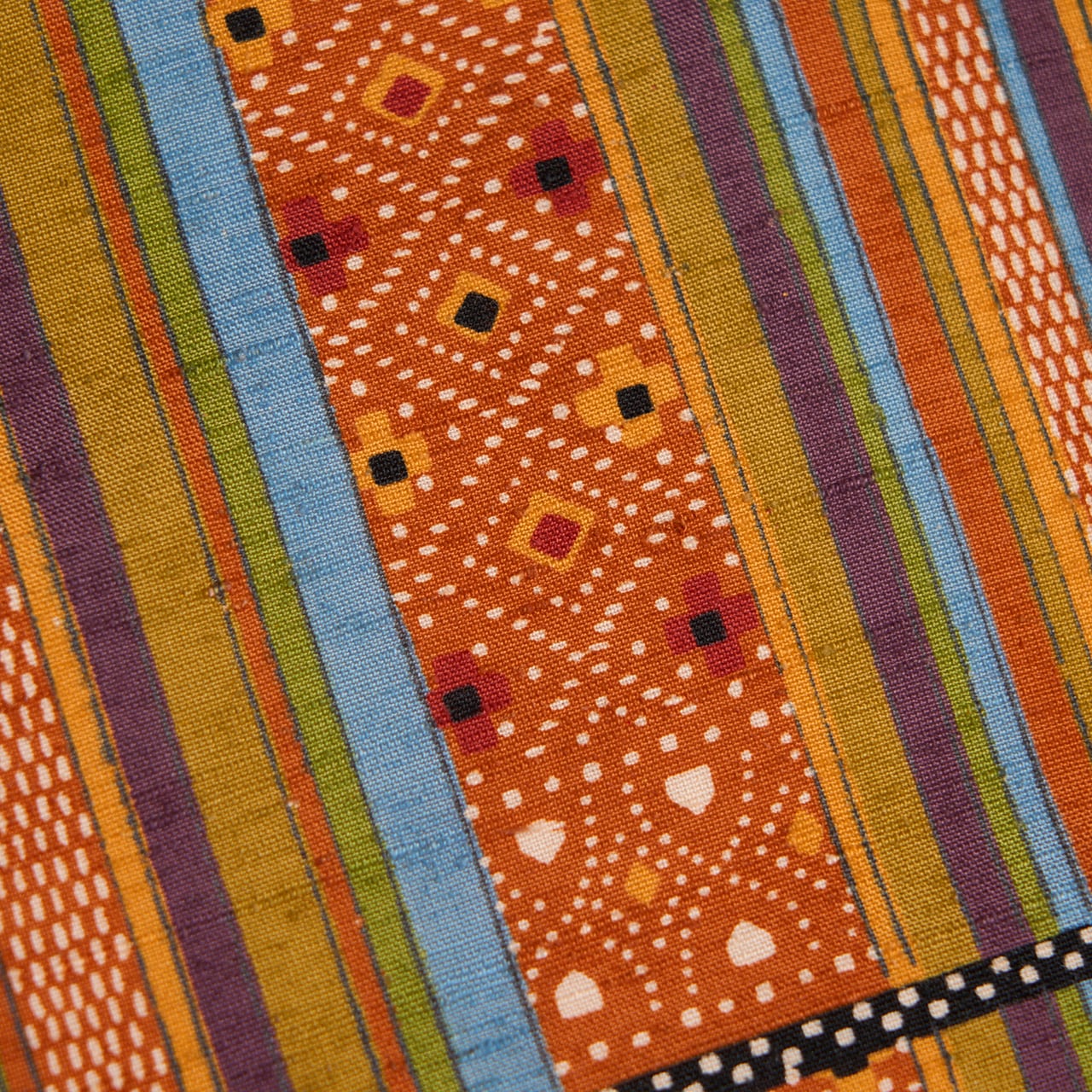 縞は青朽葉色の緑、青藤色の水色、紫鳶色、飴色の黄色などで表され、その間の更紗模様も象牙色や紅鳶色、黒などで染められています。