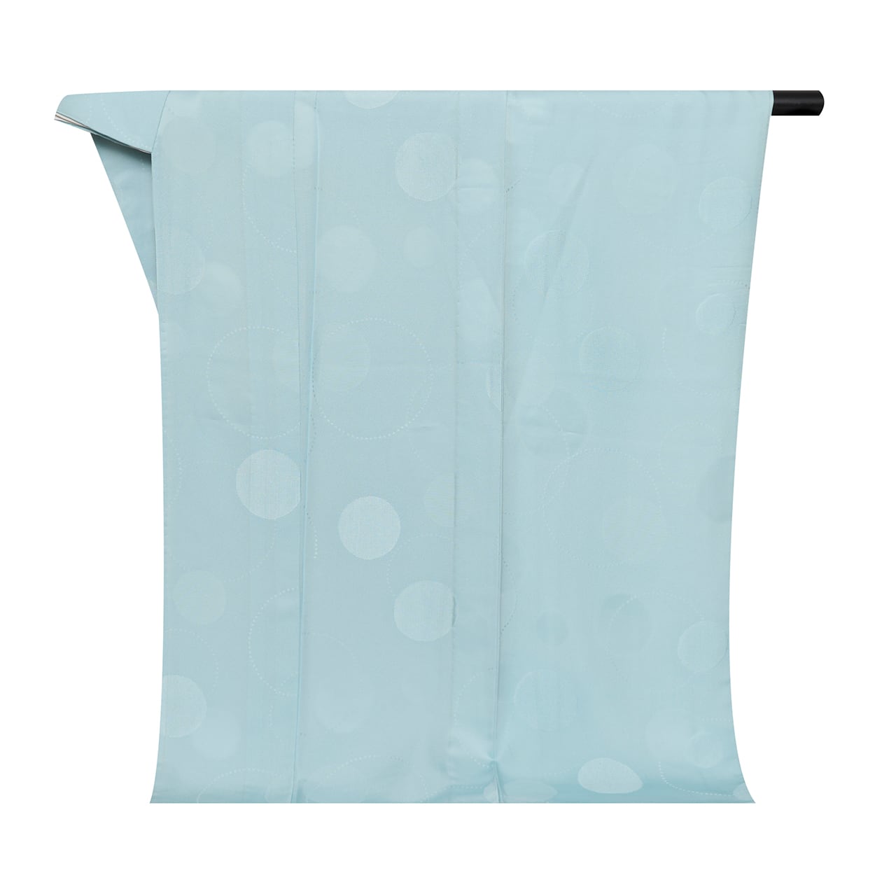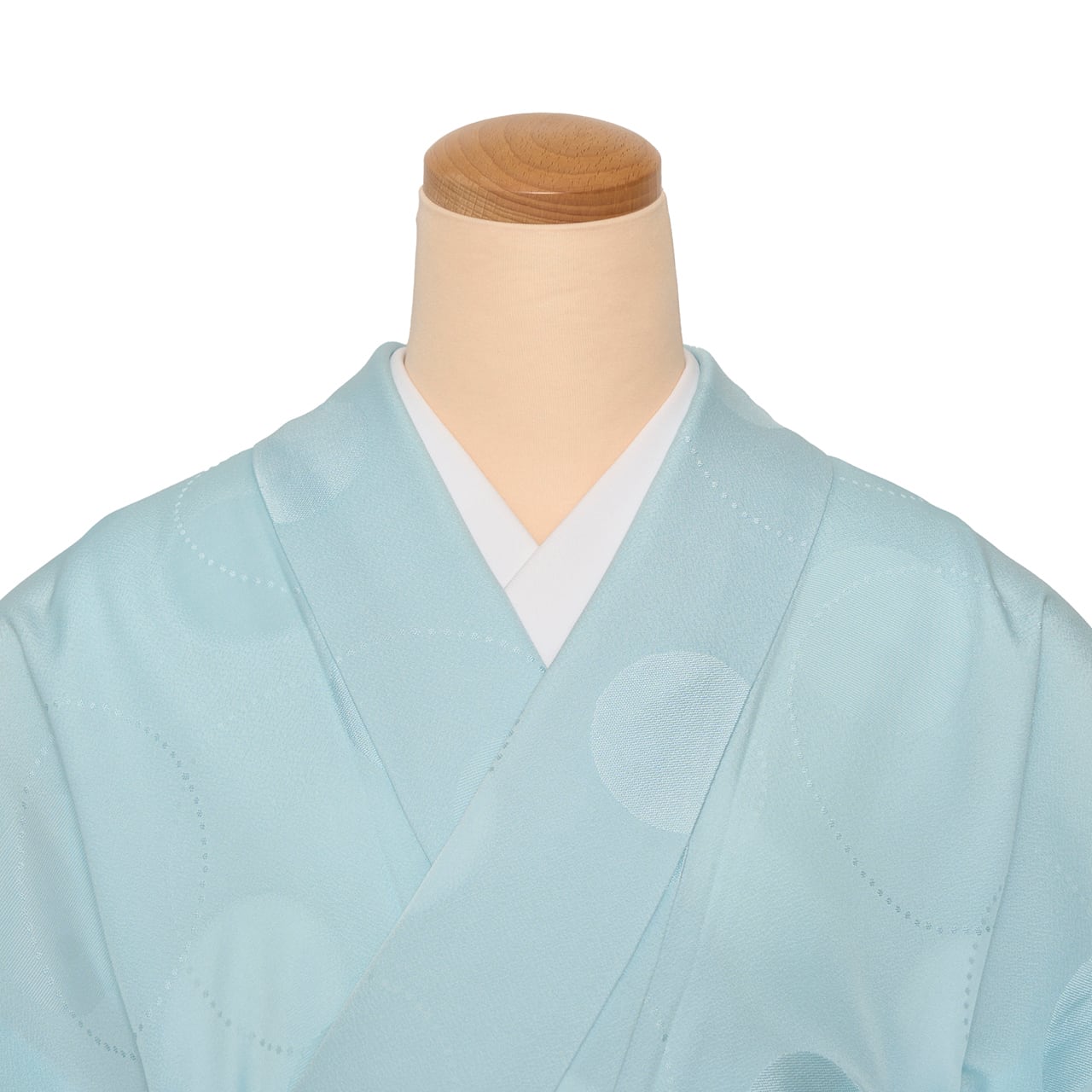 伊と幸さんの国産の丹後ちりめんのしっかりとした生地が、淡い水色・瓶覗色に染められて、地模様は光沢の違う大きめの水玉が織り出されていて、それにさらに点々で表された大きな丸が重なるように織り込まれた、リズミカルでお洒落な雰囲気の無地の単衣のお着物です。