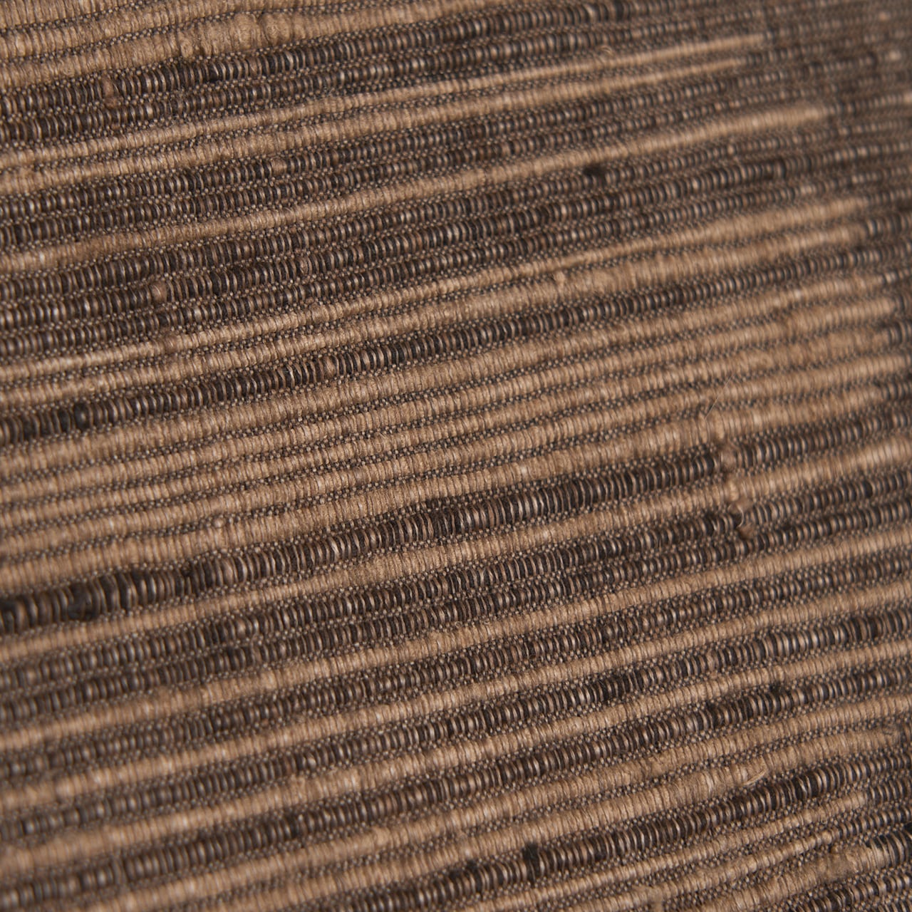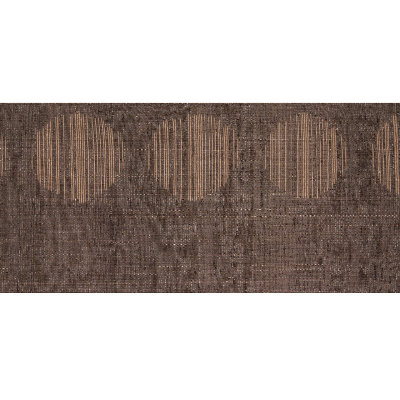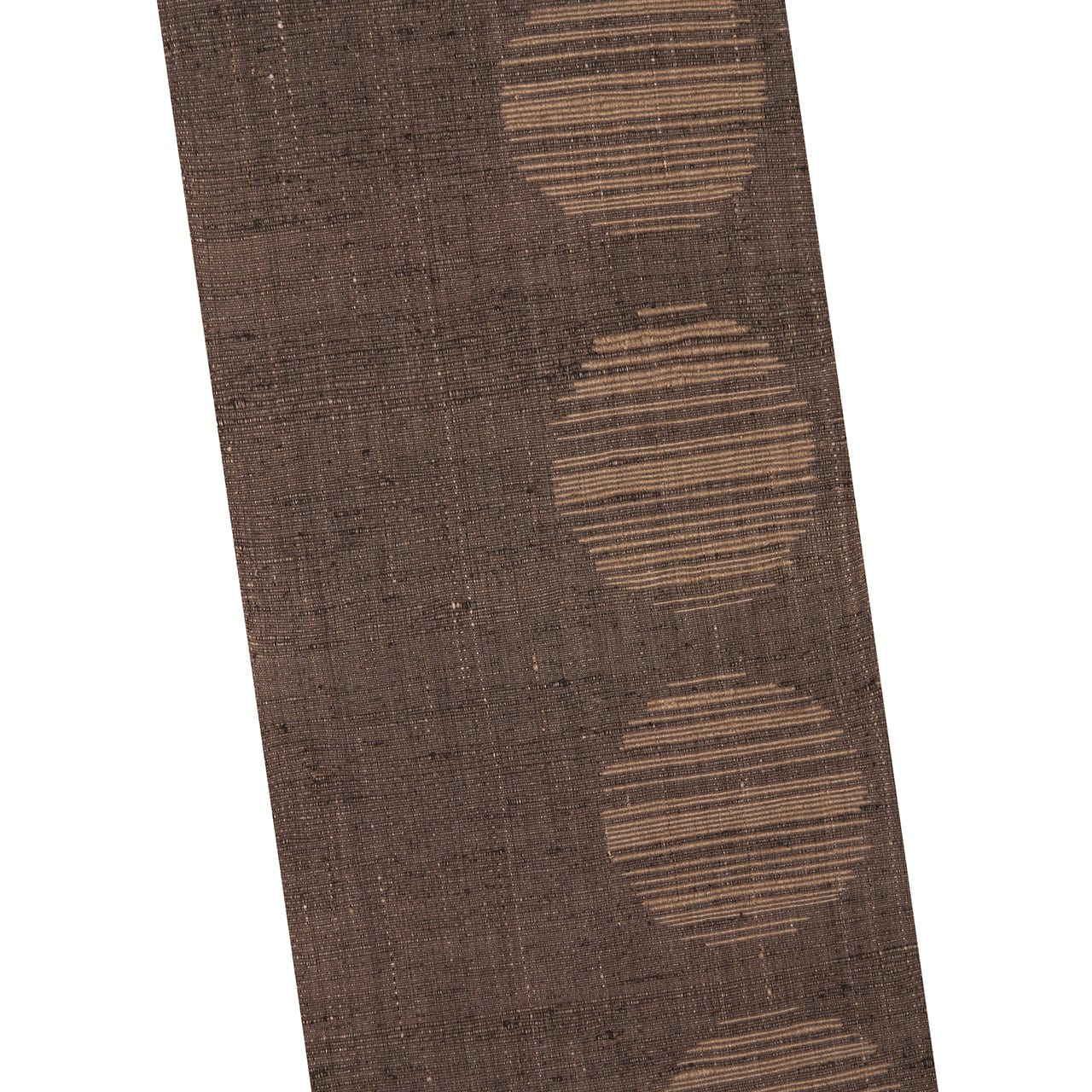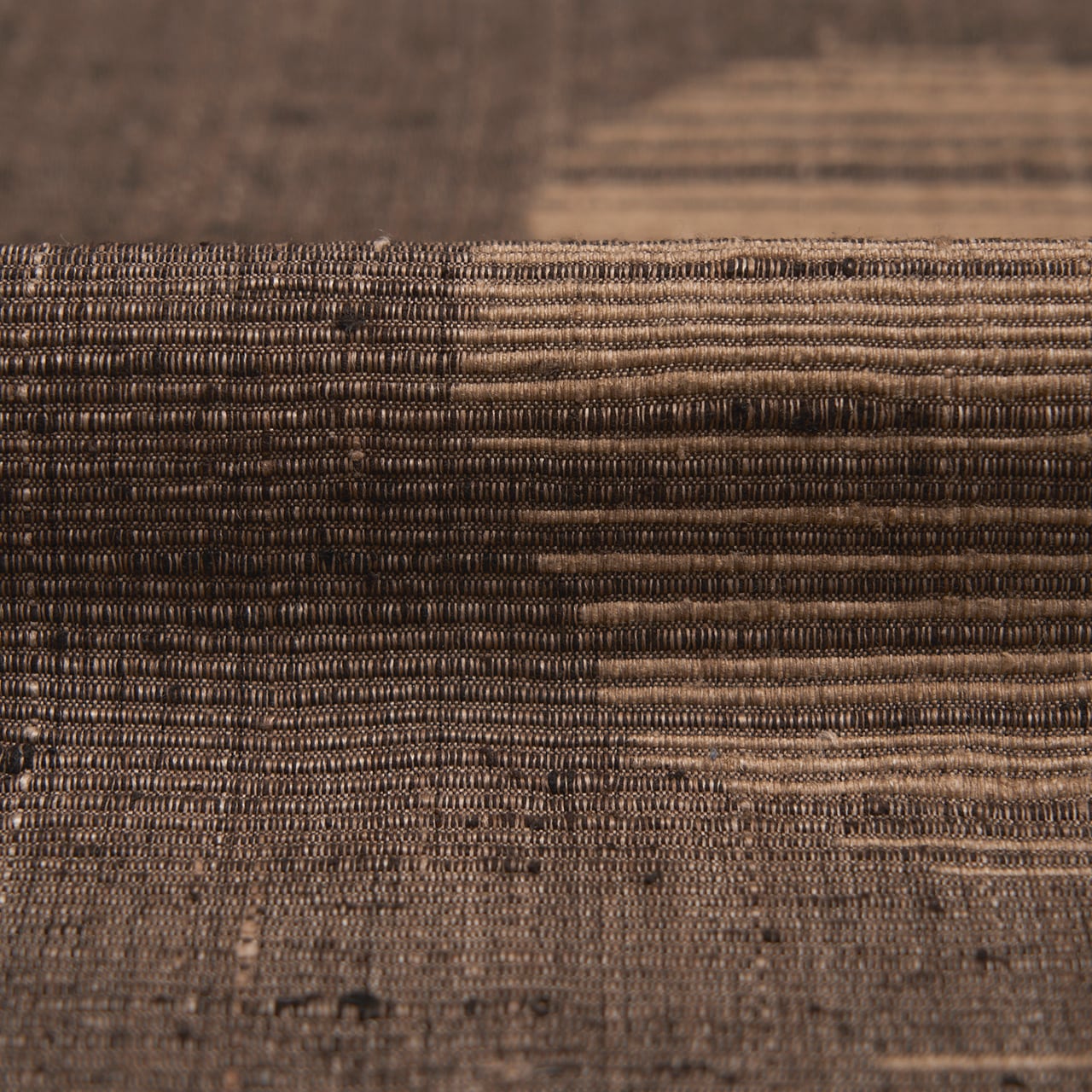 グレー味のある茶・煤色の地に、お太鼓の右寄りに大きめの円が取られ、胡桃染の淡いグレーベージュの糸でその円をうめるように横縞が織り出された、味わいのある素敵な八寸名古屋帯です。