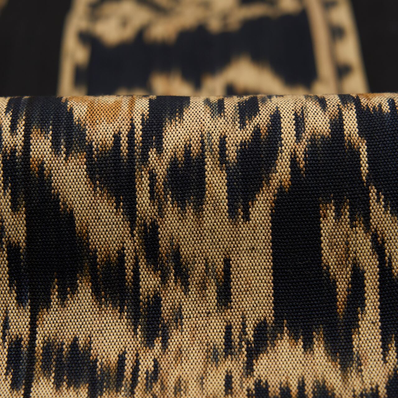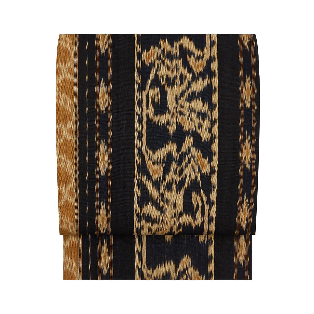 ほとんど黒に近い濃い茶色のざっくりとした木綿の生地に、琥珀色や練色の糸で縞が織り出され、中心の太い幅のところには抽象的な草花か静物のような模様が絣で織り出された、イカットならではの特徴的な模様の素敵な九寸名古屋帯です。