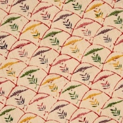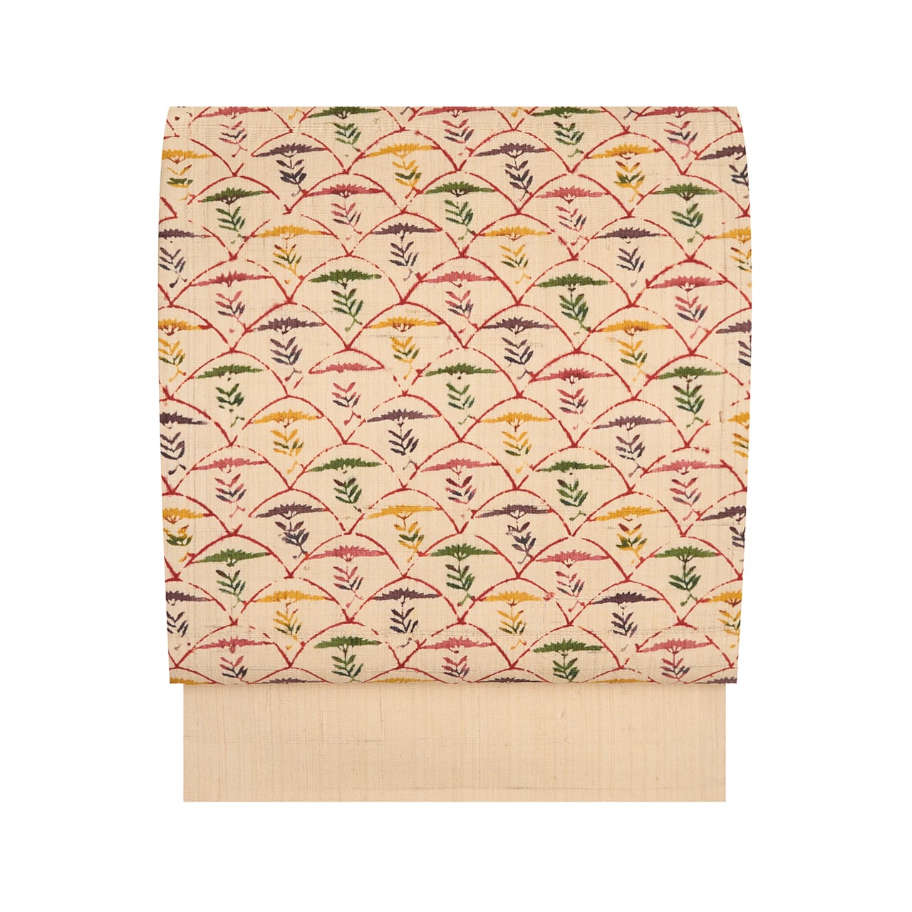 緯糸にざっくりとした節のある練色の座繰りの紬地に、お太鼓には濃紅色で青海波の模様が取られ、その中には菊のようなお花が横から見た姿で描かれ、山吹茶色の黄色、蘇芳香色、緑青色、黒鳶色などいろいろな色を使って染められた、とてもチャーミングな素敵な型絵染の九寸名古屋帯です。