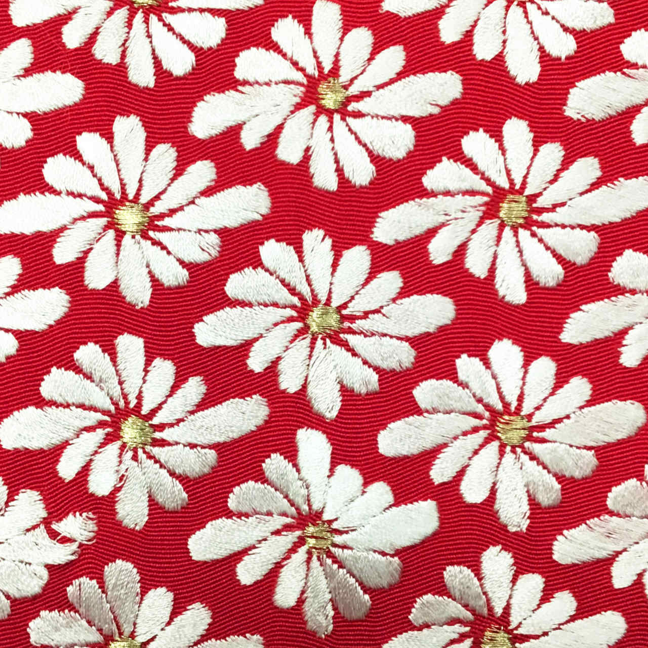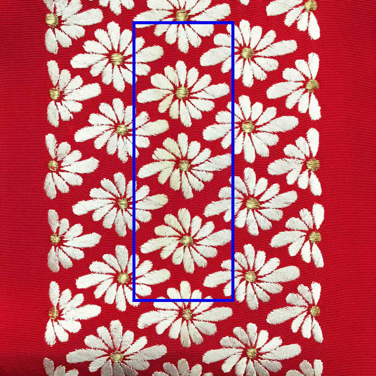 鮮やかな赤色の地に乳白色と金糸で菊尽くしの刺繍がされた半衿になります。