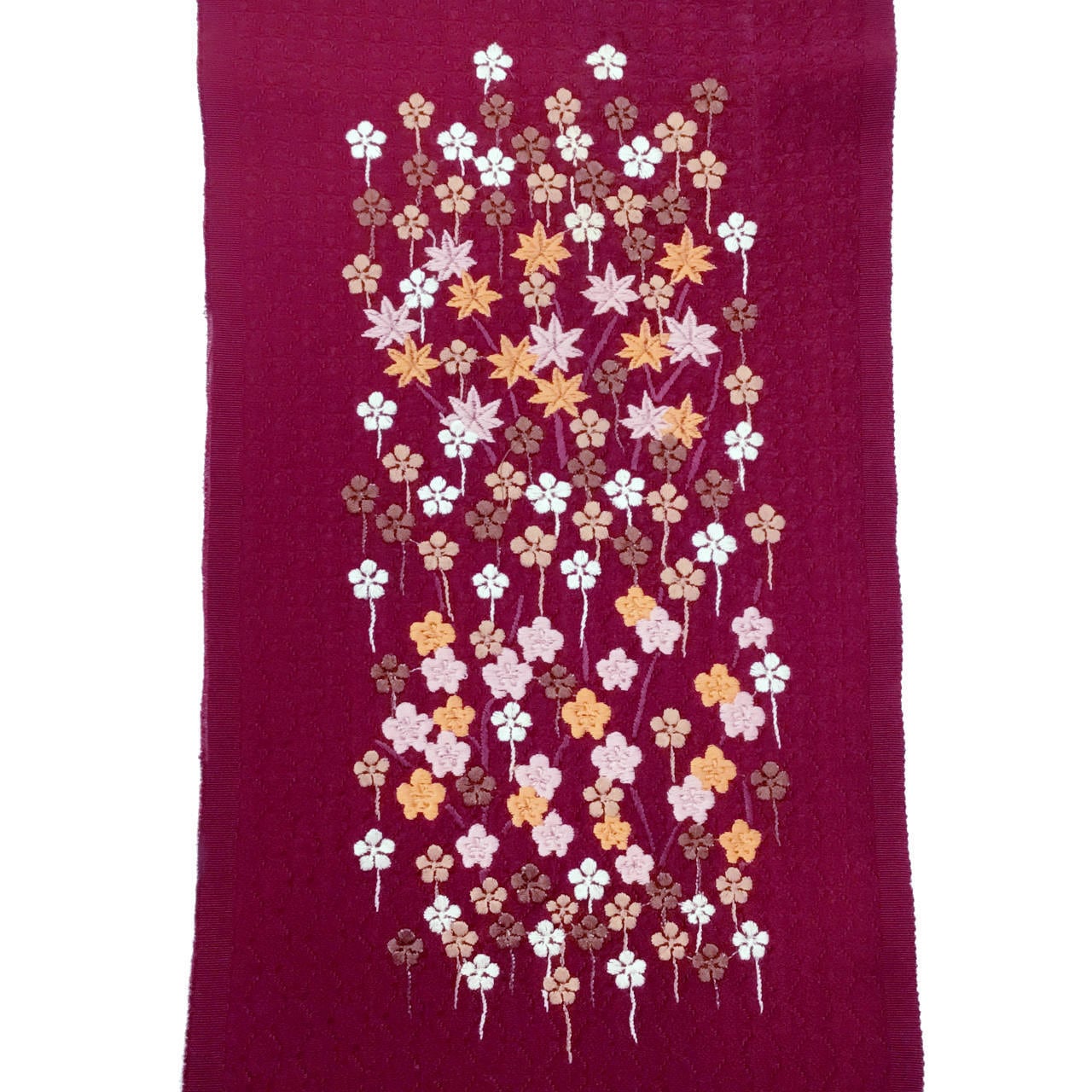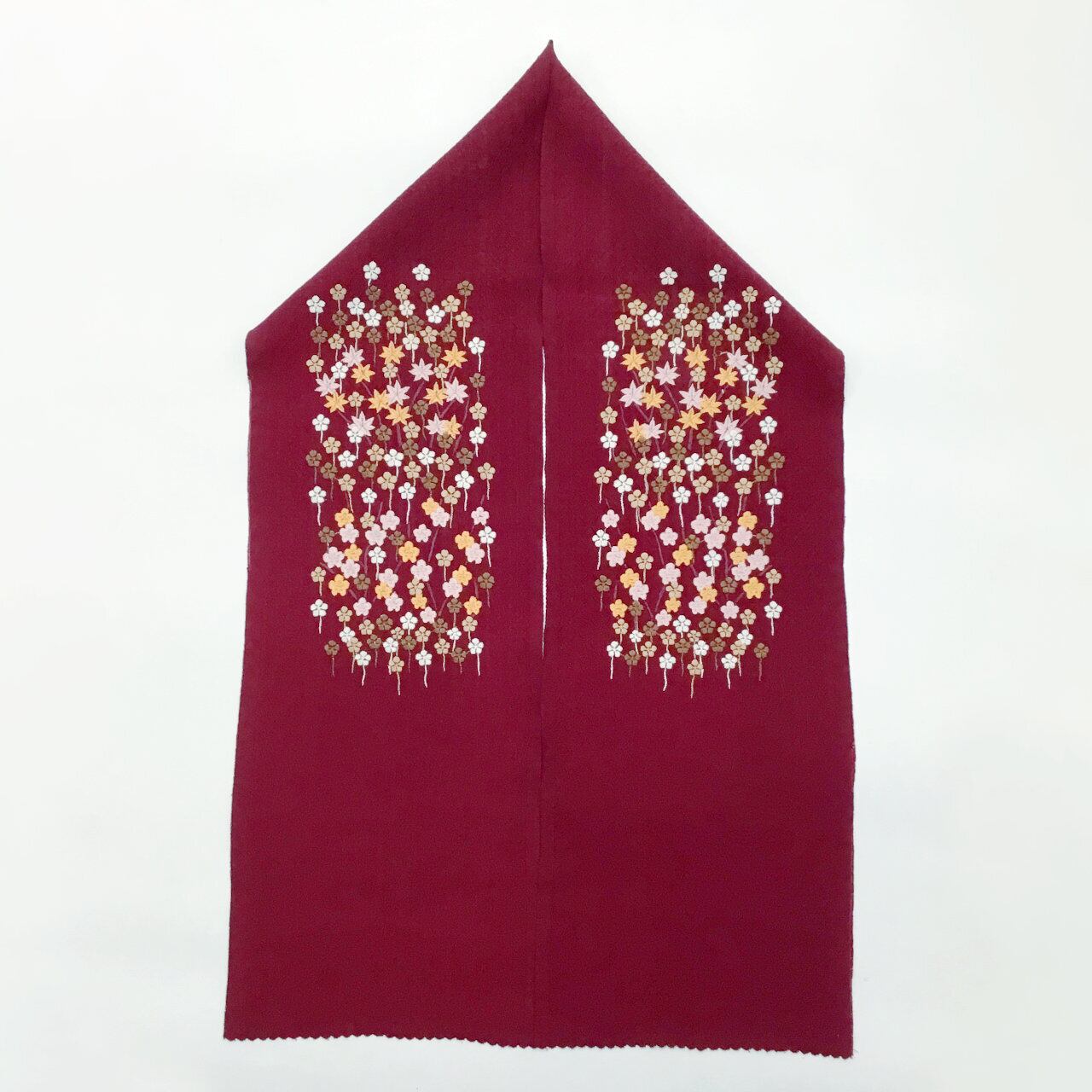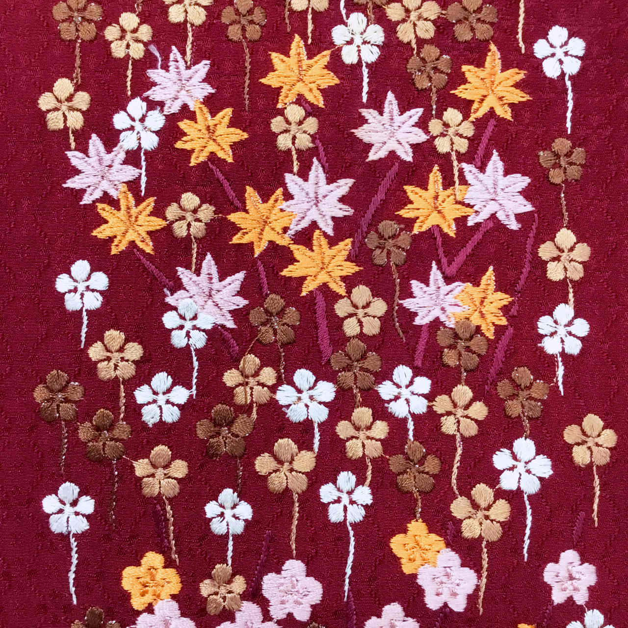 葡萄色の菱形の地紋地に茶褐色、柴染色、金茶色、虹色、白練色で様々な小花模様が散りばめて刺繍された半衿になります。