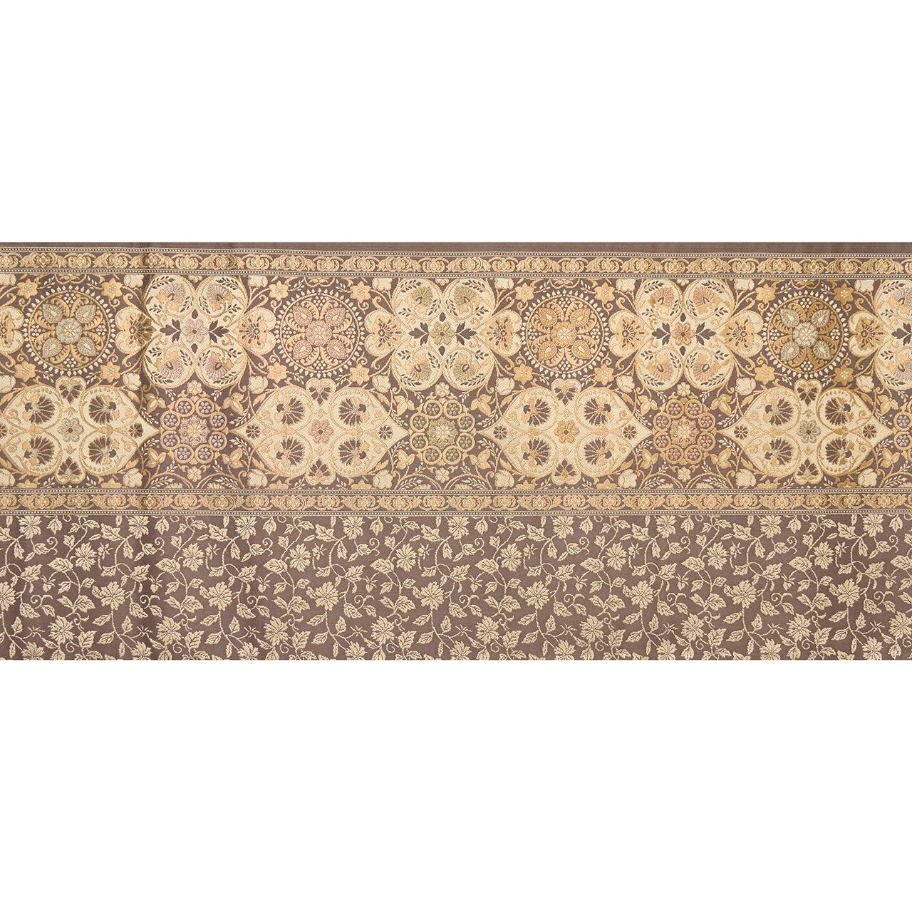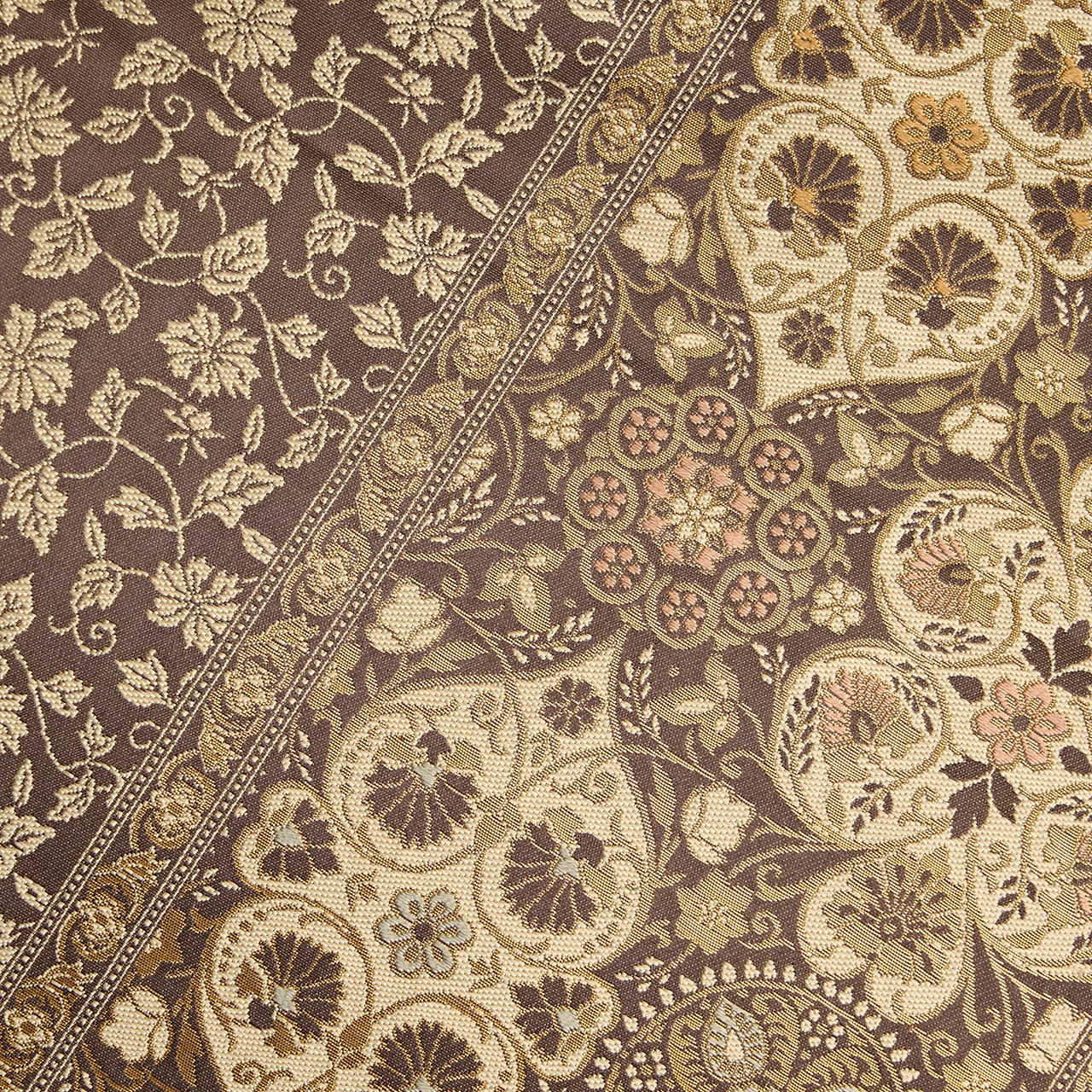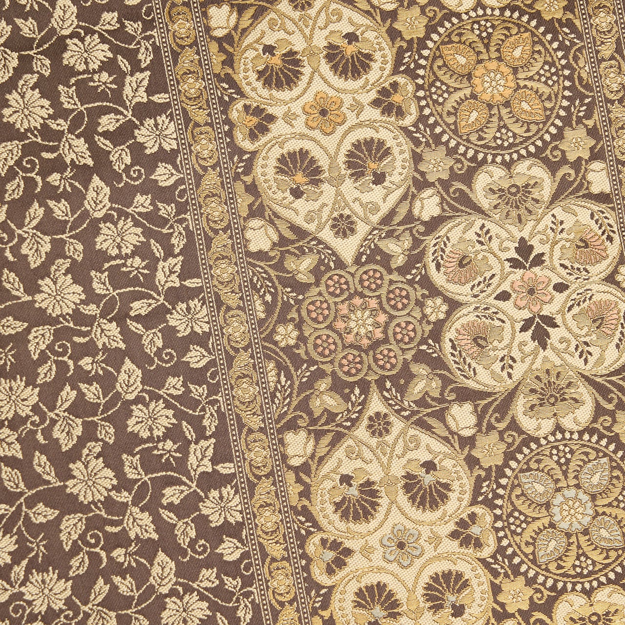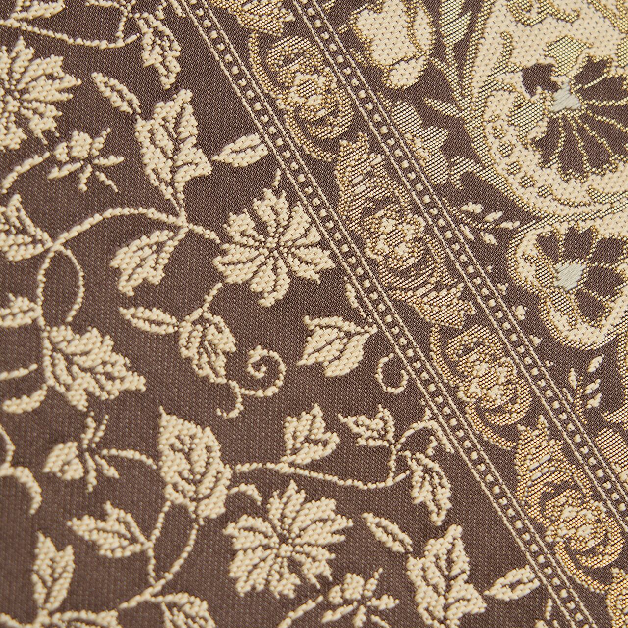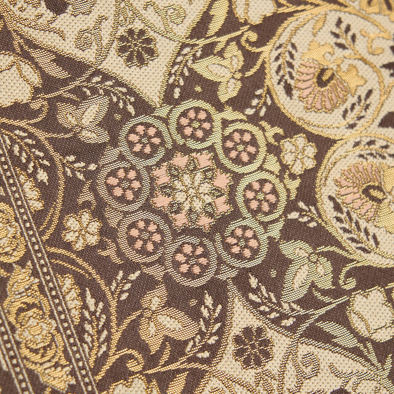 グレー味のある焦げ茶・檳榔子染色の地に、お太鼓の真ん中寄りと左寄りと右端に花唐草の模様が入ったボーダーが取られ、ボーダーで区切られた左側には灰白色の光沢の少ない糸で、また別の花唐草の模様がびっしりと織り出され、右側にはクローバーや葵の葉のような形が取られ、その中にもペルシャ華文のような模様や蔓花模様などが練色の糸と金糸を交えながら複雑に織り込まれた、陰山織物さんの箔屋清兵衛ブランドのとても凝った袋帯です。