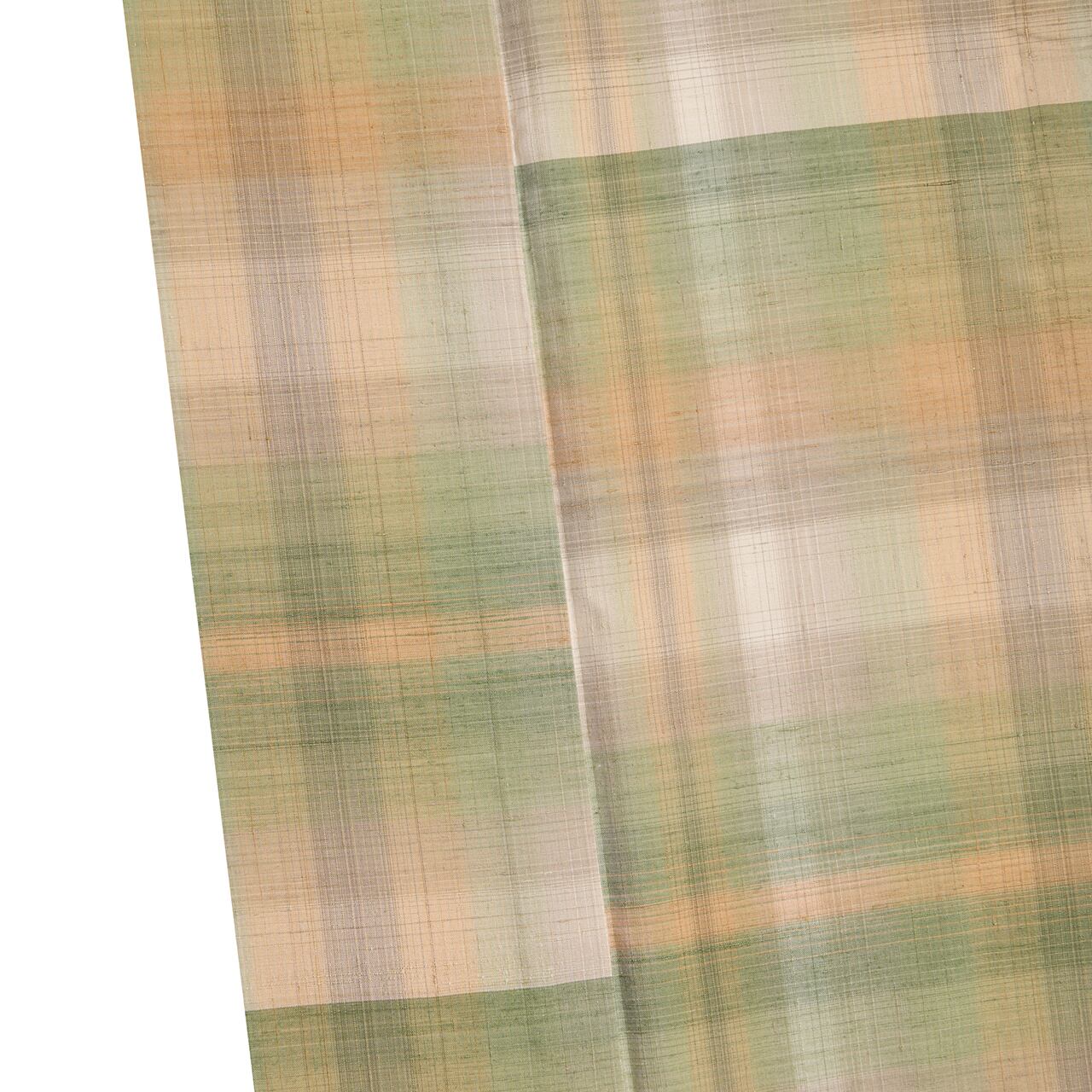 ふんわりとした手触りの良い質感の練色の地に、鶸茶色の濃い緑から淡い柳茶色の薄緑に暈された段と、洗柿色や胡桃染色、茶鼠色などのいろいろな色の糸で変り格子の模様が織り出された、とてもお洒落な紬の単衣のお着物です。